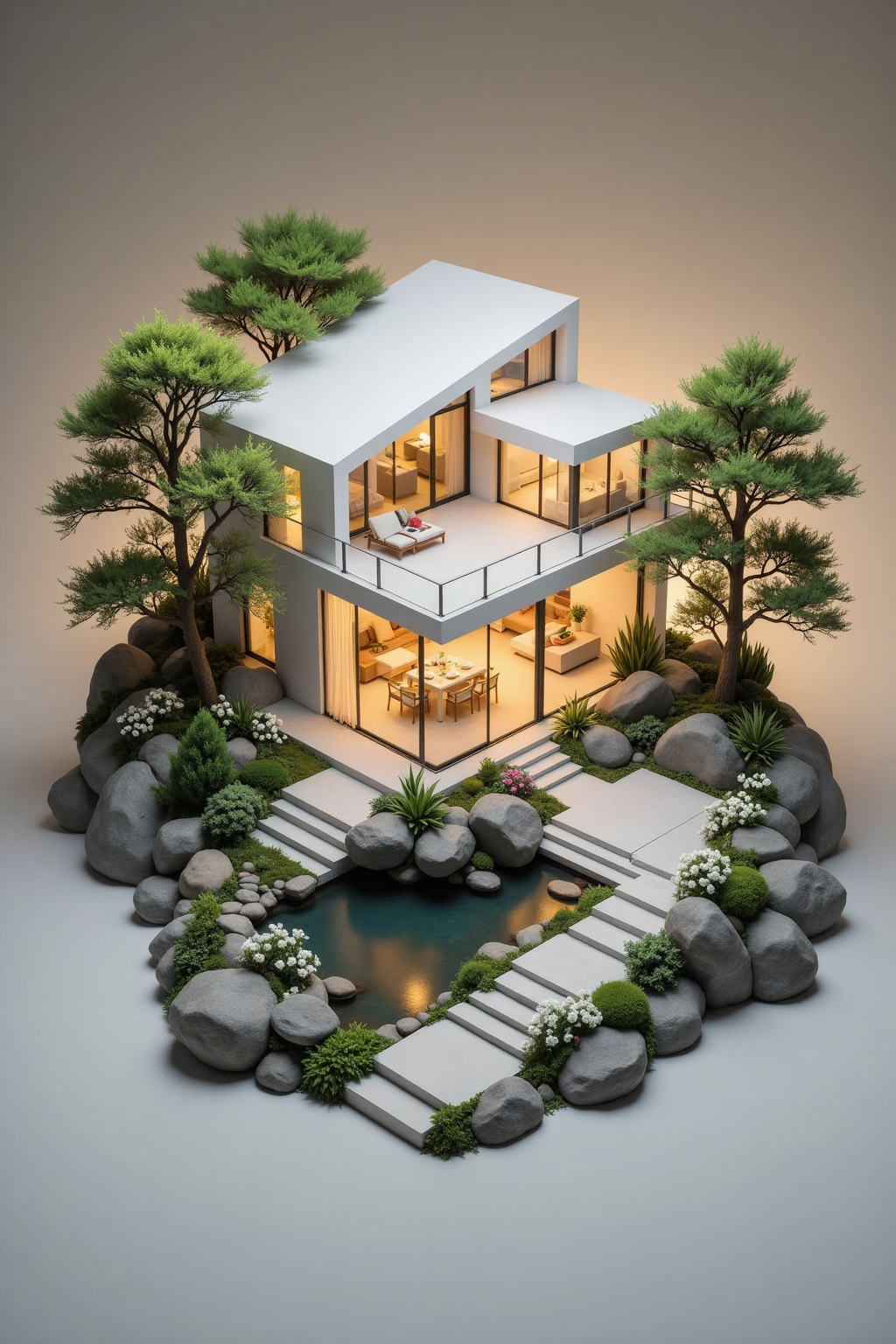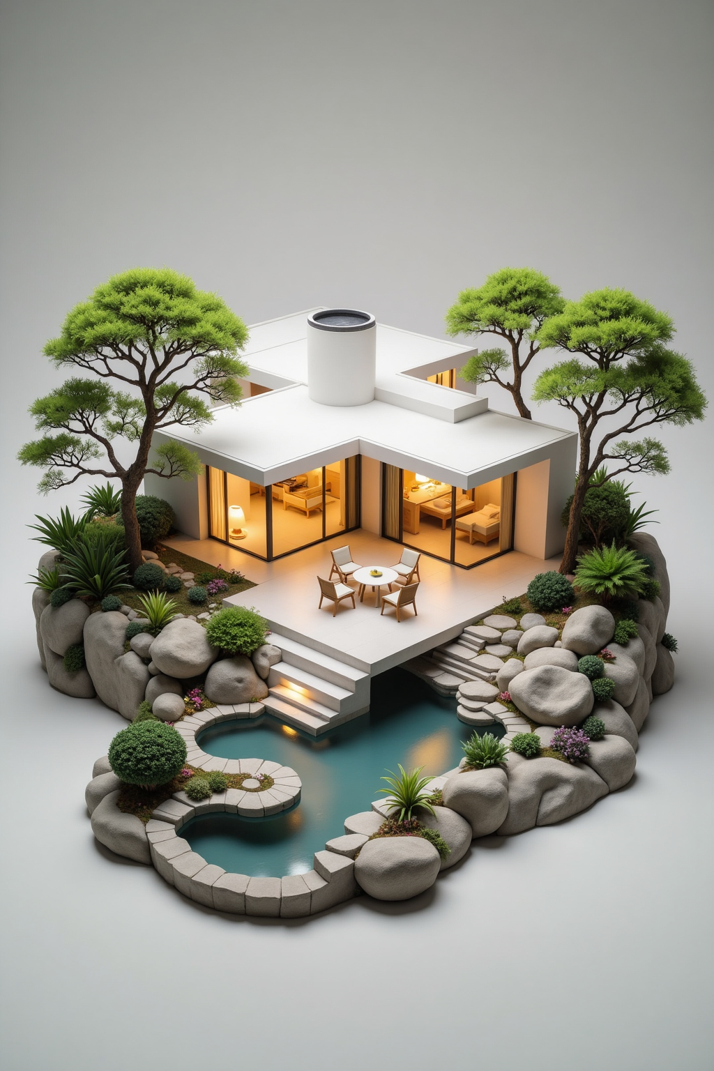 Miniature architectural models with landscaping, futuristic single - floor home, circular water features, lush bonsai, ambient lamps, minimalistic design.