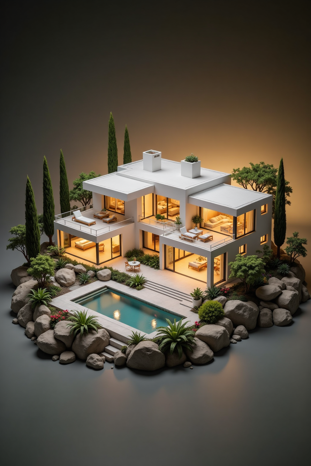 Miniature architectural models with landscaping, contemporary mansion, terrace garden, tall cypresses, pool reflections, warm ambient light.