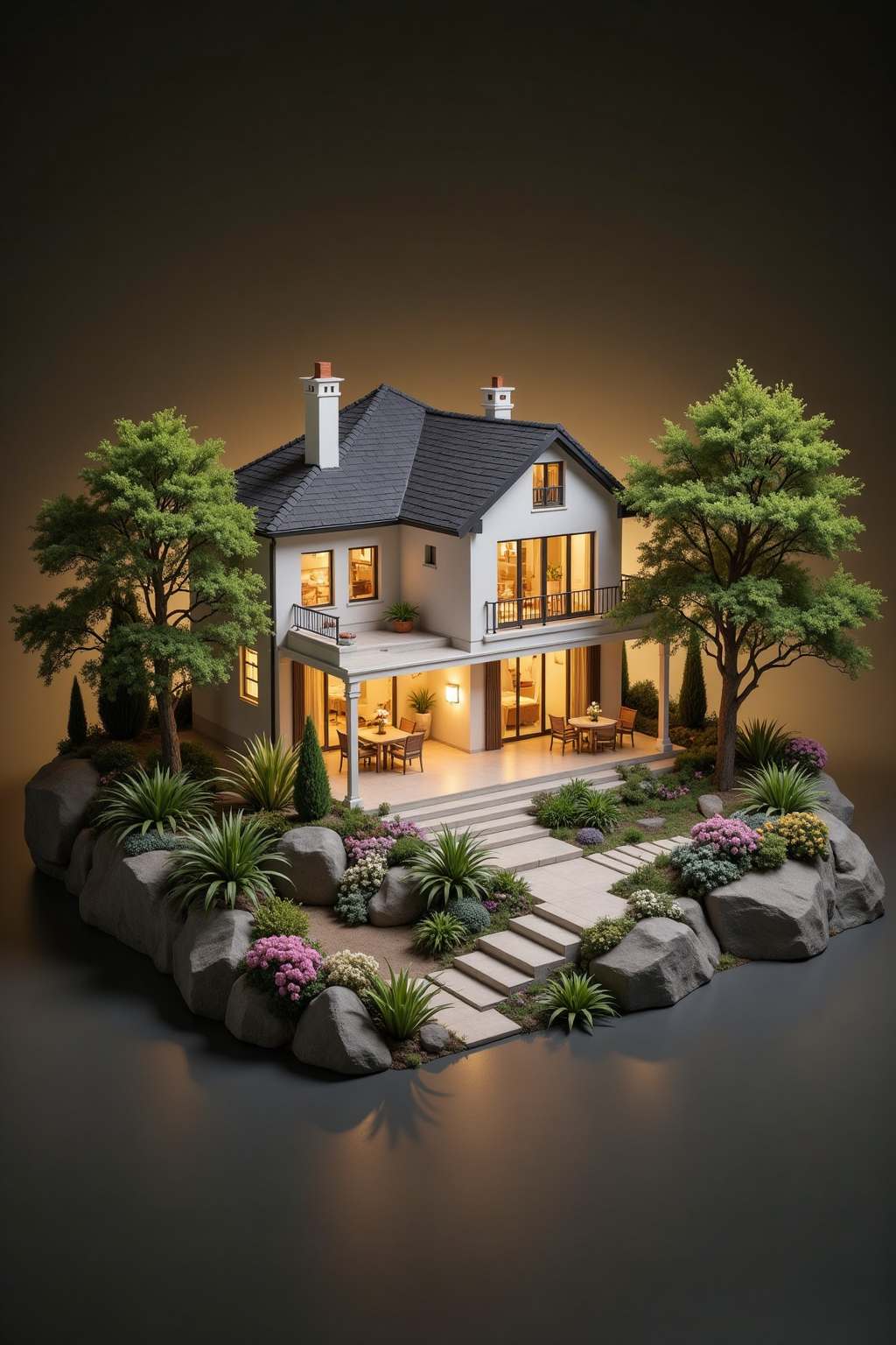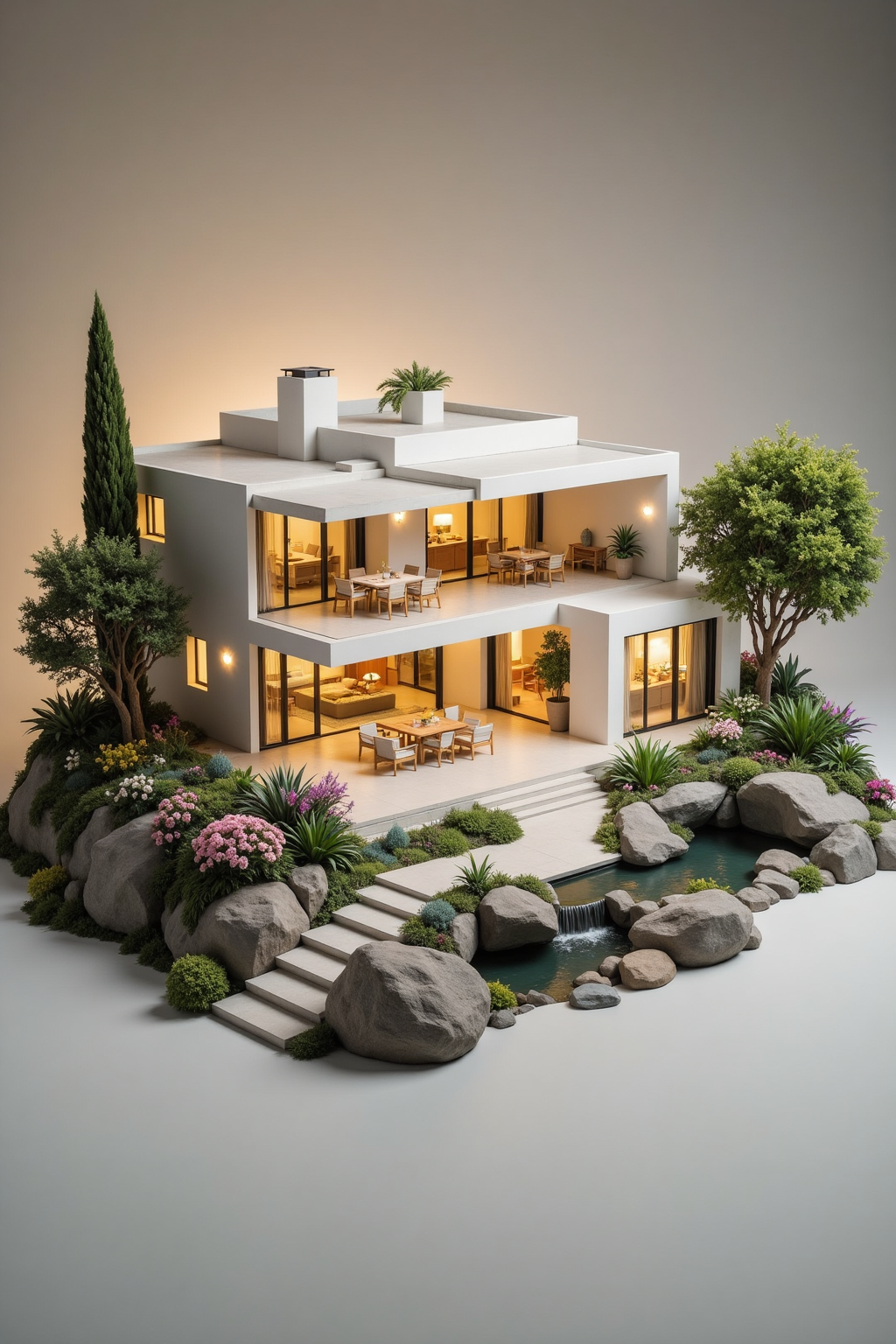 Miniature architectural models with landscaping, open - concept villa, outdoor dining, flower beds, small waterfall, soft backlighting, natural tones.