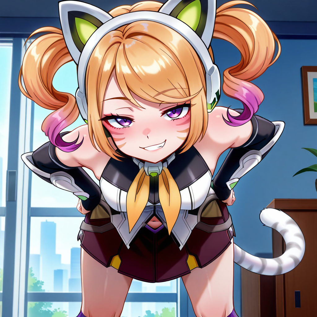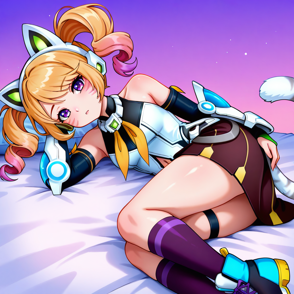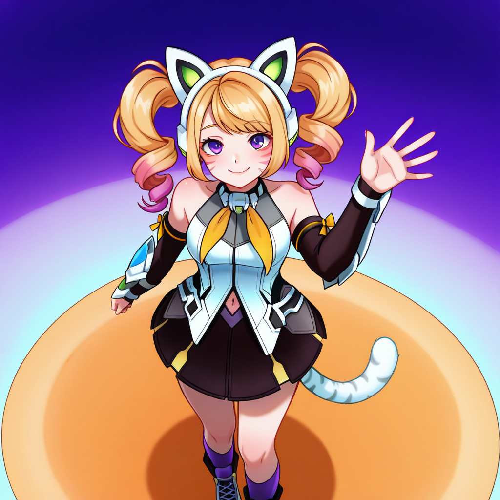 EgWanwan, 1girl, solo, facial mark, cat ear headphones, twintails, twin drills, blonde hair, multicolored hair, purple eyes, tail, sleeveless, skirt, detached sleeves, navel cutout, neckerchief