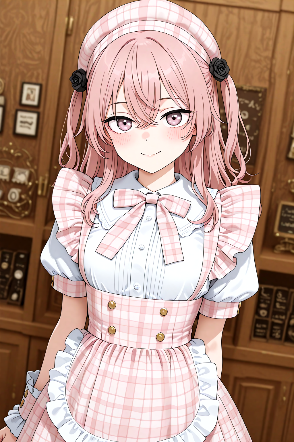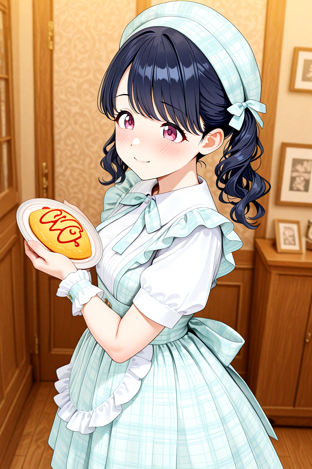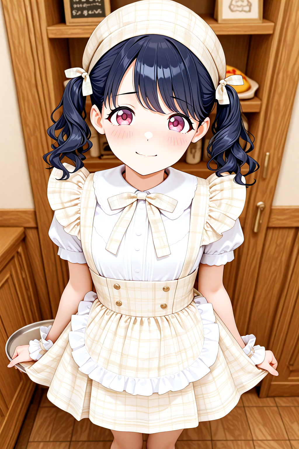 Idol_Checkered_Maid_Dress, white shirt, skirt, high-waist skirt, plaid dress, checkered clothes, gingham, plaid headwear, beret, short puffy sleeves, wrist cuffs, bow, apron, frills, bowtie, checkered ribbon, buttons
