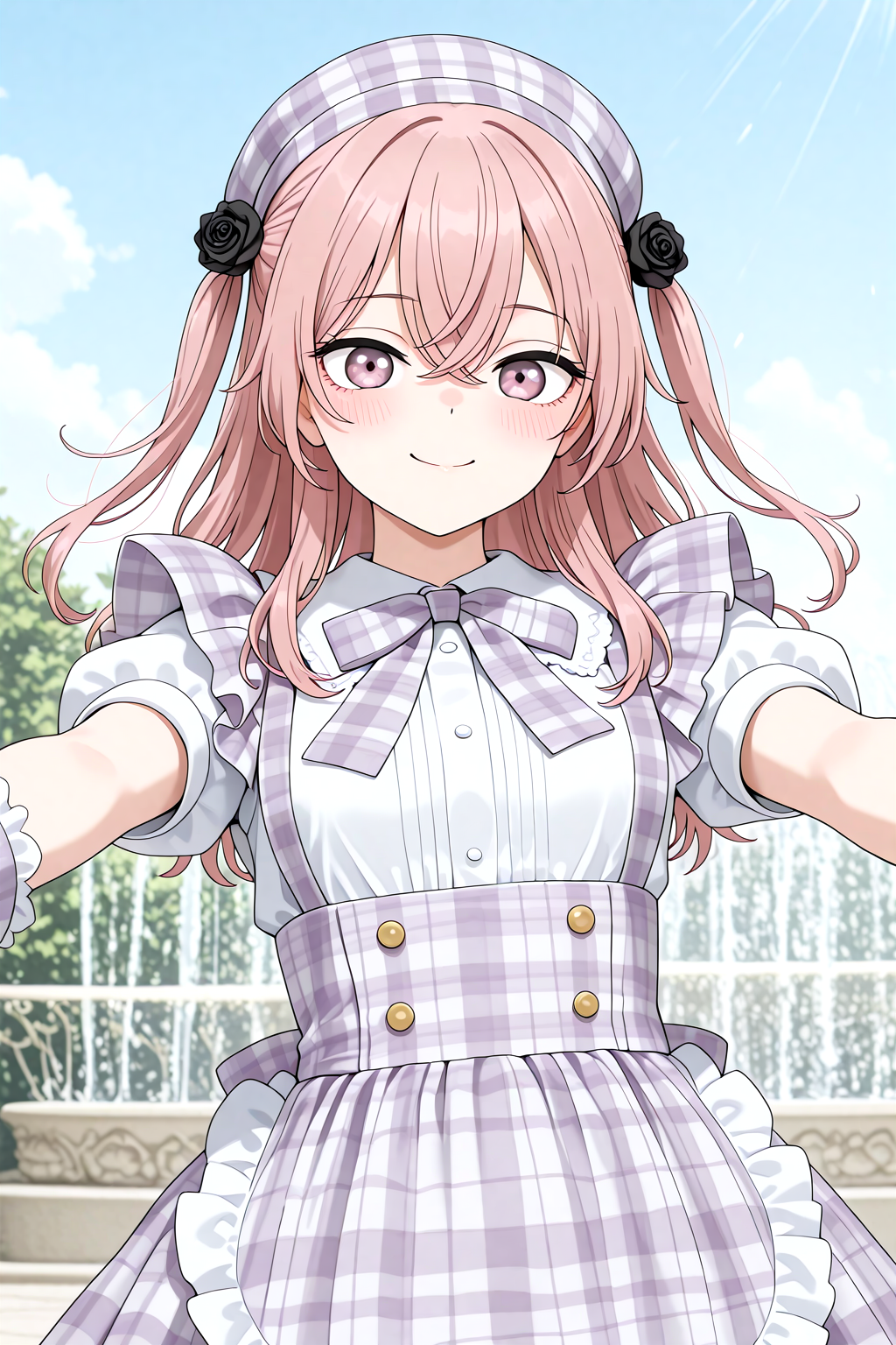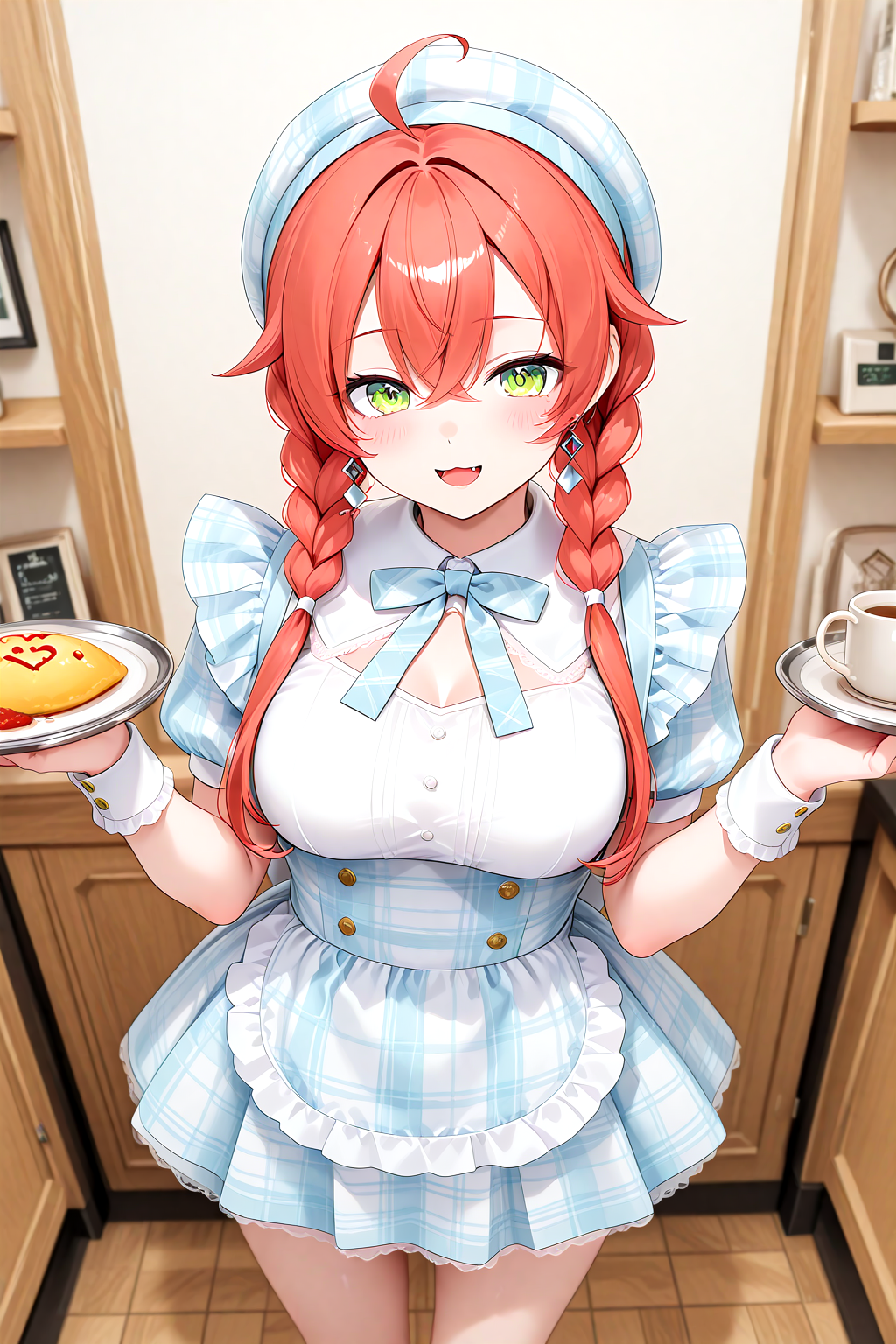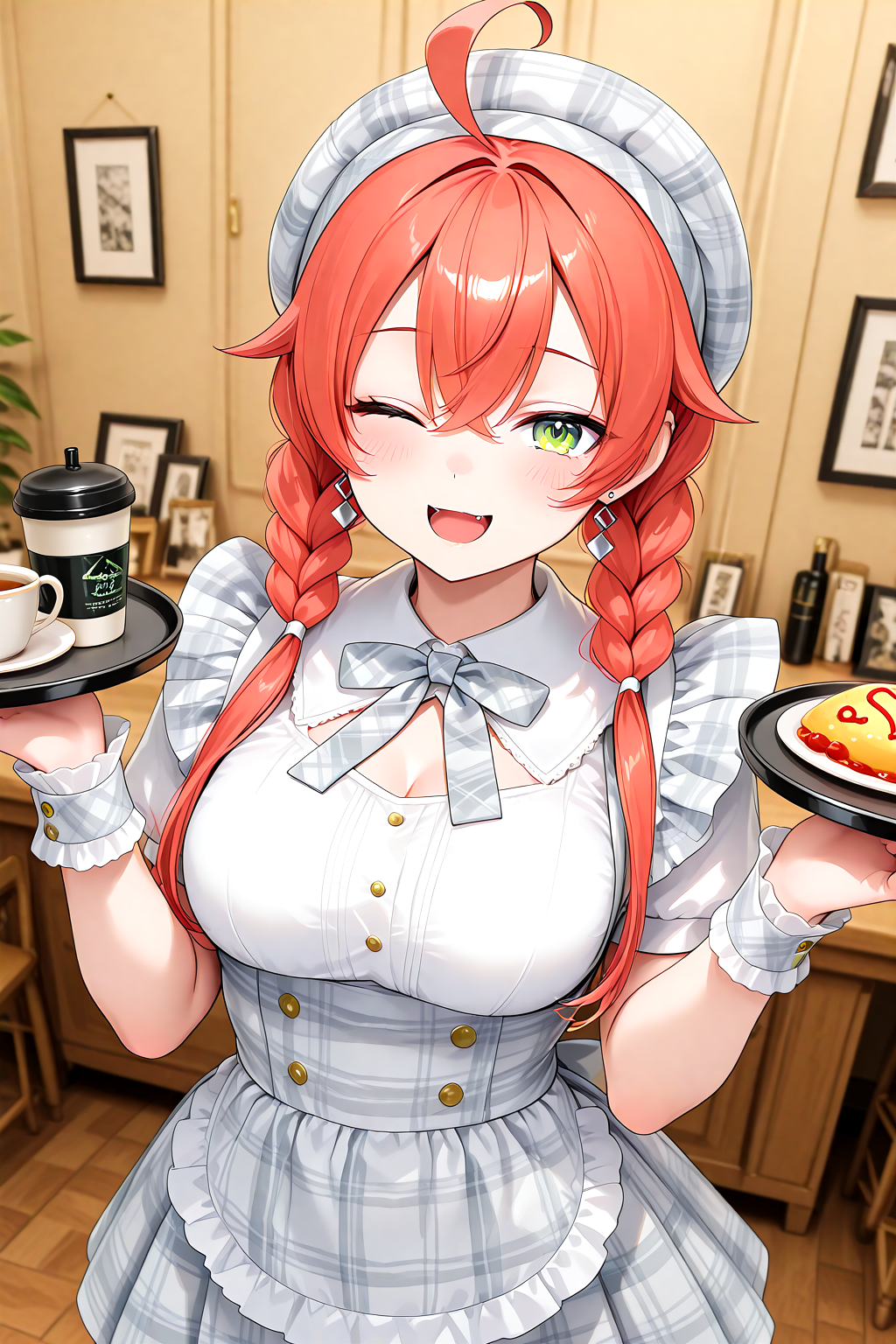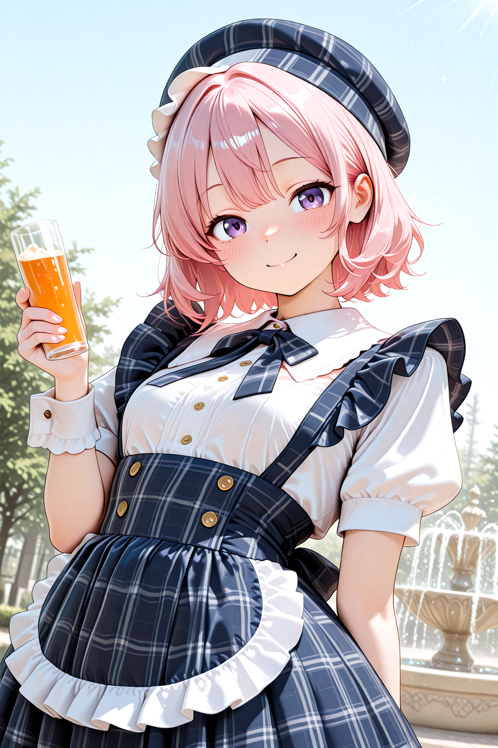 Idol_Checkered_Maid_Dress, white shirt, skirt, high-waist skirt, plaid dress, checkered clothes, gingham, plaid headwear, beret, short puffy sleeves, wrist cuffs, bow, apron, frills, bowtie, checkered ribbon, buttons