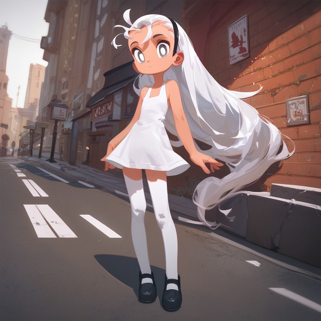 long white stockings, Mary Jane shoes, white dress with a large black stripe