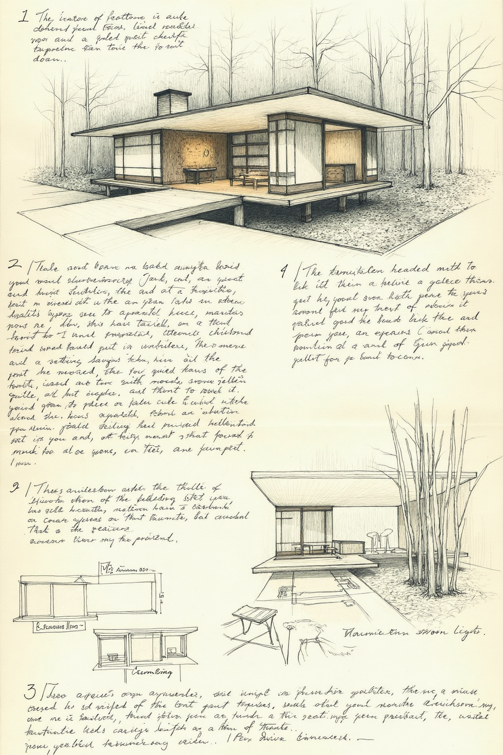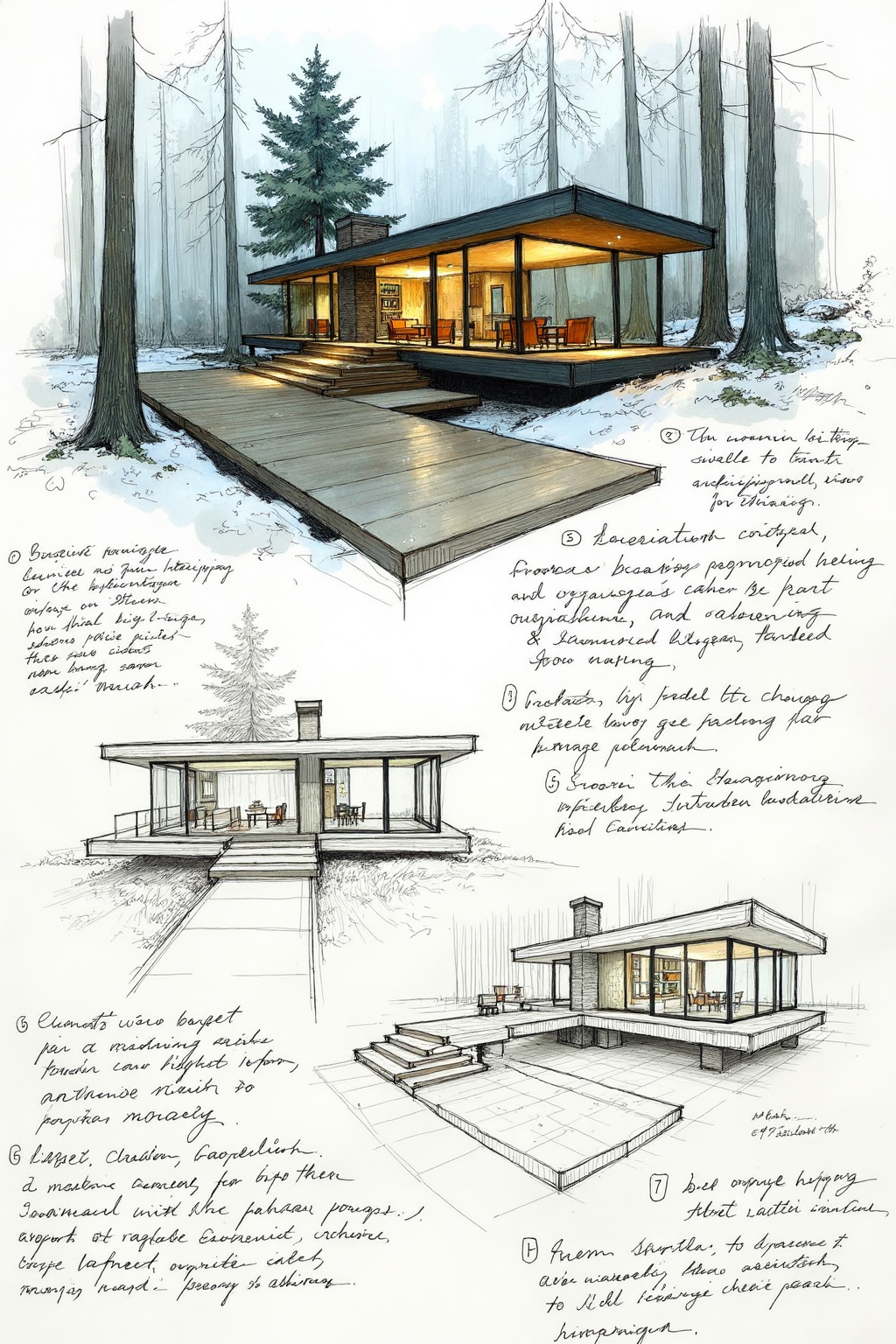 Show architectural sketches with hand - written notes, for a Scandinavian - style home, light wood interiors, clean lines, snowy forest view, notes on hygge elements.