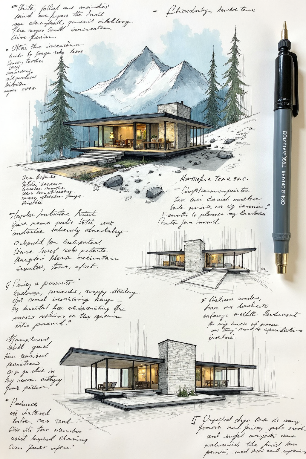 Show architectural sketches with hand - written notes, of a minimalist mountain cabin, stone and wood structure, snow - capped peaks in background, sunlight filtering in, notes on insulation.