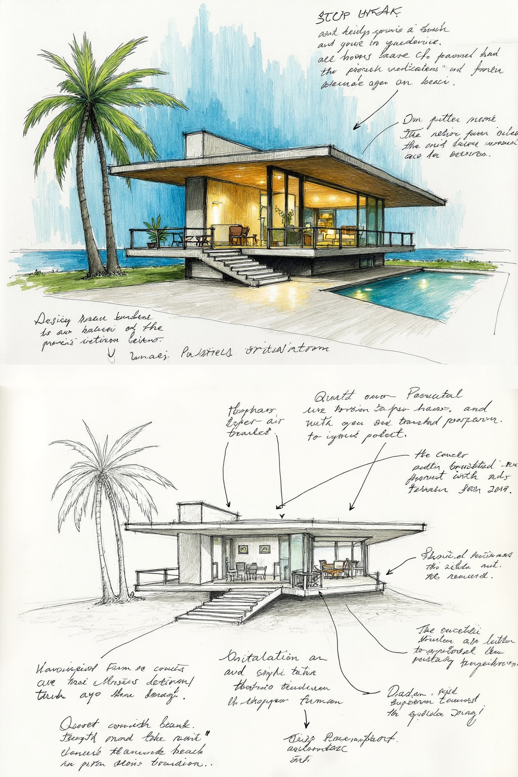 Show architectural sketches with hand - written notes, of a tropical beach bungalow, thatched roof, open - air living, palm tree shade, notes on ventilation design.