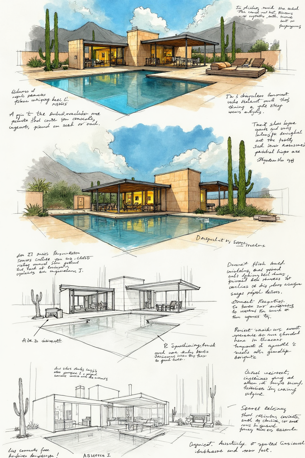 Show architectural sketches with hand - written notes, of a desert oasis resort, adobe - style buildings, pool reflecting sky, cactus garden, notes on heat - resistant designs.