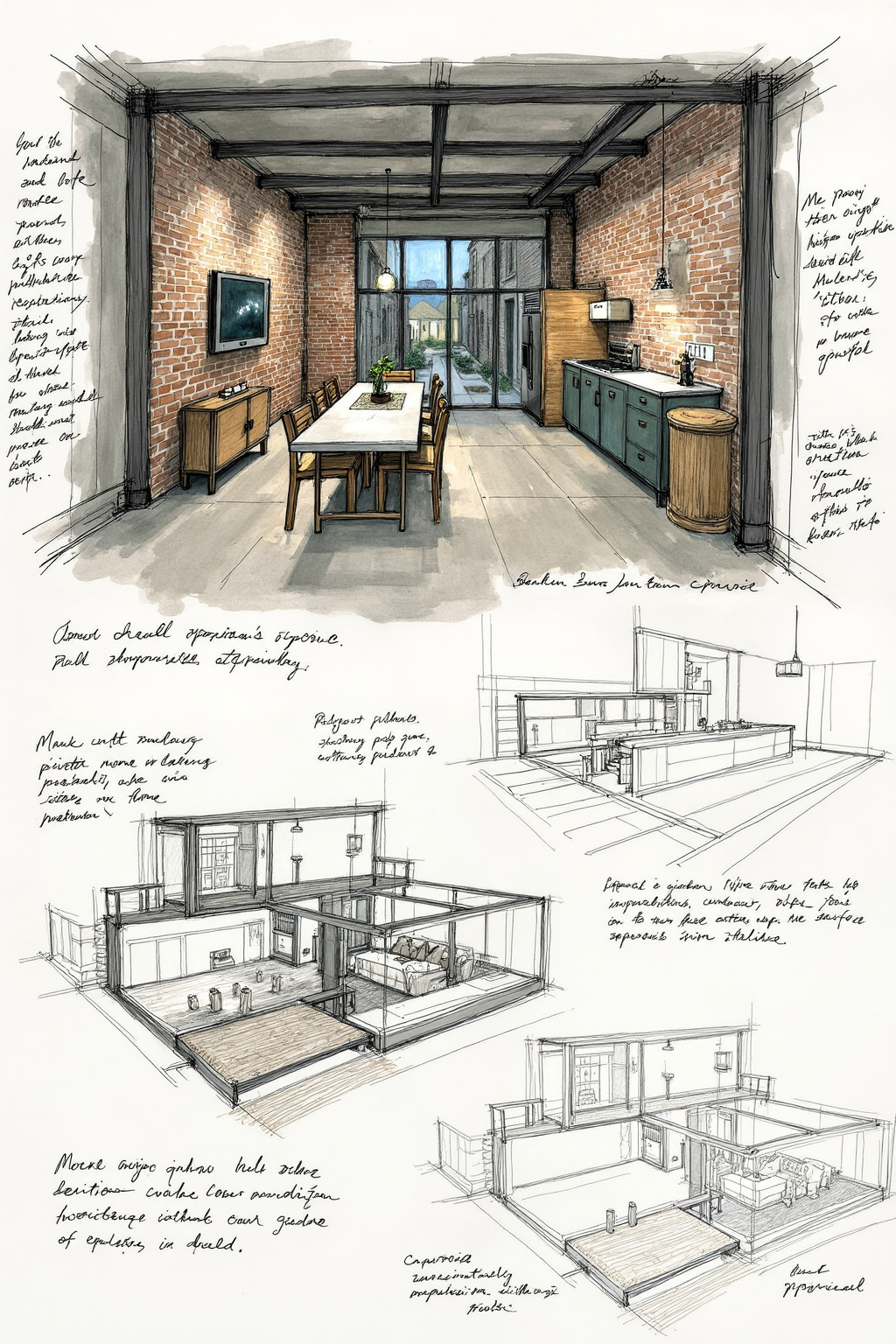 Show architectural sketches with hand - written notes, featuring an industrial loft conversion, exposed brick walls, steel beams, urban alley backdrop, notes on repurposed materials.