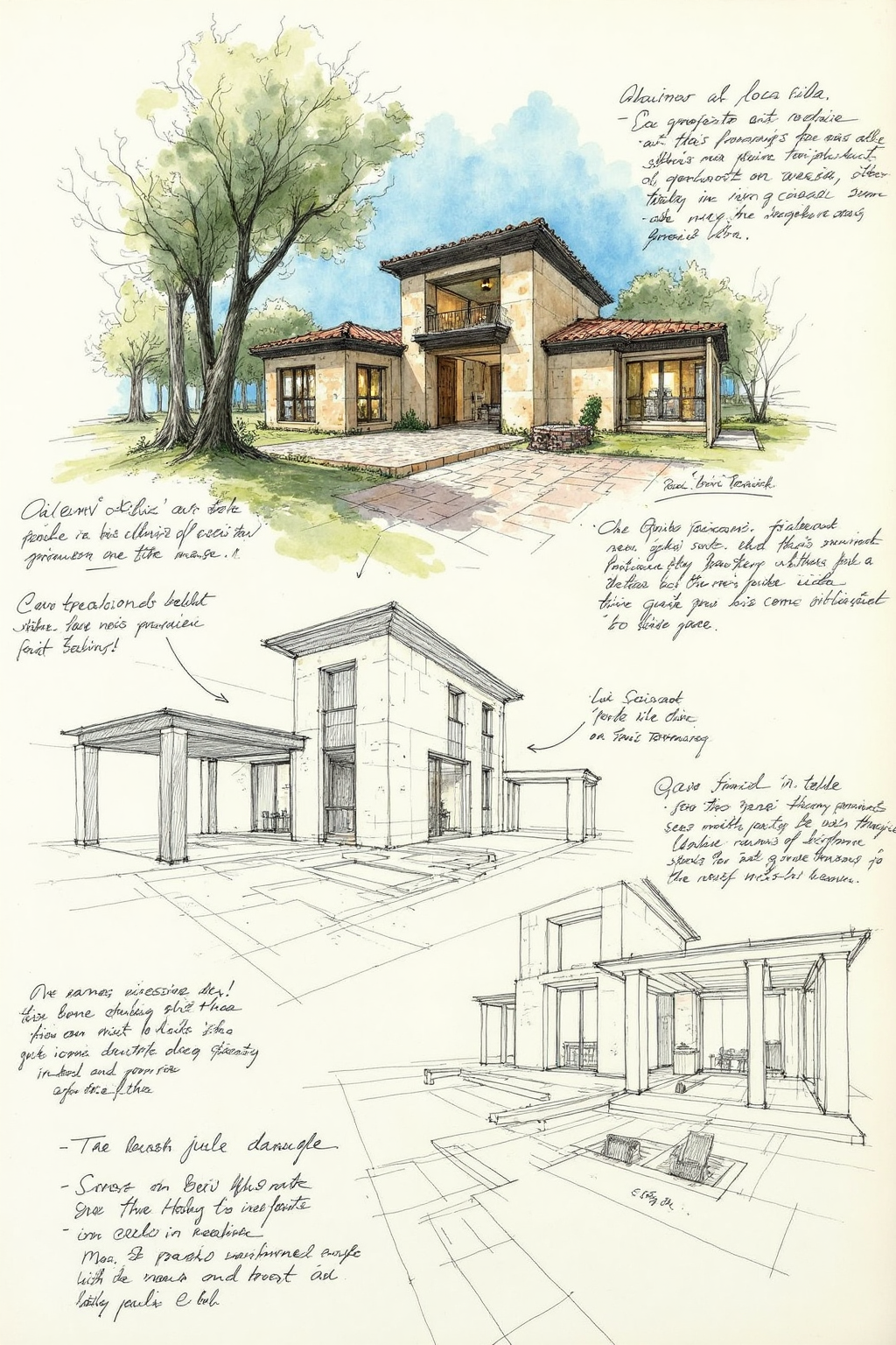 Show architectural sketches with hand - written notes, of a Mediterranean - style villa, terracotta roofs, arched windows, olive grove setting, notes on local stone usage.