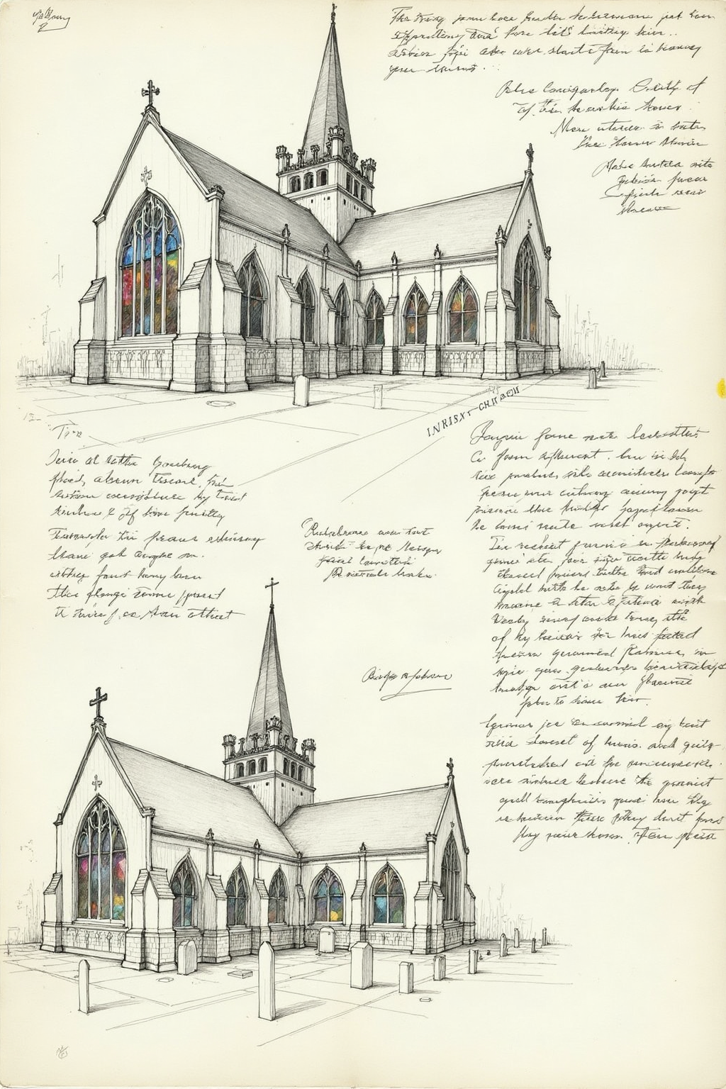 Show architectural sketches with hand - written notes, depicting a Gothic - revival church, stained - glass windows, flying buttresses, graveyard setting, notes on historical accuracy.