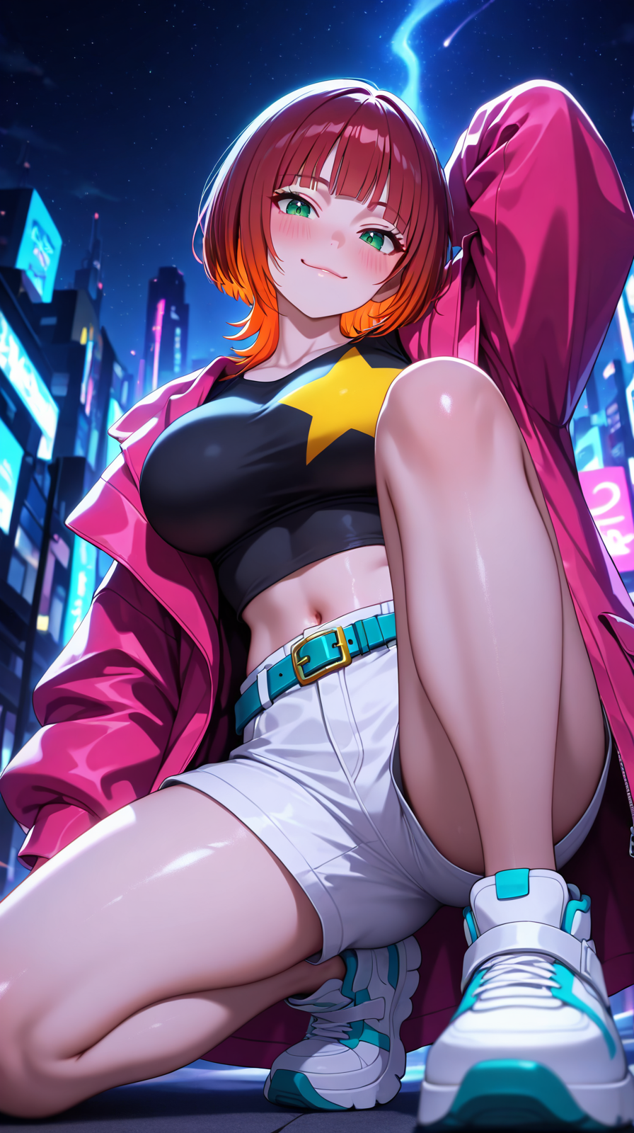 SakuyaReina, short hair, bob cut, straight hair, green eyes, dark red hair, gradient hair, orange hair tips, black crop top, gold star print shirt, strapped top, magenta jacket, oversized jacket, cyan belt, white shorts, white sneakers, cyan-accent sneakers