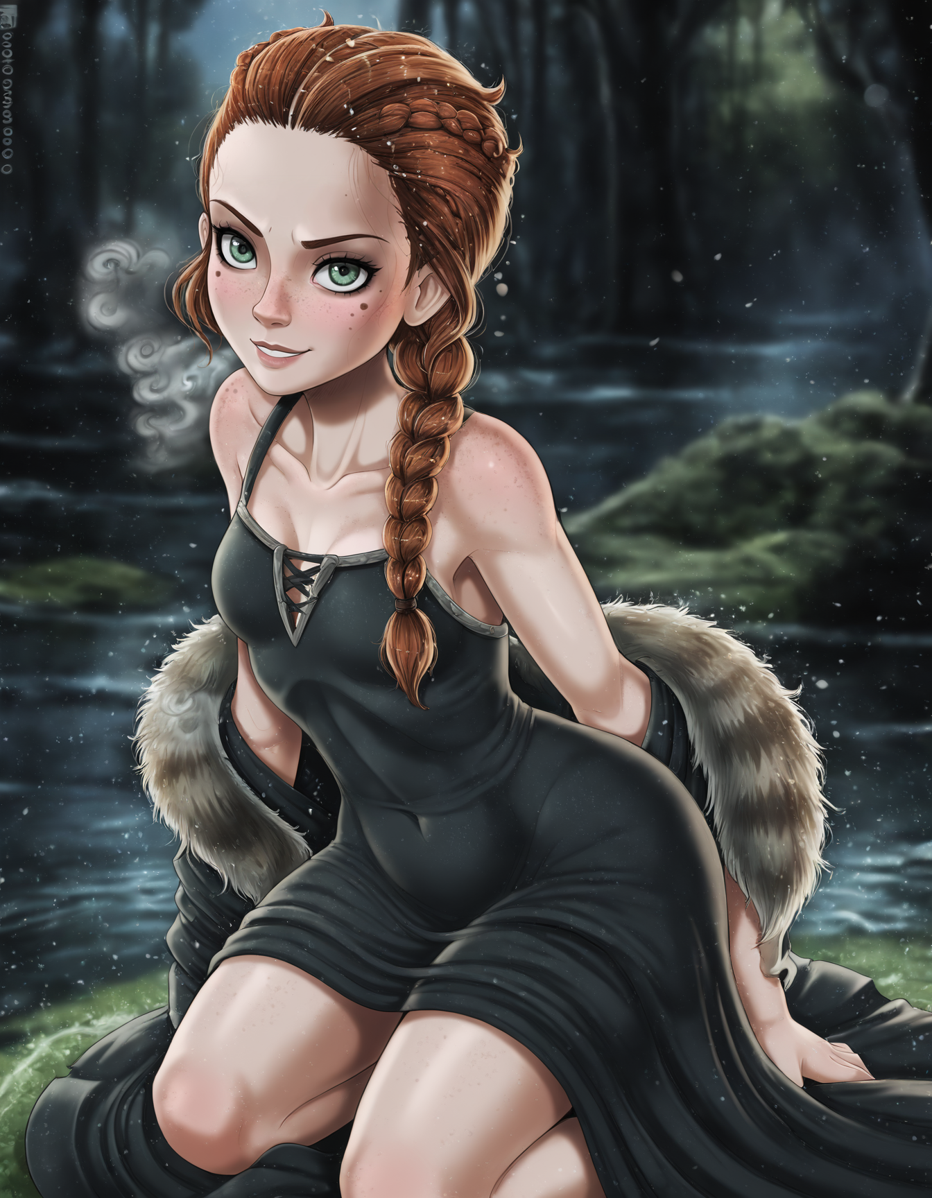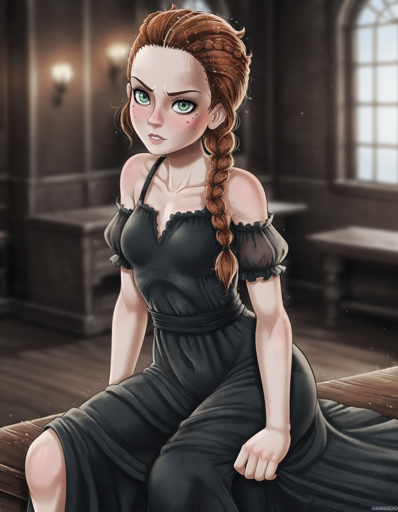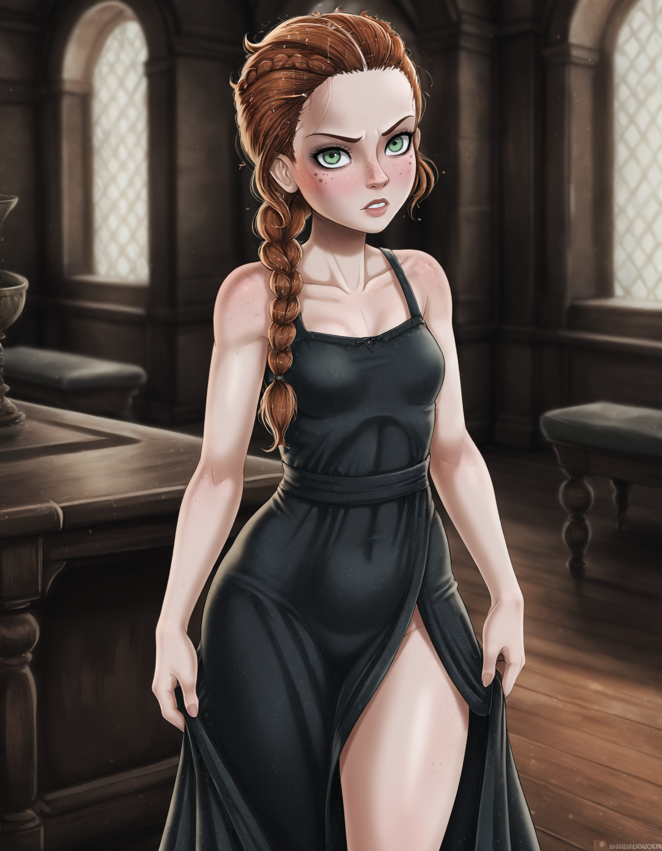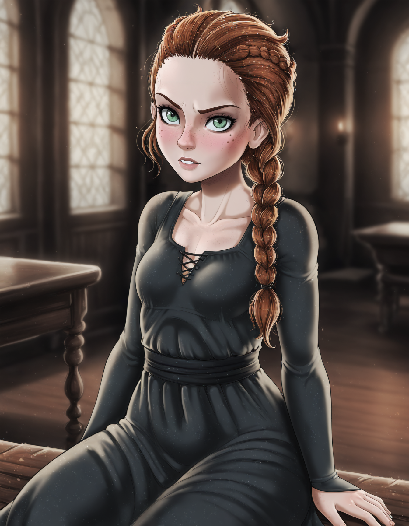 got-sansaoc,1girl, solo, freckles,single braid, braid, brown hair,green eyes,teeth,