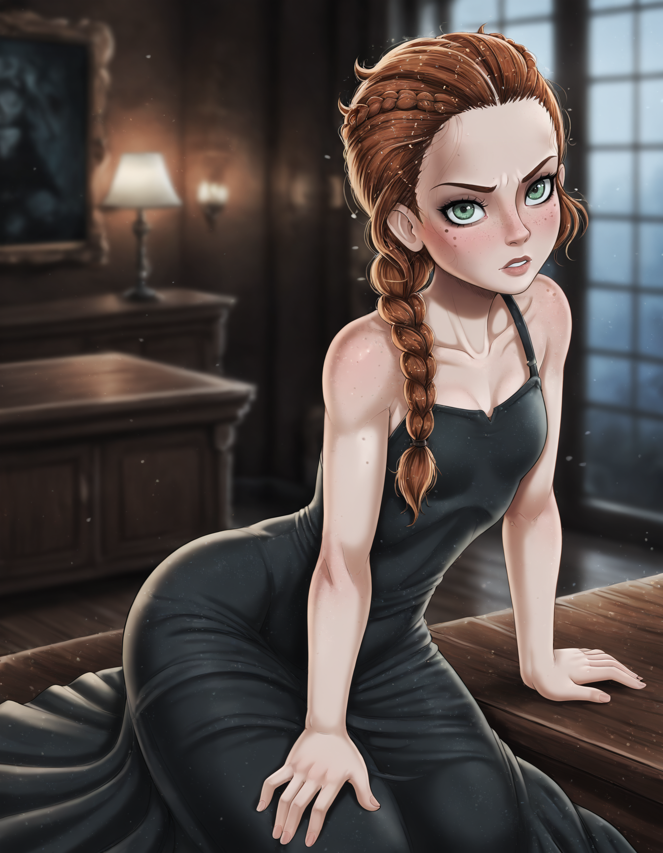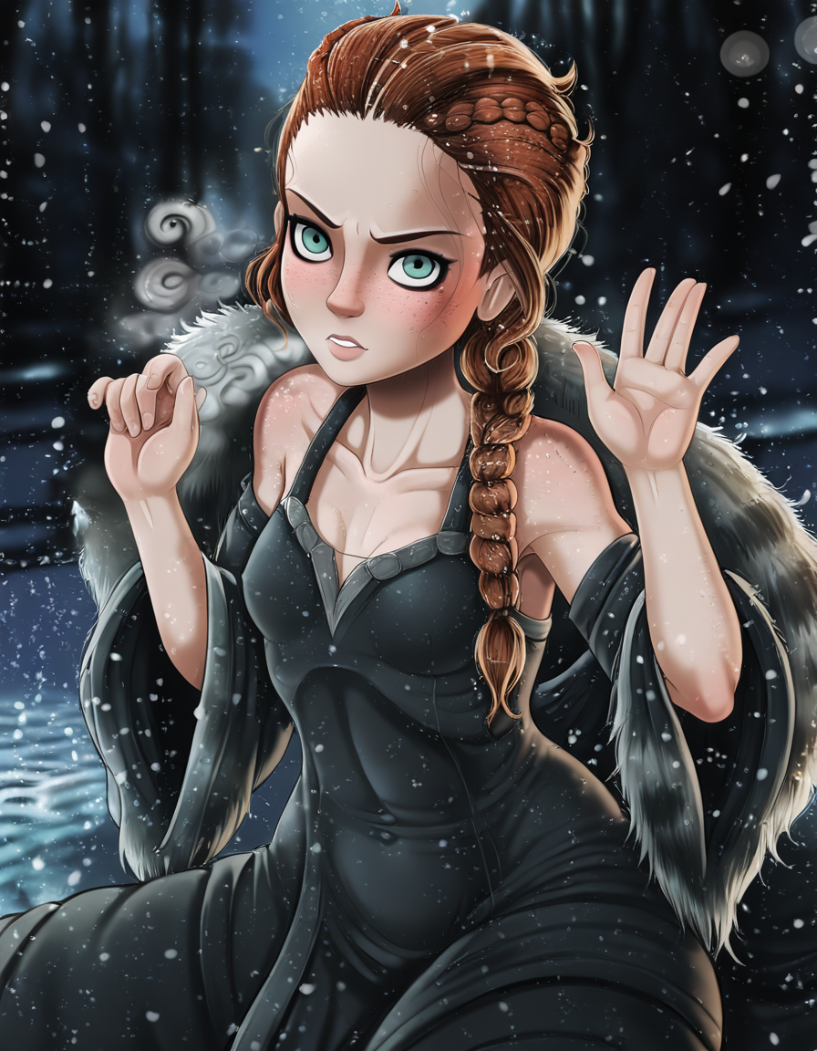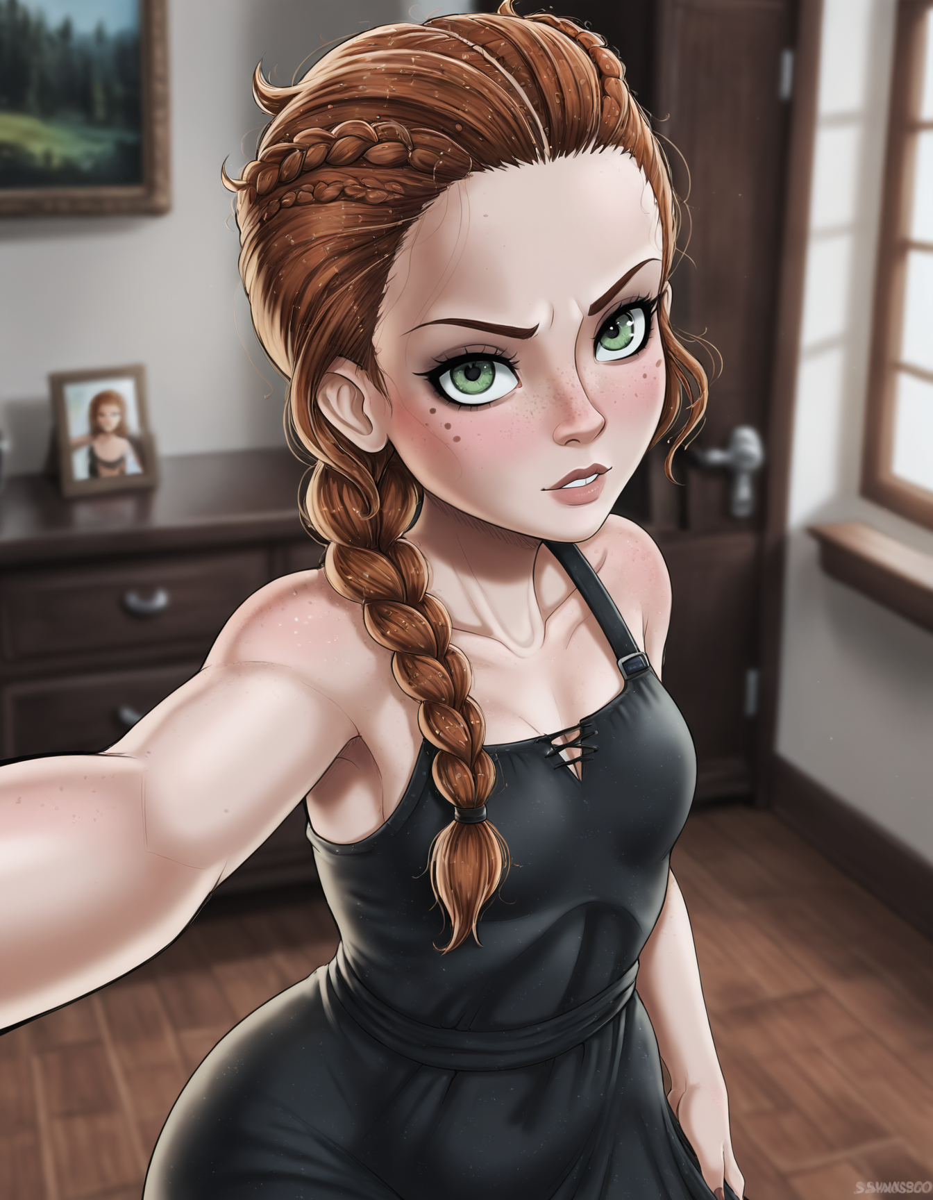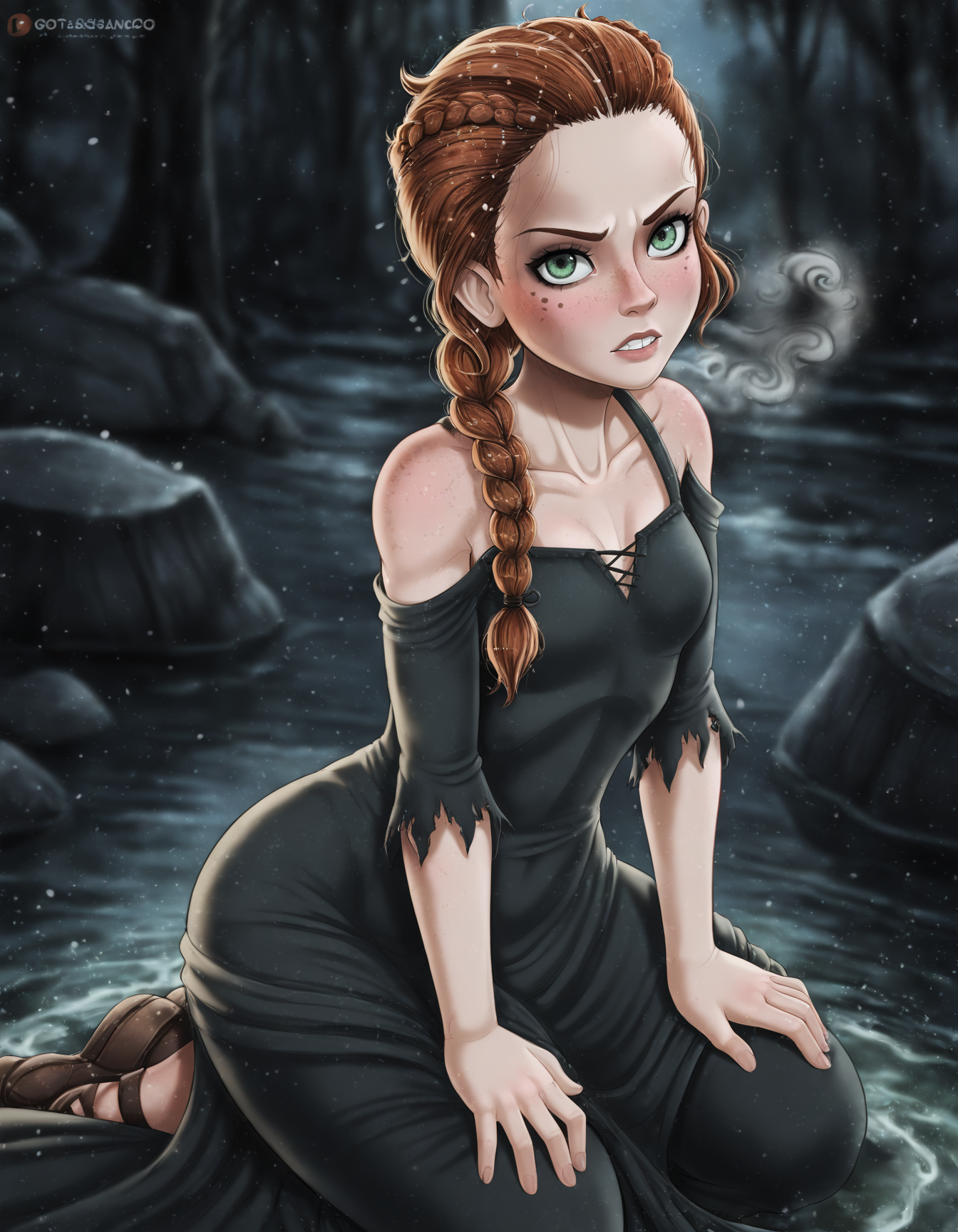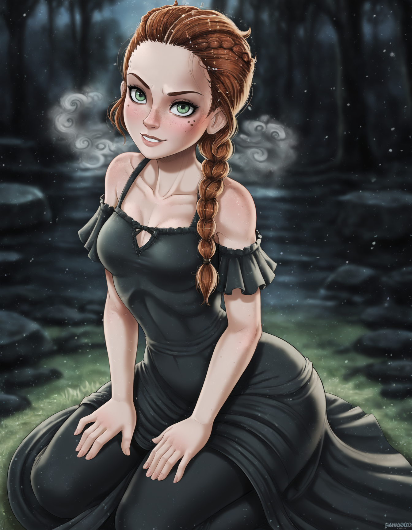 got-sansaoc,1girl, solo, freckles,single braid, braid, brown hair,green eyes,teeth,
