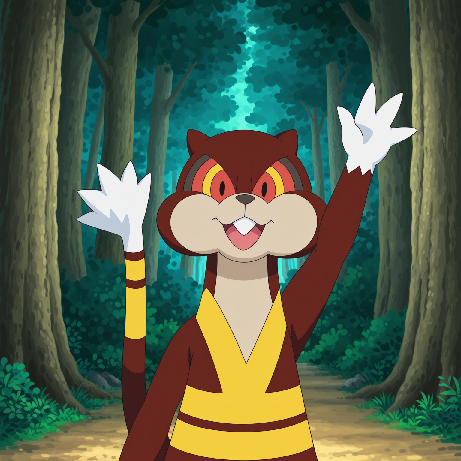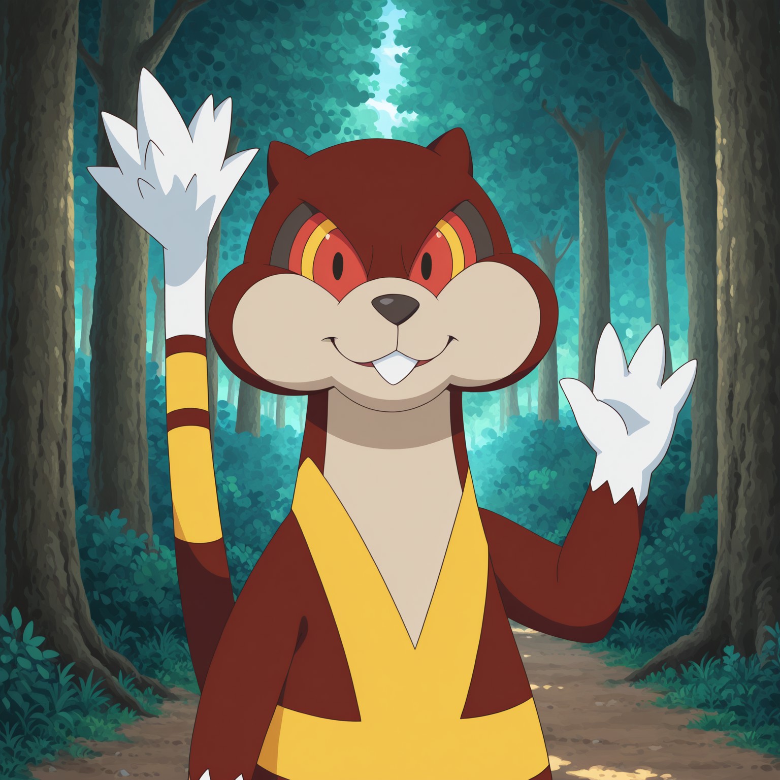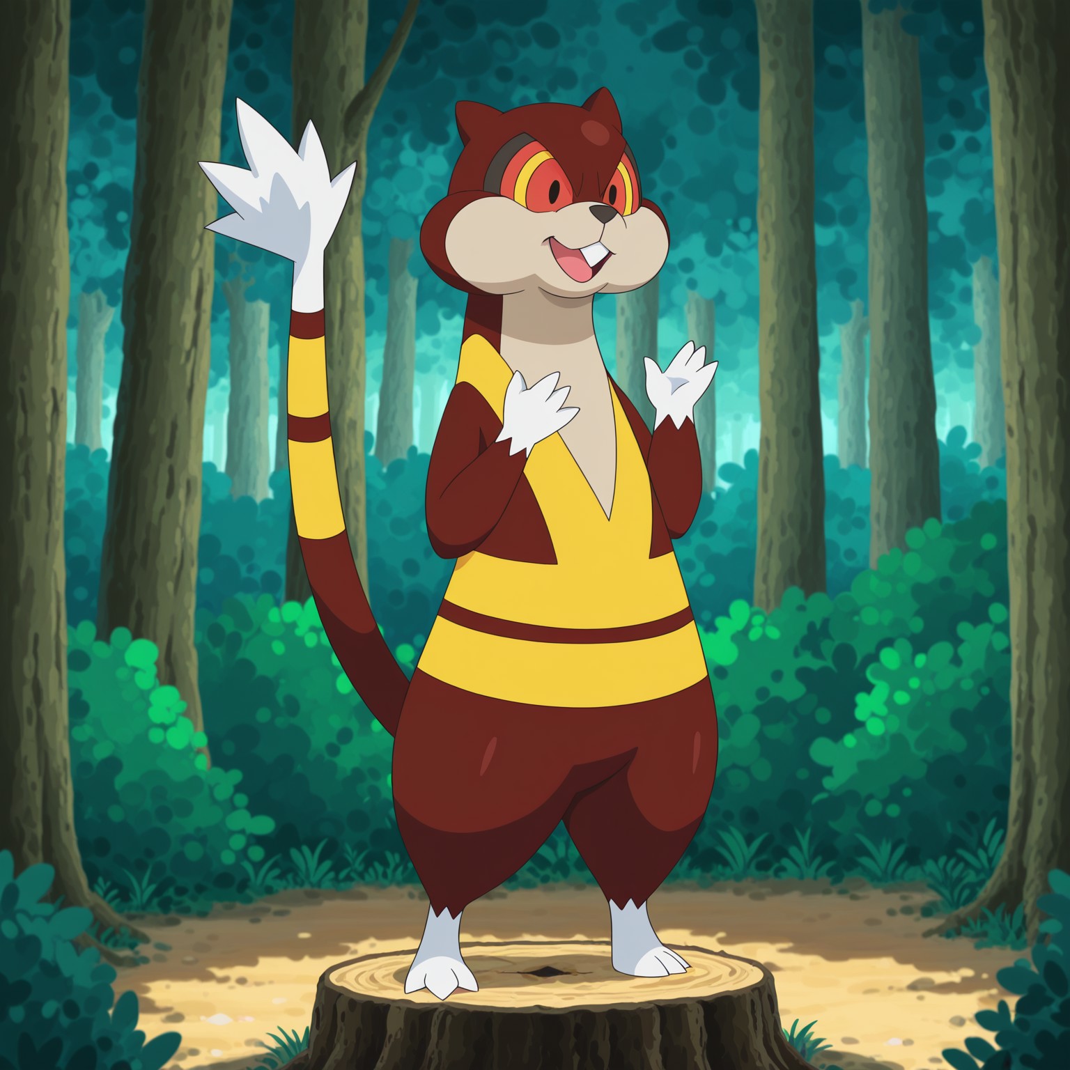 Watchog, multicolored eyes, beige cheeks and neck, mainly reddish-brown body, yellow stripe markings on their chest and tail, buck teeth, white hands and feet, pokemon (creature), tail, short feet