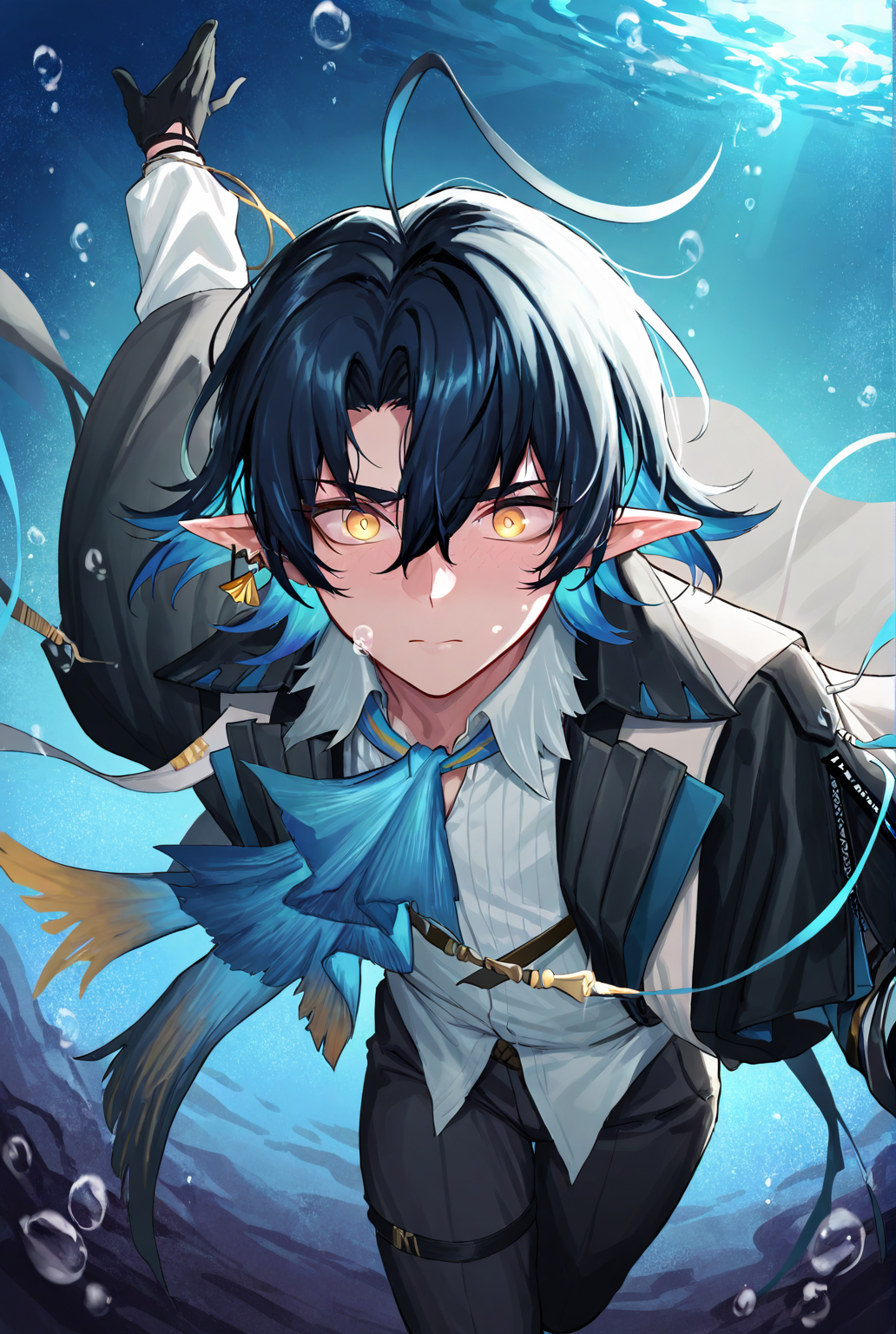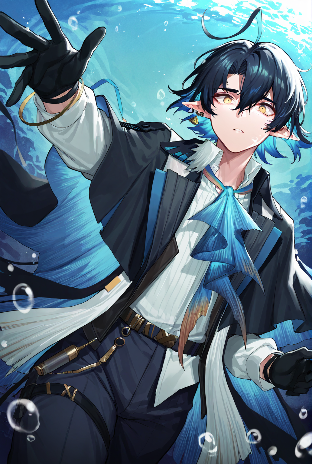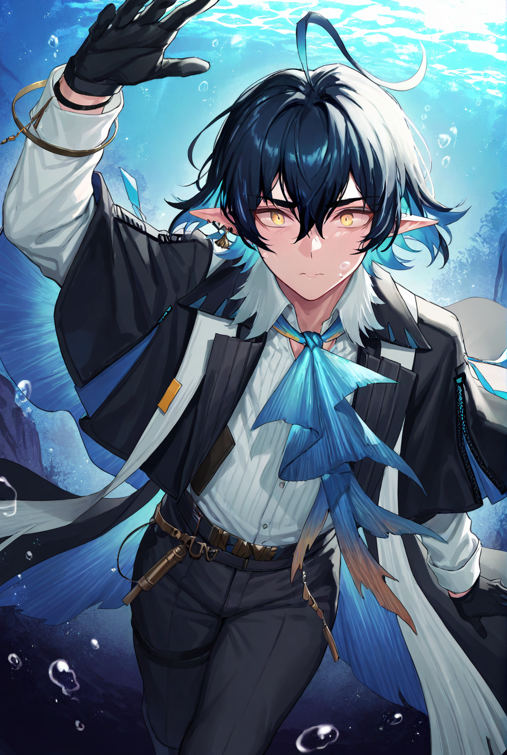 liuming arknights, short hair, blue hair, multicolored hair, black hair, ahoge, hair between eyes, pointy ears, jewelry, earrings, yellow eyes, white shirt, shirt, black shawl, ascot, blue ascot, long sleeves, black gloves, pants