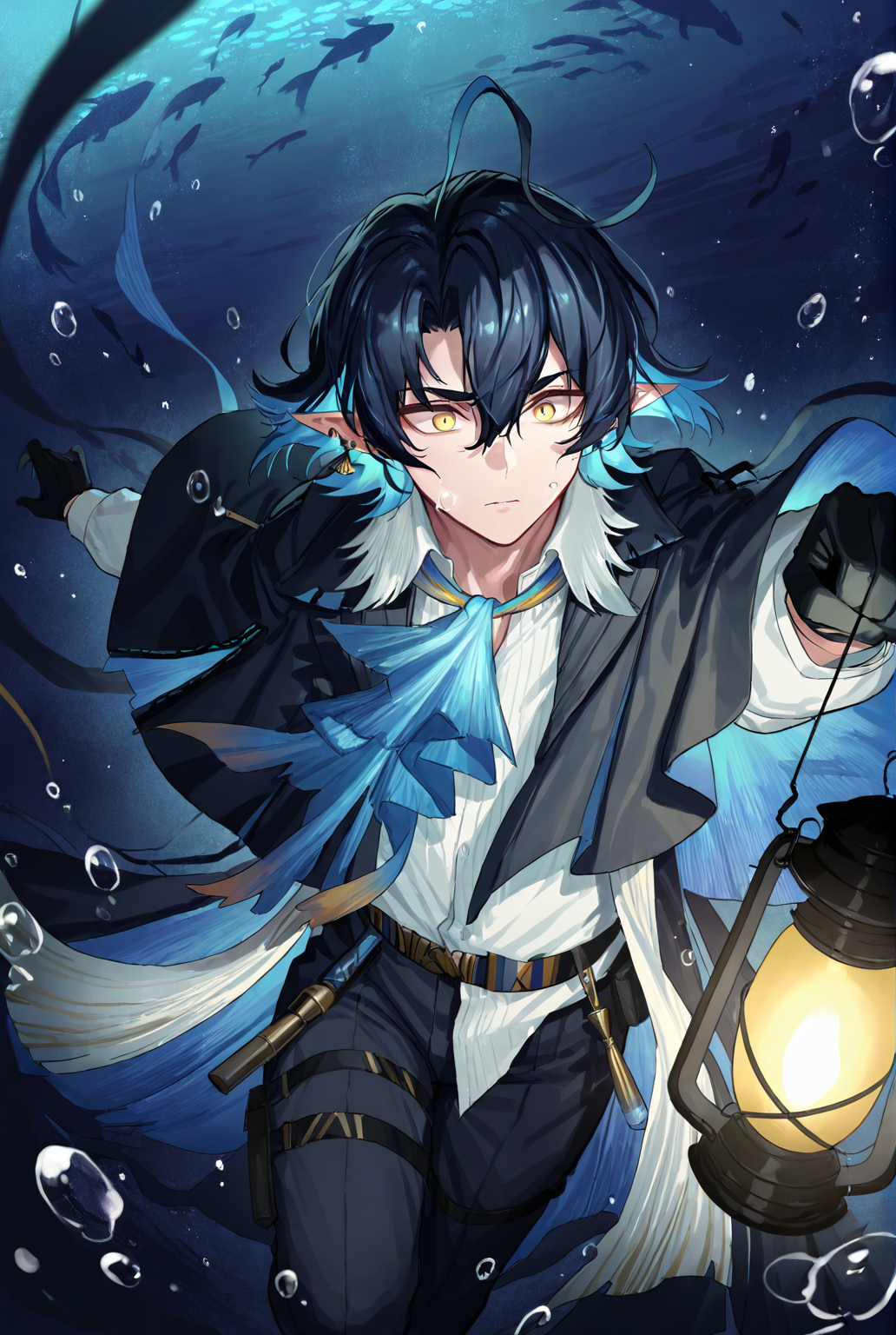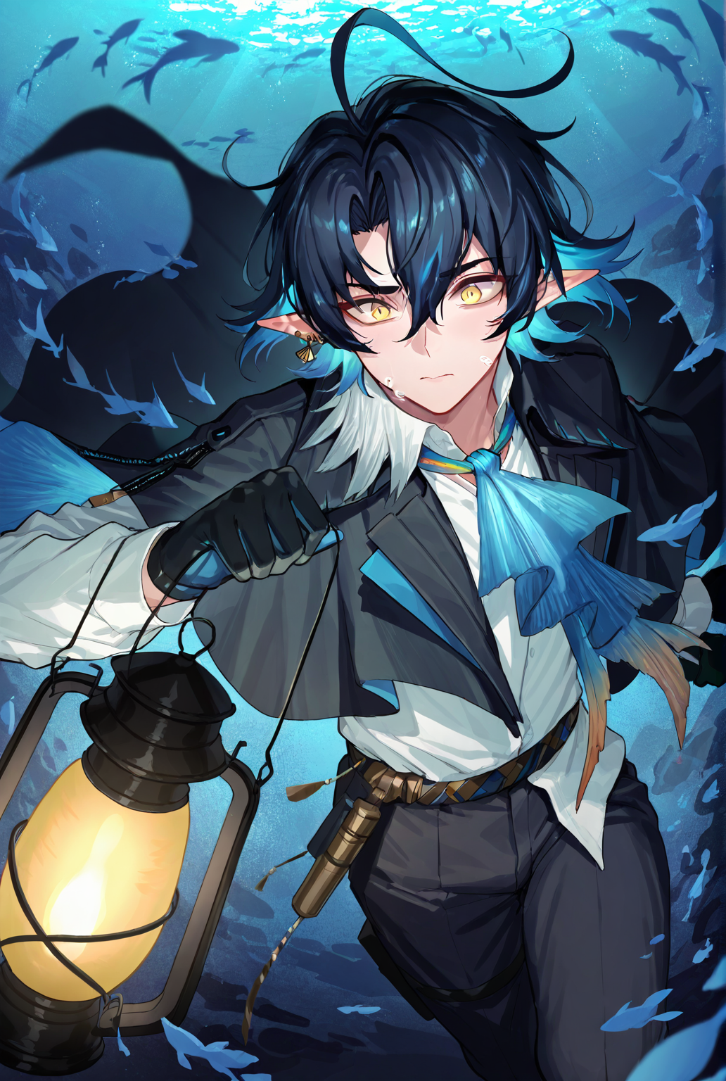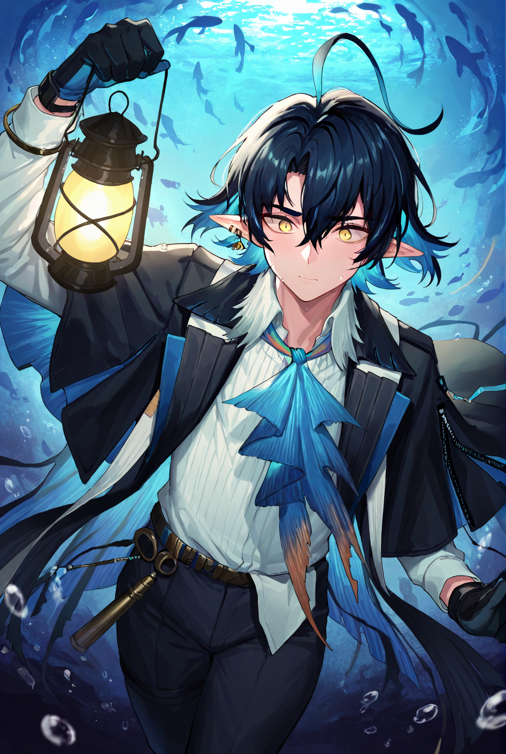 liuming arknights, short hair, blue hair, multicolored hair, black hair, ahoge, hair between eyes, pointy ears, jewelry, earrings, yellow eyes, white shirt, shirt, black shawl, ascot, blue ascot, long sleeves, black gloves, pants