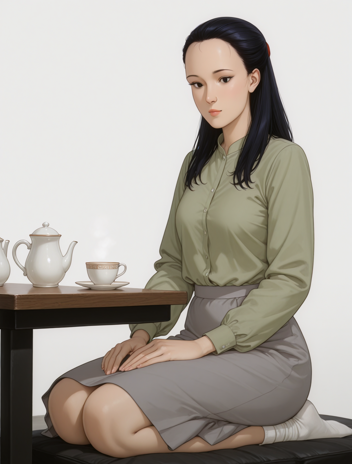 1girl, (((solo))),((cute girl)), 4zum4_m1tik0, black hair, black eyes, ((hair between eyes:1.49)),((No makeup)), green blouse, Gray skirt, Knee-length skirt, white socks, apron