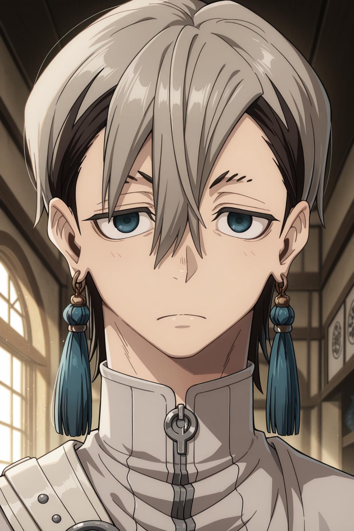 Zanka, zanka nifuji, grey hair, two-tone hair, black hair, blue eyes, hair between eyes, short hair, tassel earrings