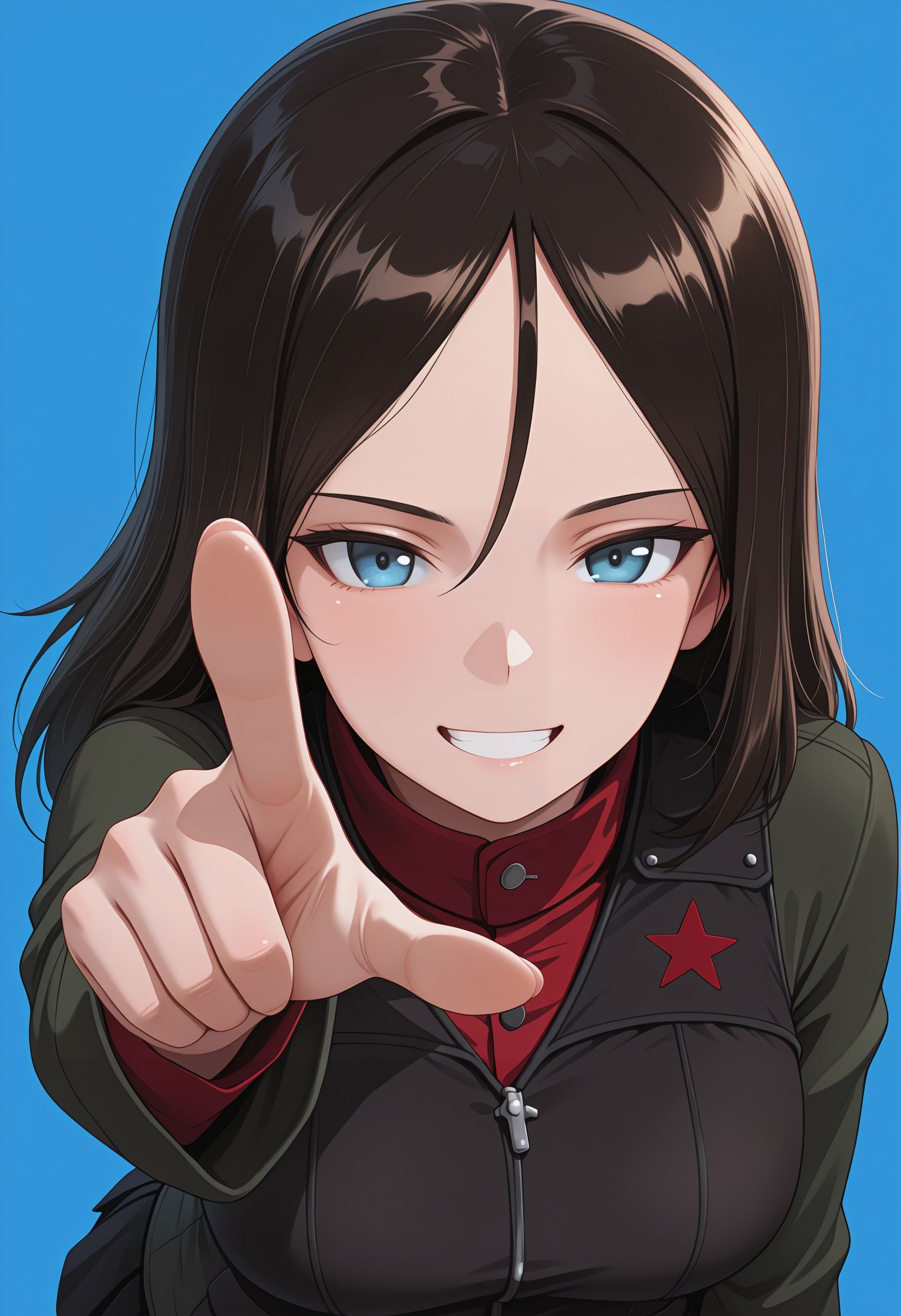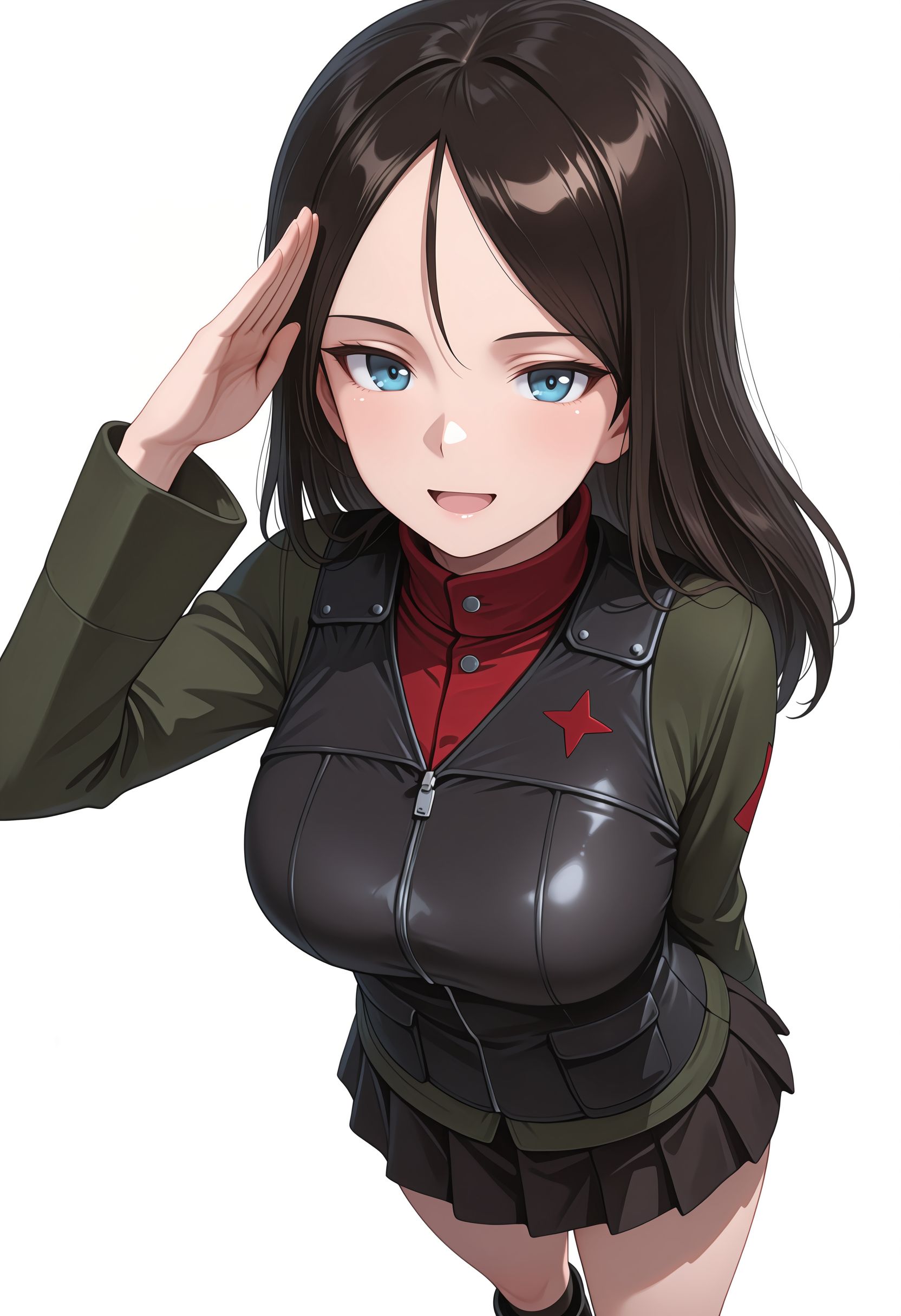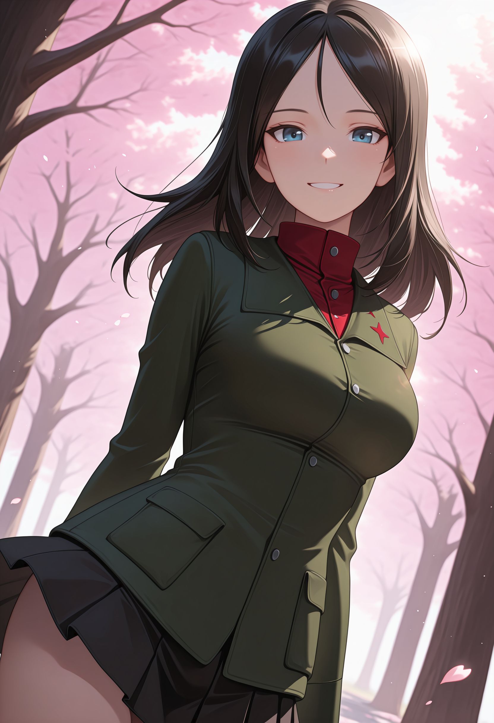 pravda military uniform, green jacket, red shirt, turtleneck, pleated skirt, miniskirt, black skirt, black black footwear,