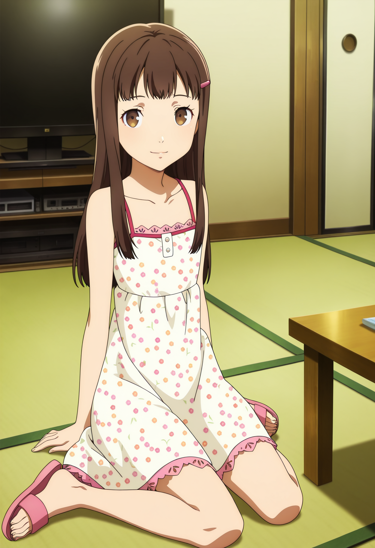 long hair, hairclip, polka dot dress, sundress, sandals,