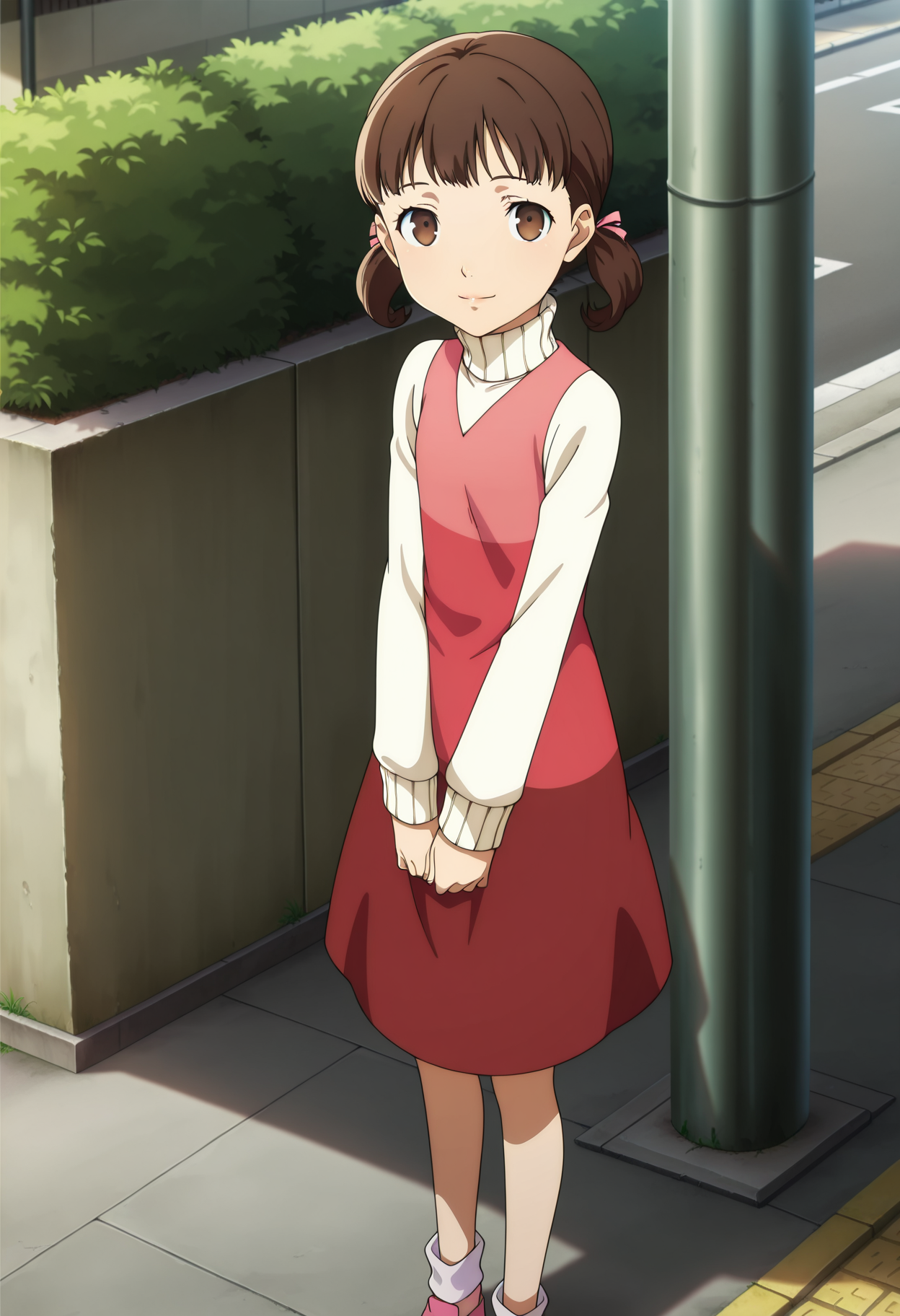 short twintails, hair ribbon, turtleneck sweater, pinafore dress, white socks, pink footwear,