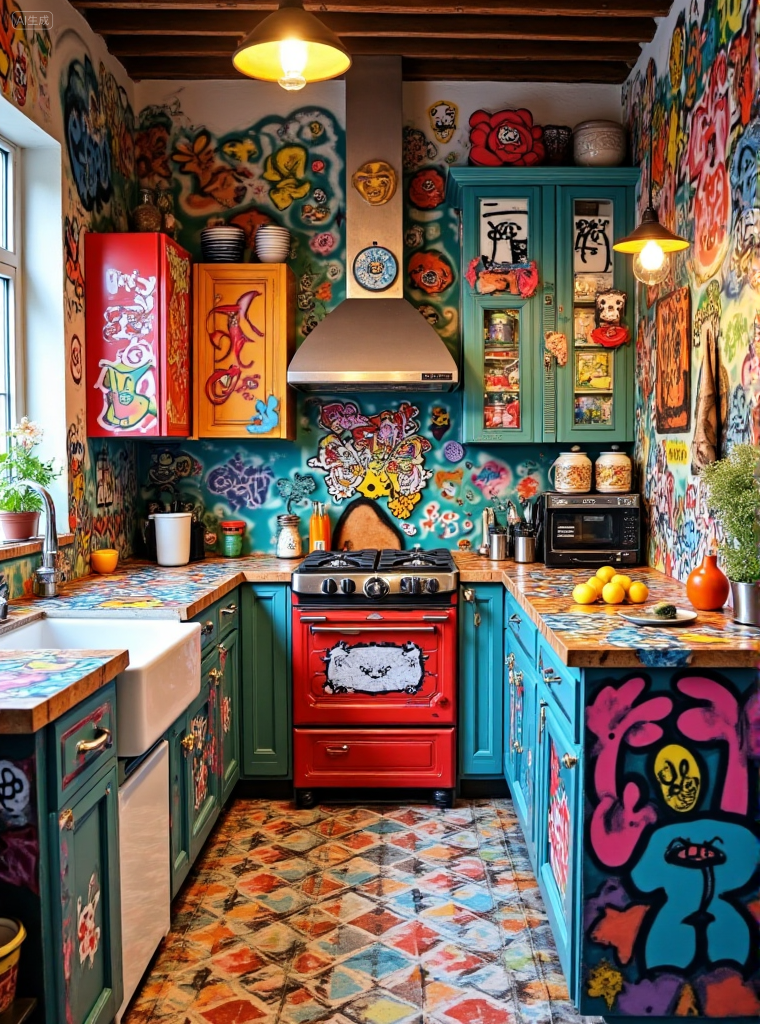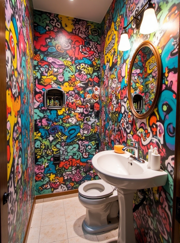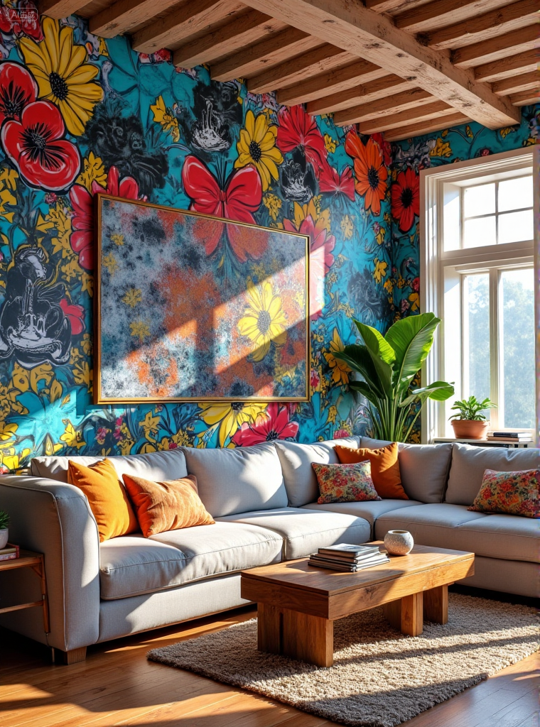 Graffiti-style interior decoration integrates street graffiti art into indoor spaces. It breaks the sense of regularity in traditional decoration, often using bold and bright colors (such as bright orange, sapphire blue, and neon green), with abstract patterns, exaggerated lines, or trendy symbols as elements. These elements can be seen in wall paintings, graffiti on furniture, decorative paintings, and other carriers. The overall style is full of vitality and personality, creating a free and avant-garde atmosphere. It is suitable for residents who pursue uniqueness and love trendy culture, endowing the space with both artistic charm and a sense of life.