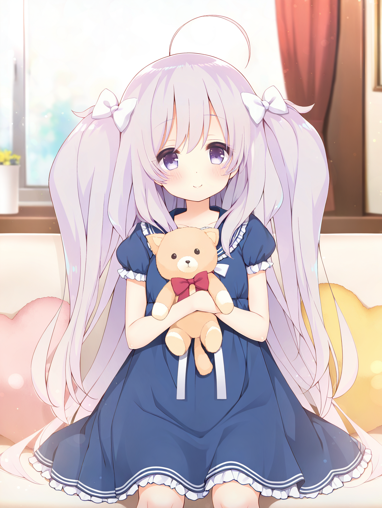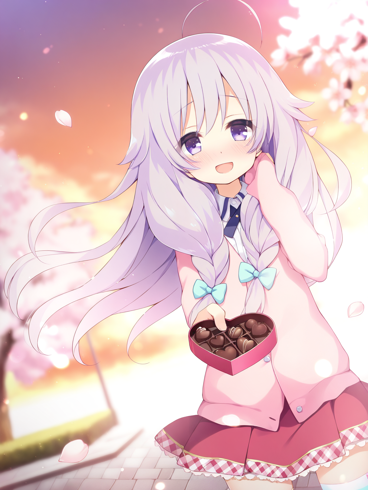 shirosaki mieru,1girl,ahoge,twin braids,blue bow,front twin braids,pink bow,blue bow