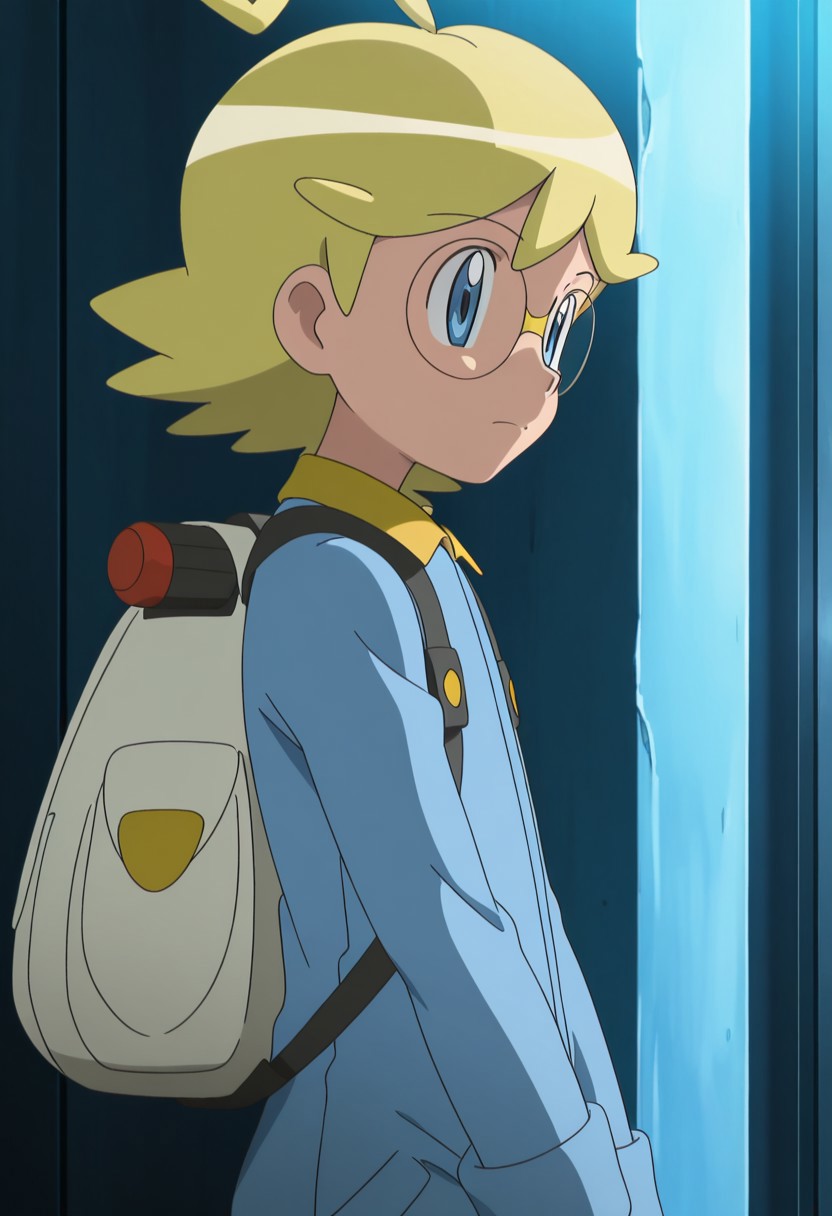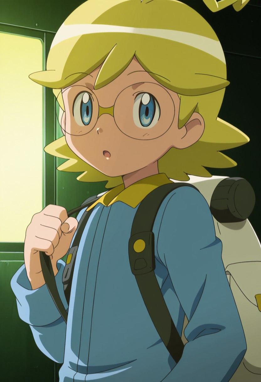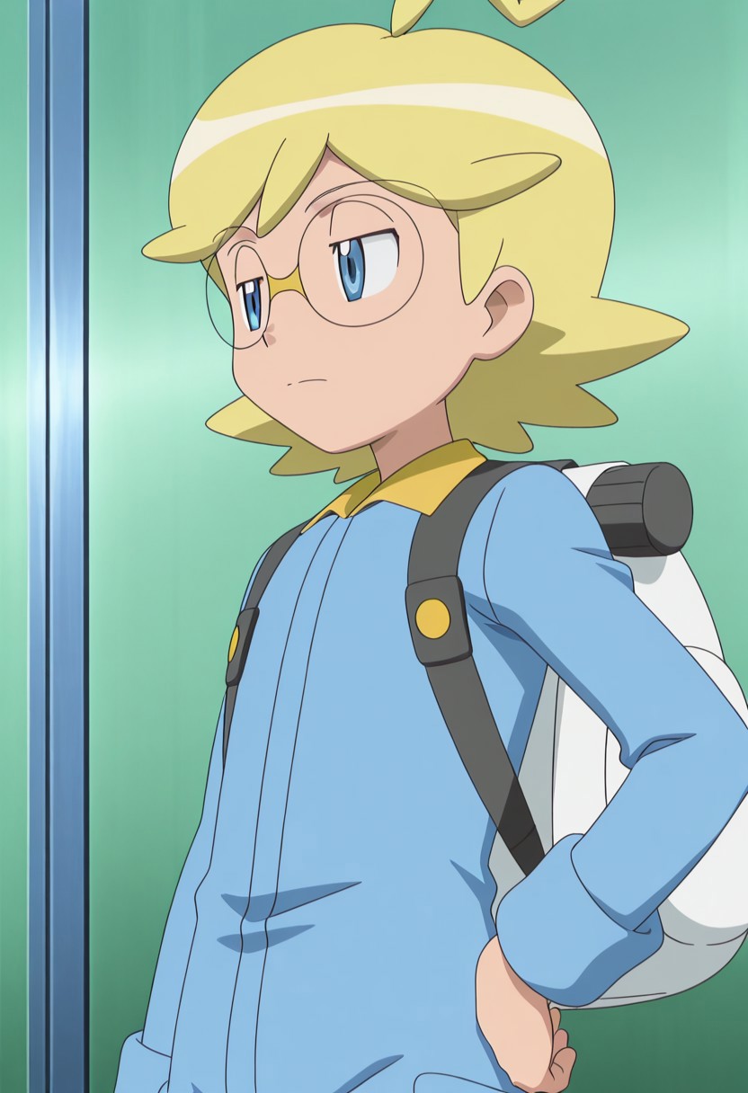 Clemont,blonde hair,ahoge,bang,blue eyes,glasses,jumpsuit,backpack,