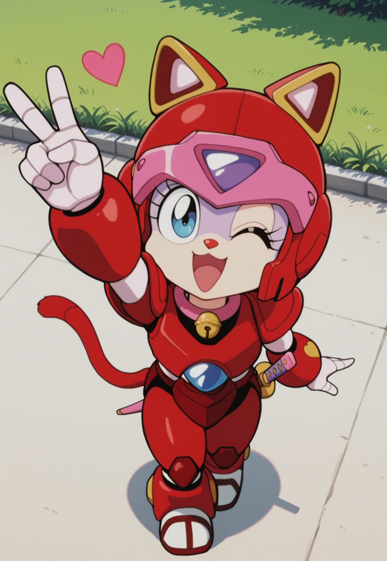 Tags: female, robot, cat, purple fur, two-tone fur, eyelashes, blue eyes, red nose, feline, red tail, pink collar, neck bell, ((main outfit)), shoulder armor, red armor, red armbands, red helmet, sheathed sword