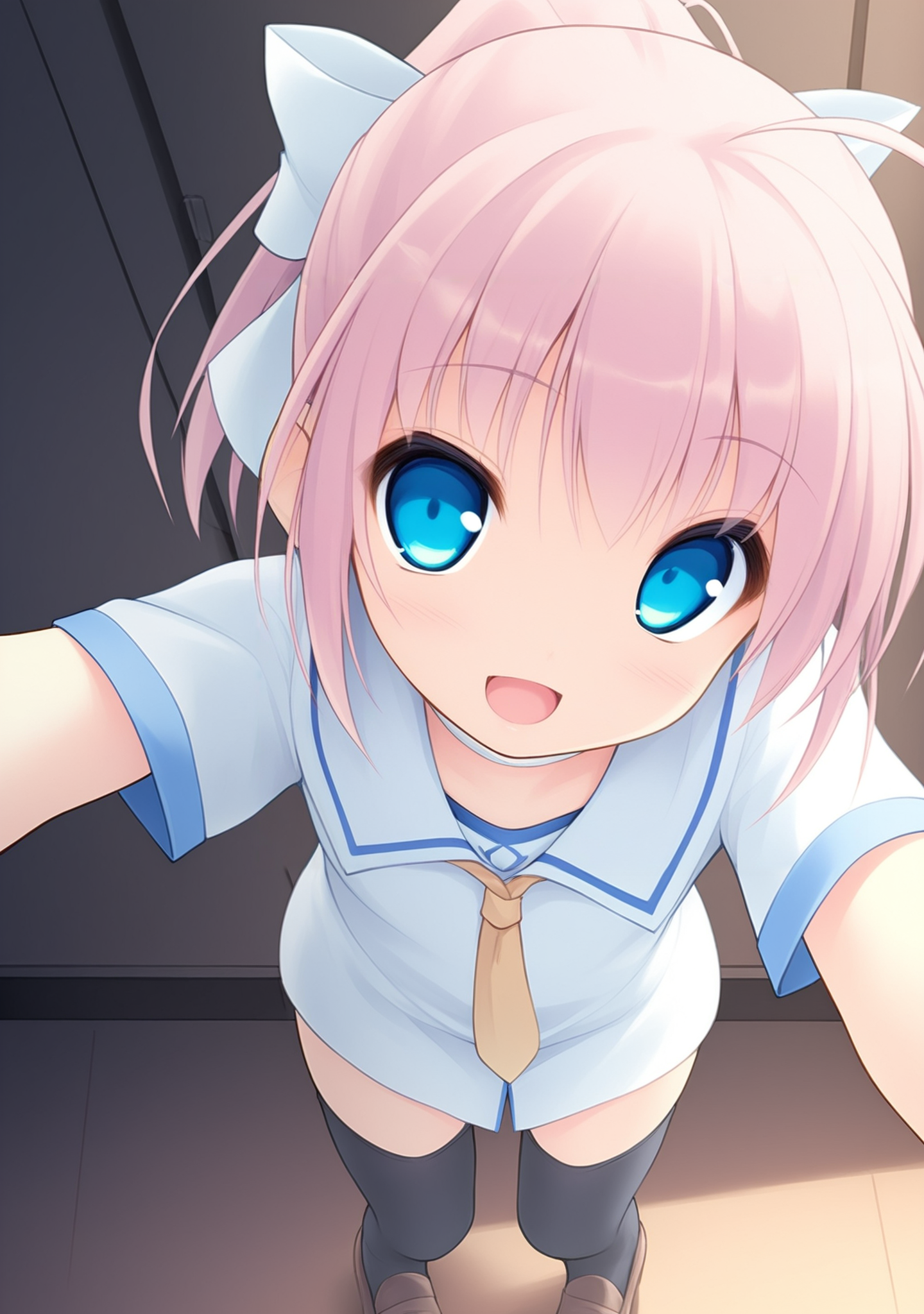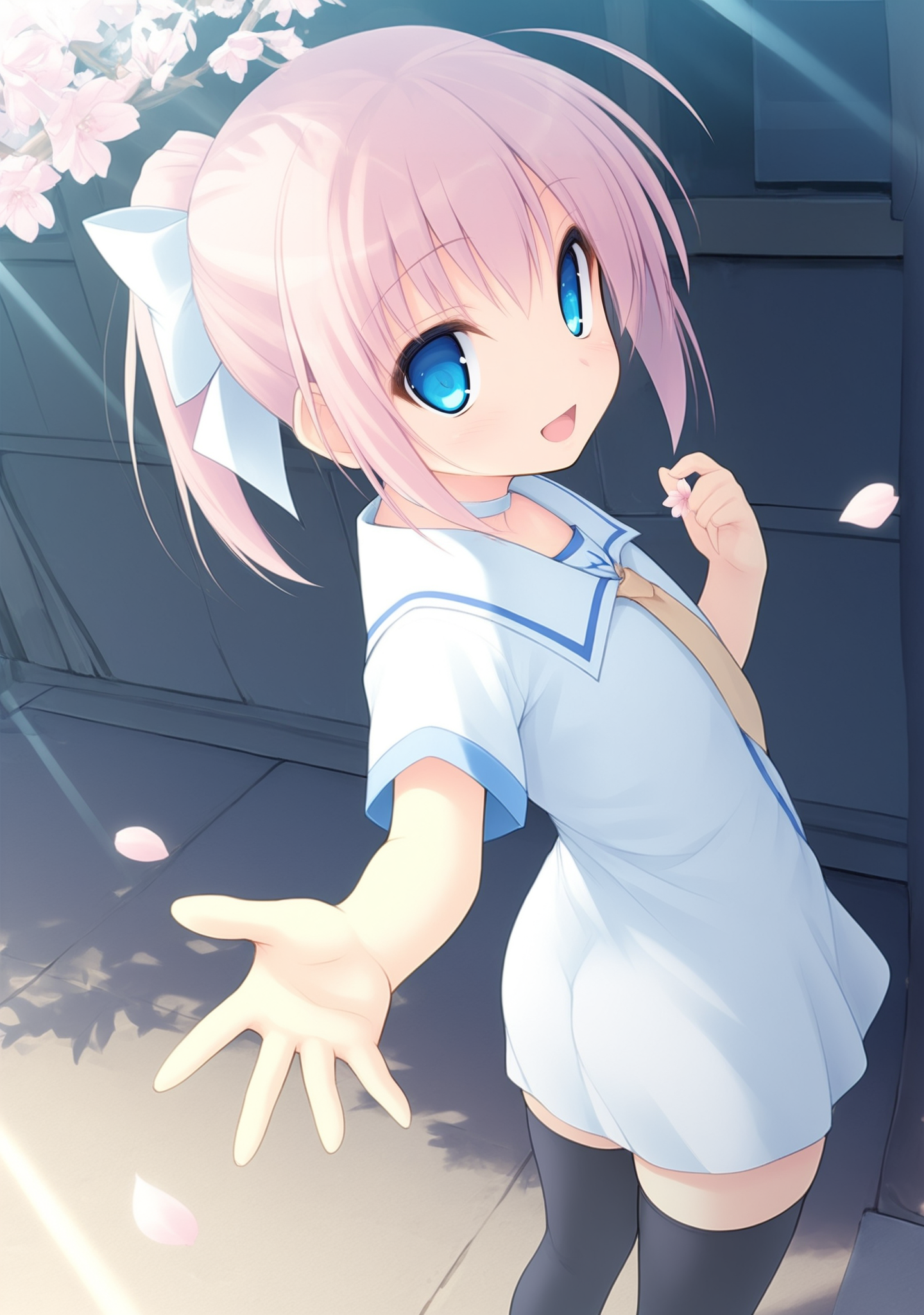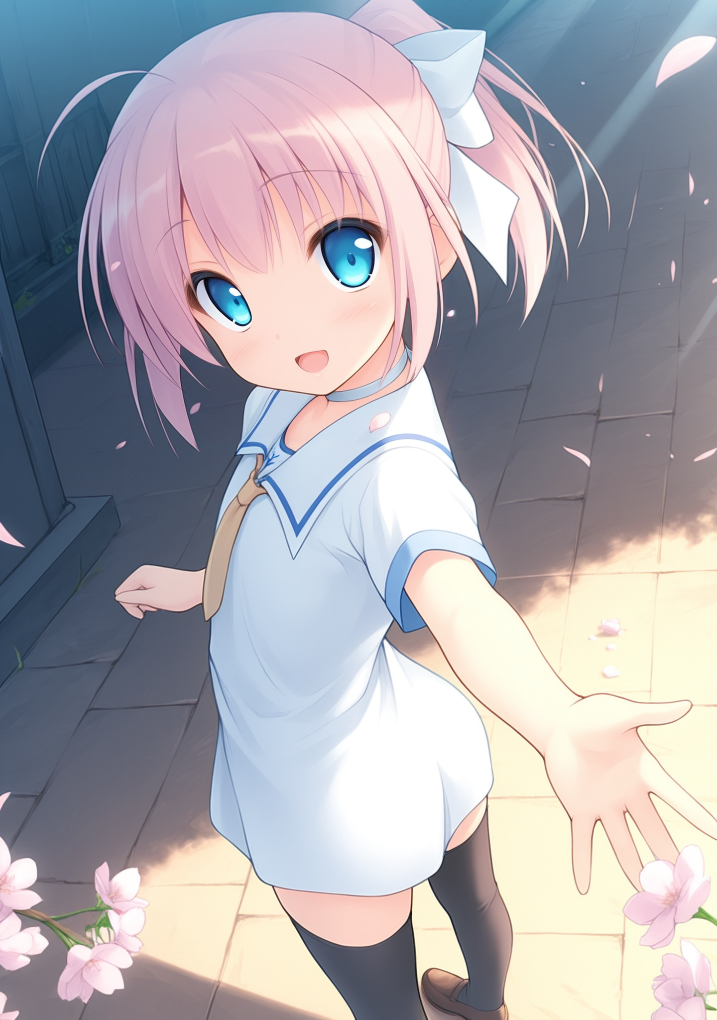 trigger:yuuki-sg,ahoge,,black thighhighs,blue eyes,flat chest,frills,hair bow,brown loafers,pink hair,ponytail,ribbon,sailor dress,school uniform,short dress,short hair,short sleeves,white bow,{white choker|},white dress,yellow necktie,zettai ryouiki,
