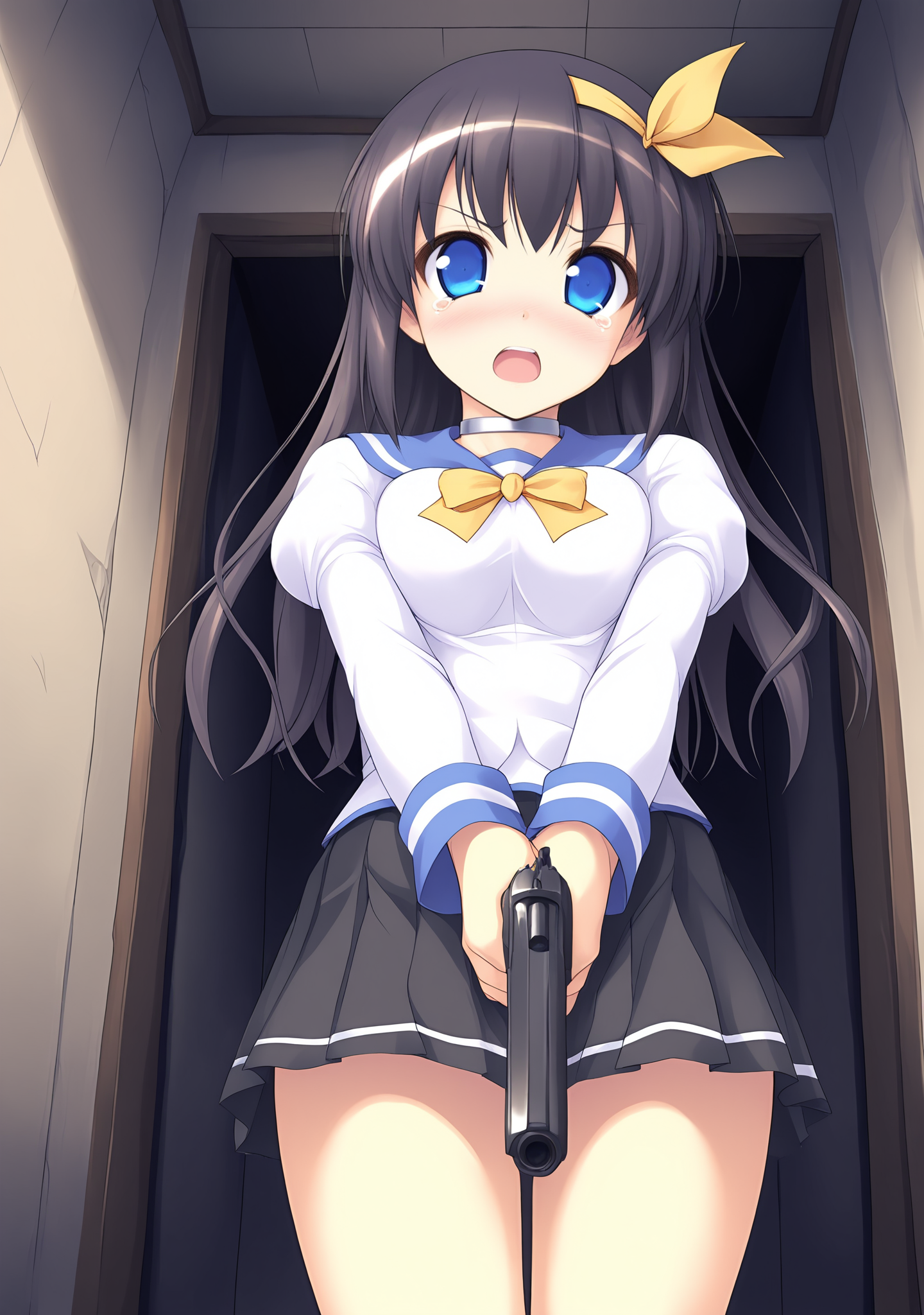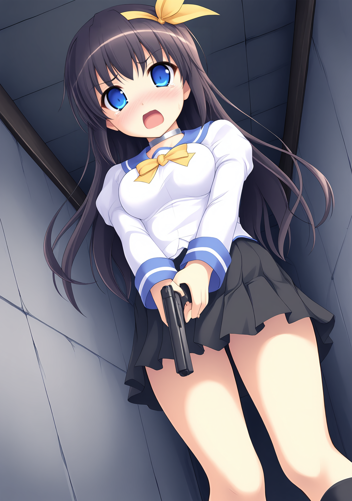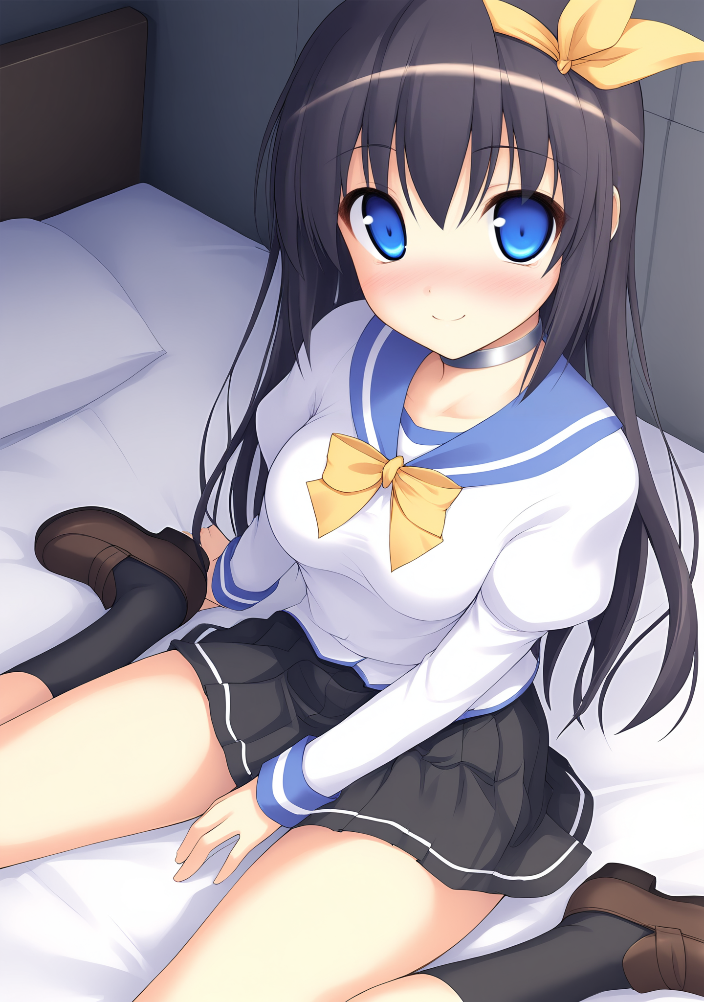 serafuku,black hair,long hair,yellow hairband,hair ribbon,hairband,blue eyes,medium breasts,blue sailor collar,yellow bowtie,juliet sleeves,long sleeves,white shirt,black socks,black skirt,pleated skirt,brown loafers,