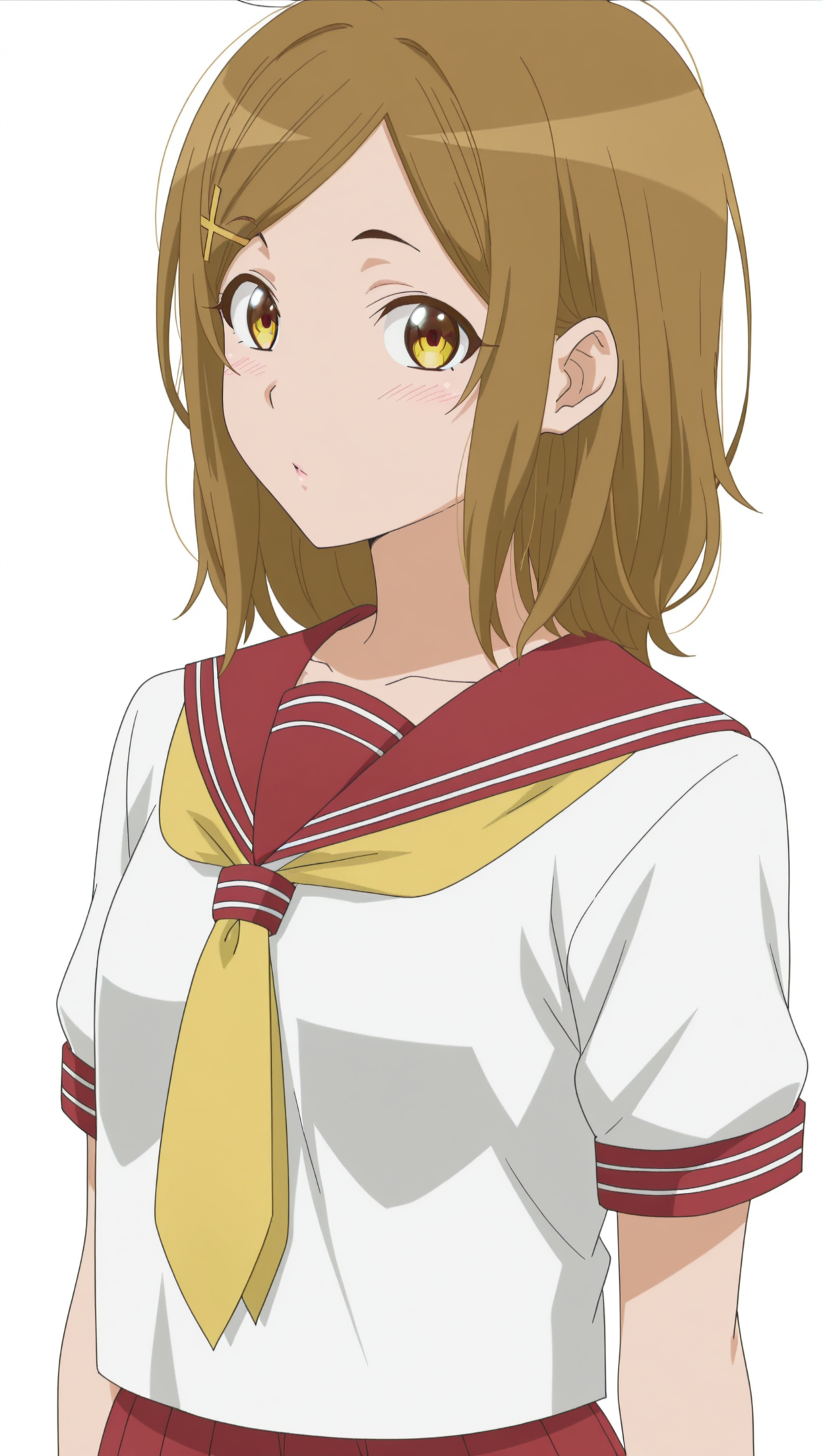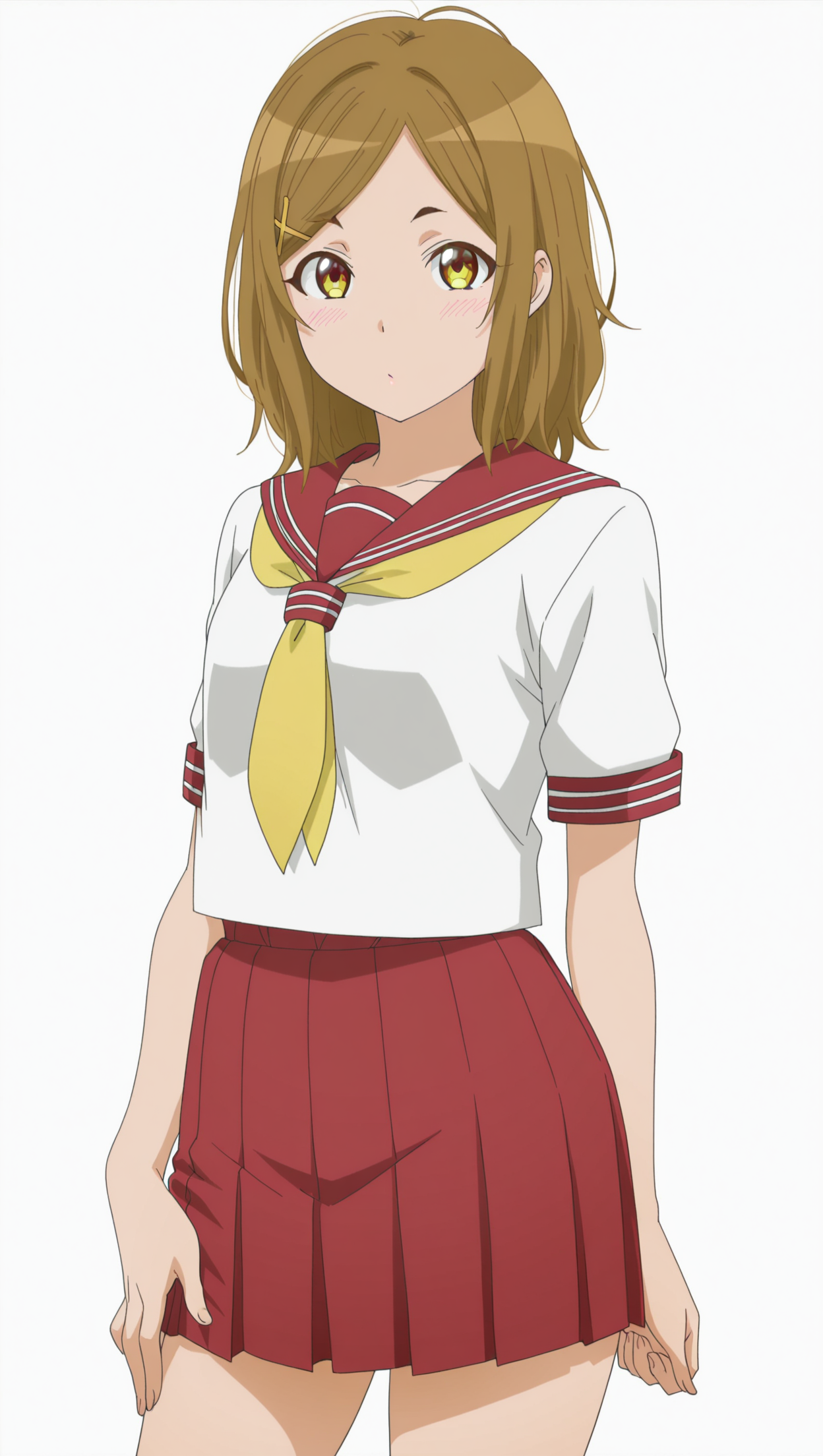 anime coloring, masterpiece, best quality, amazing quality, akariosaka, 1girl, short hair, brown hair, yellow eyes, small breasts, x hair ornament, serafuku, sailor collar, shirt, short sleeves, skirt, red skirt, pleated skirt, solo, pose, standing, looking at viewer, from front, ((((white background, simple background))))