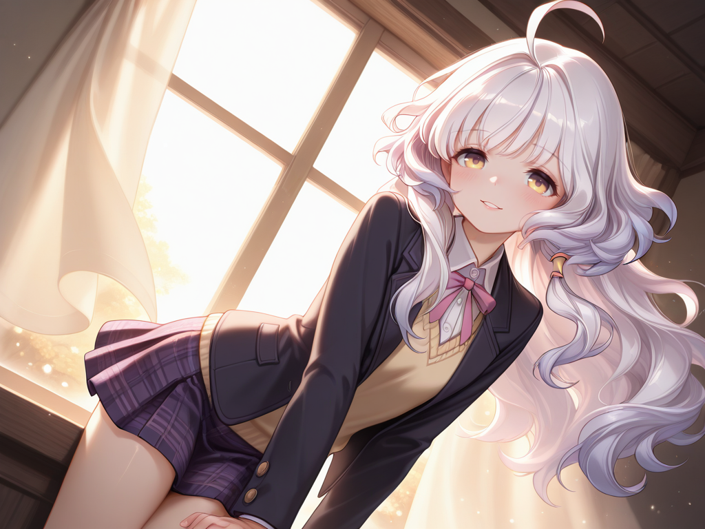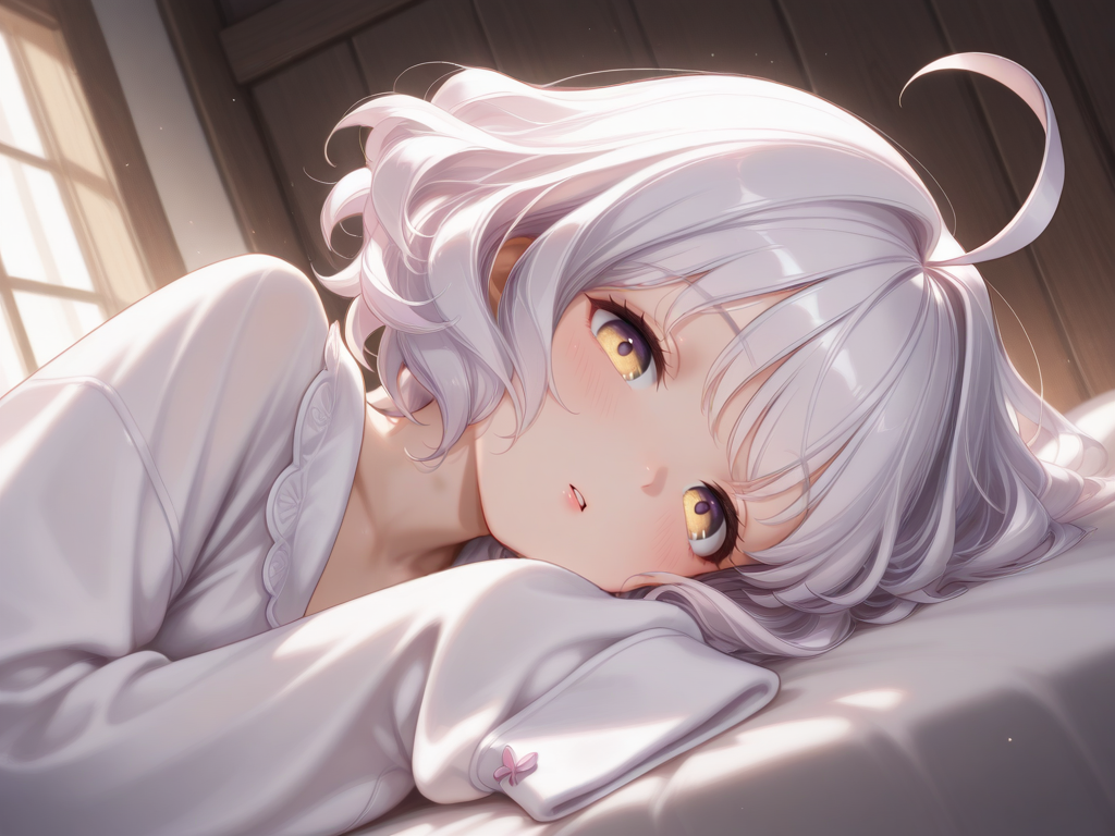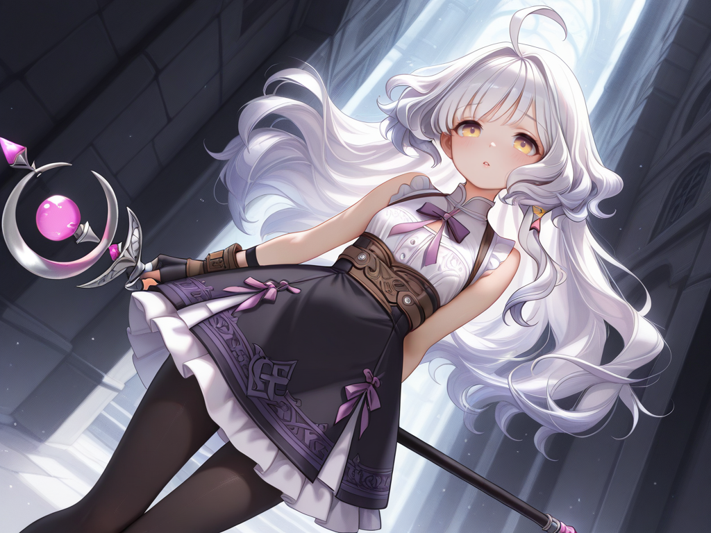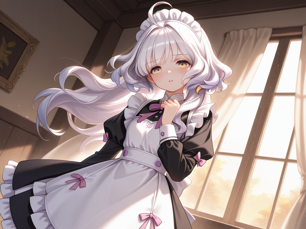 ahoge,white hair,long hair,yellow eyes,blunt bangs,wavy hair