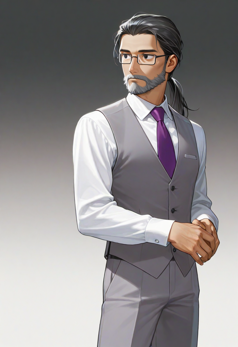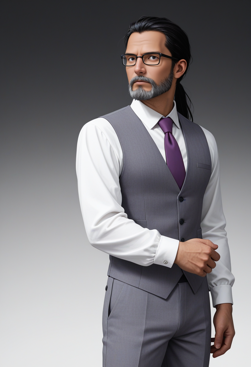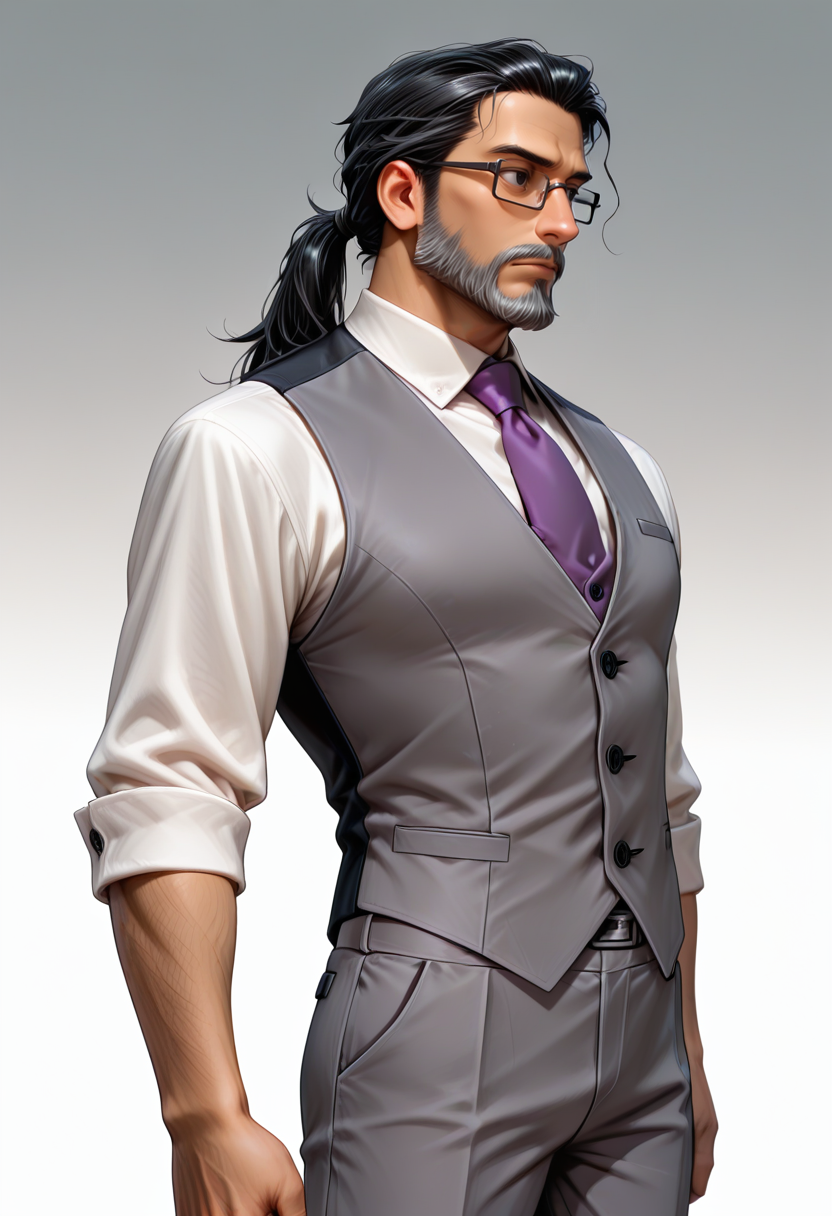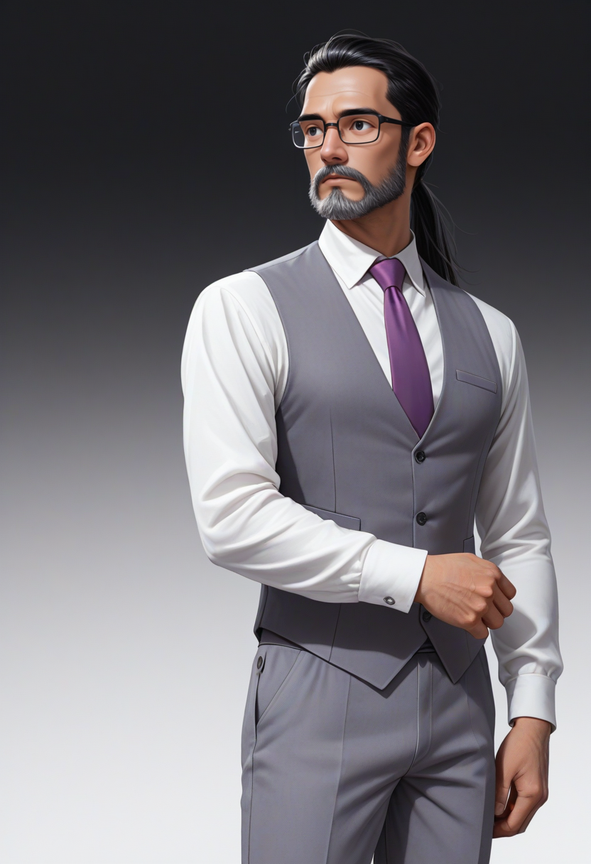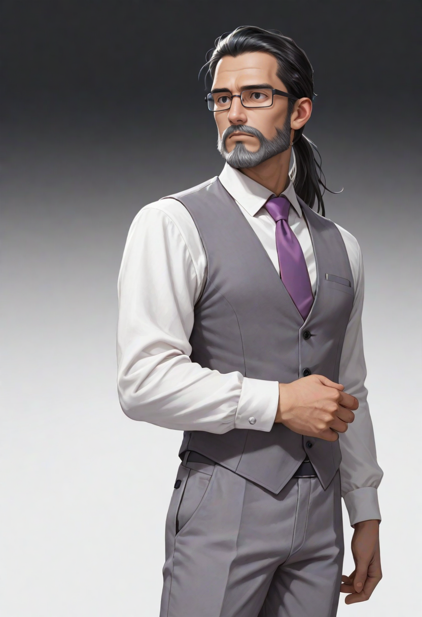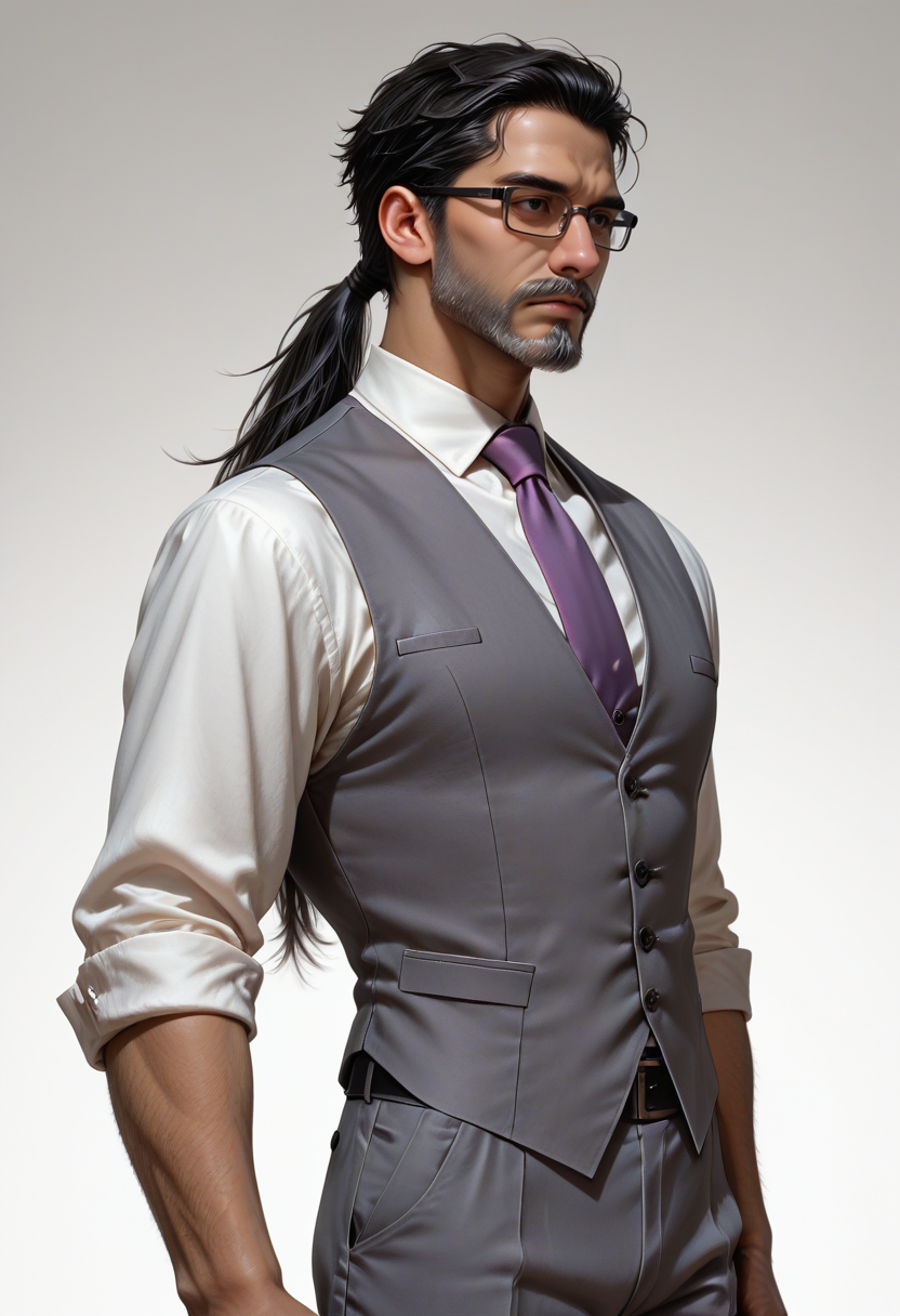long hair, ponytail, black hair, grey beard, facial hair, rectangular glasses, black hair, black eyes, 30 years old, white shirt, grey waistcoat, purple tie, grey pants