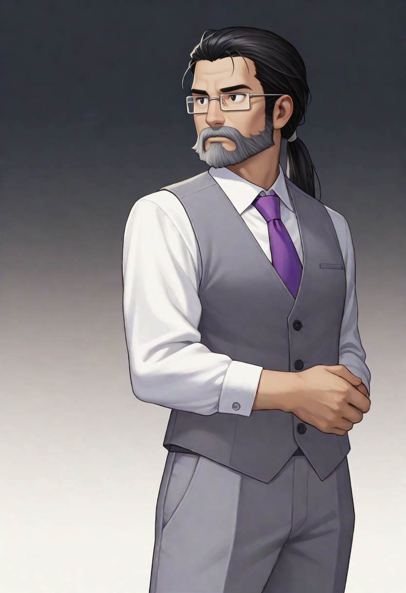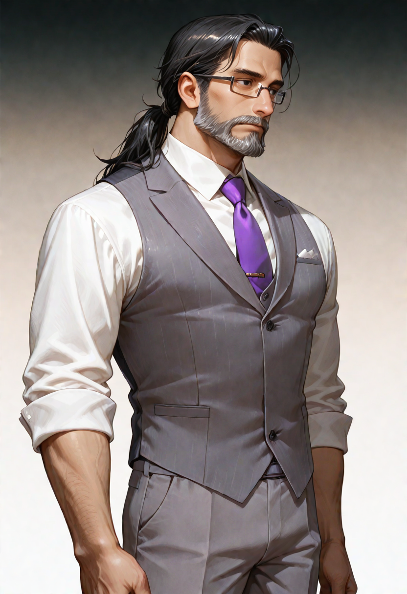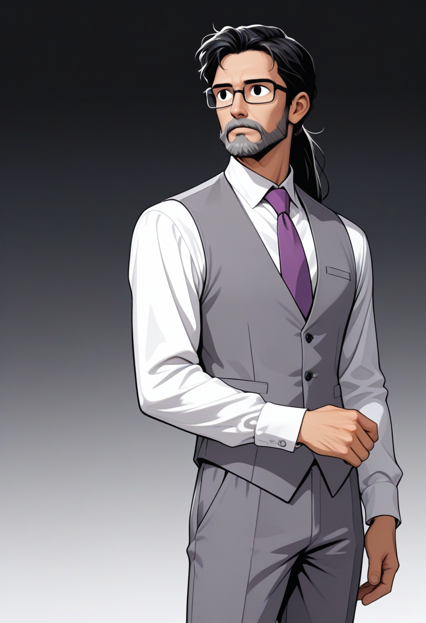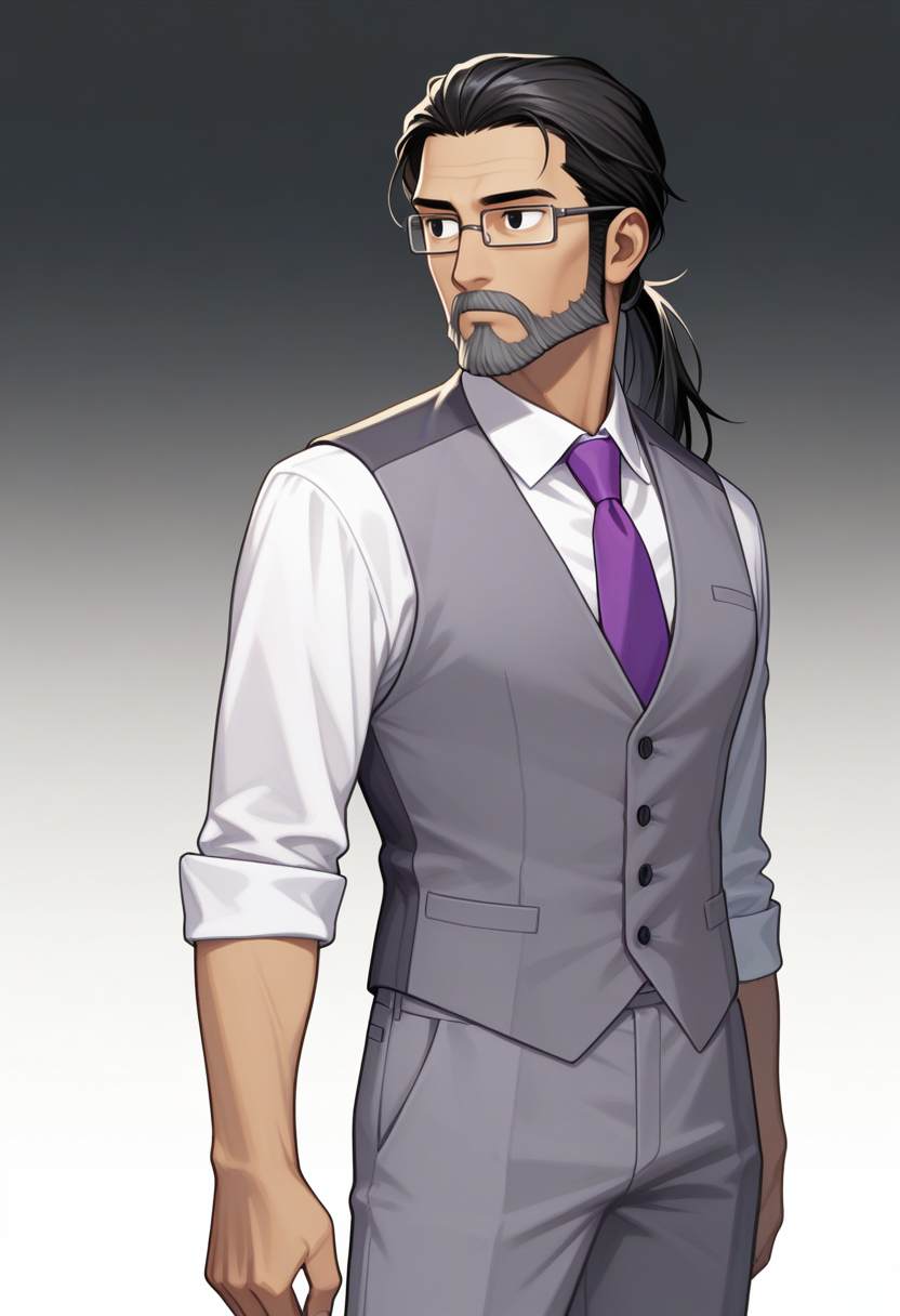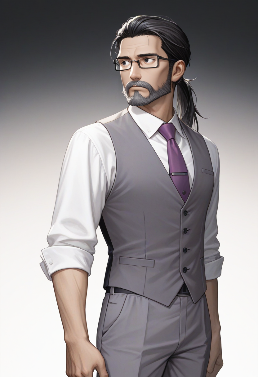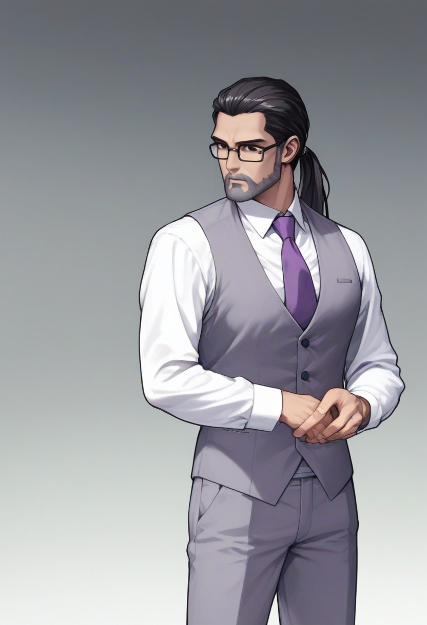 long hair, ponytail, black hair, grey beard, facial hair, rectangular glasses, black hair, black eyes, 30 years old, white shirt, grey waistcoat, purple tie, grey pants