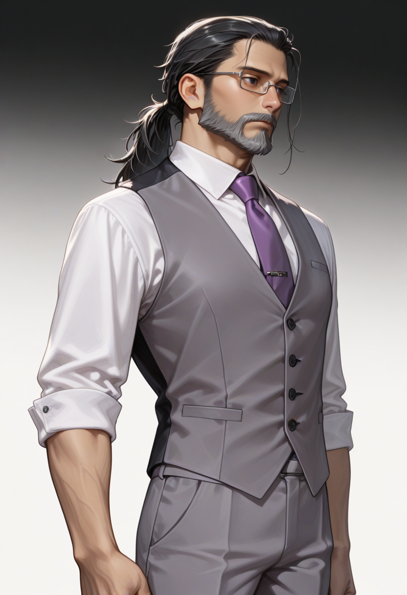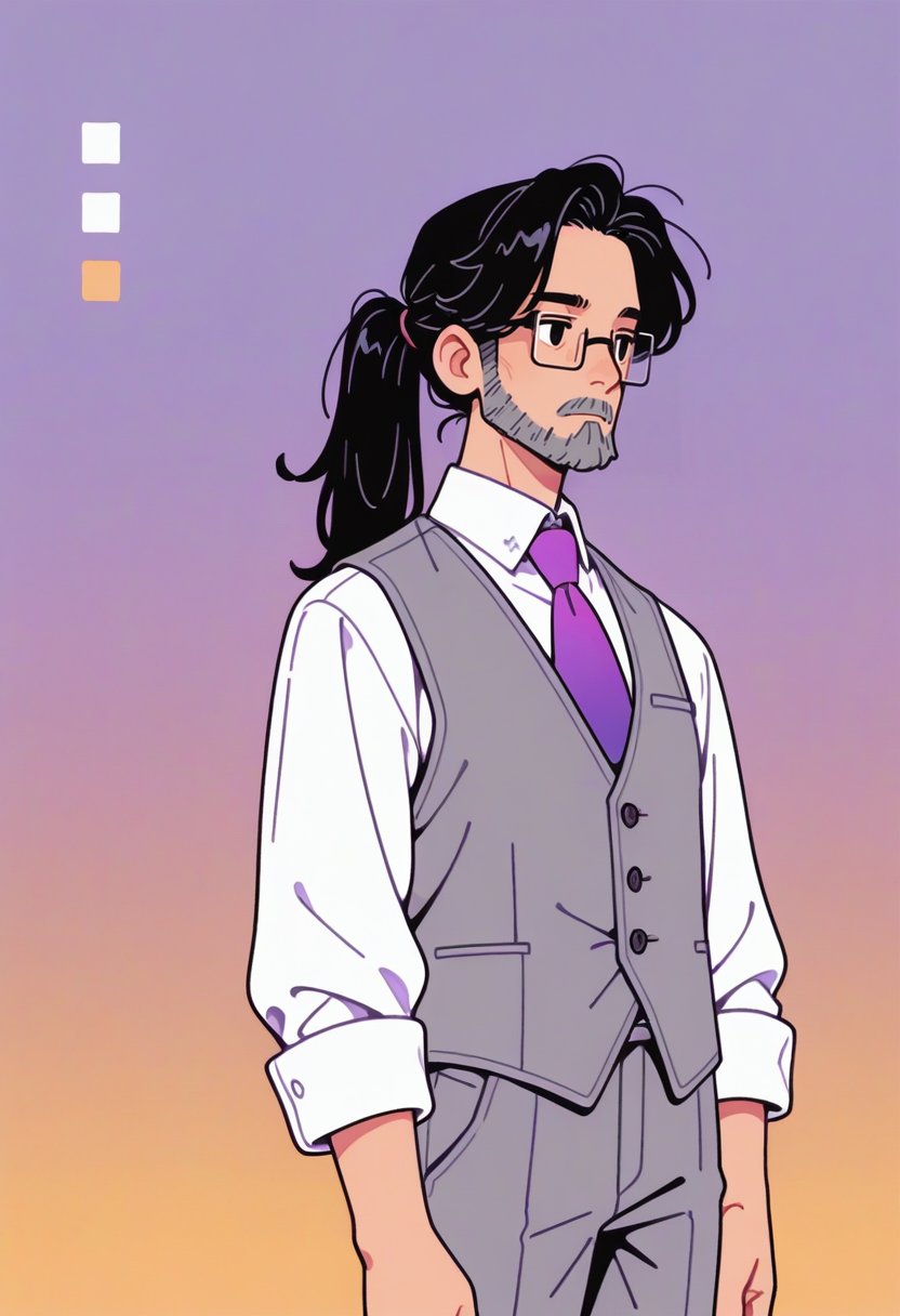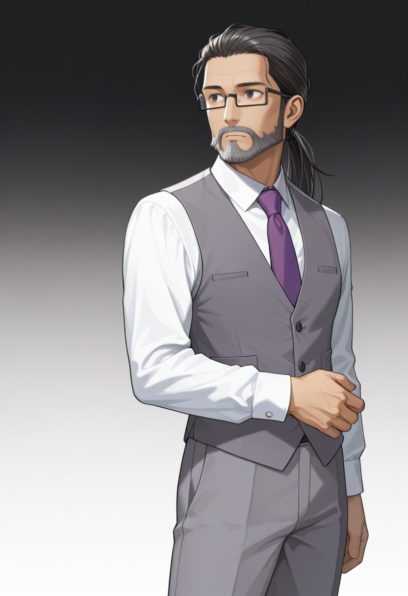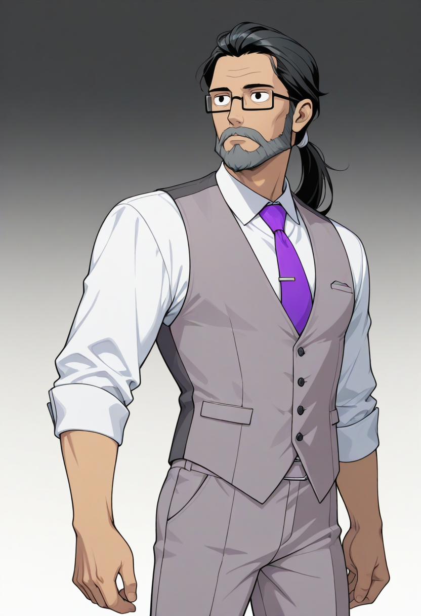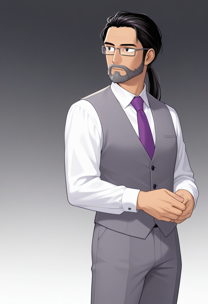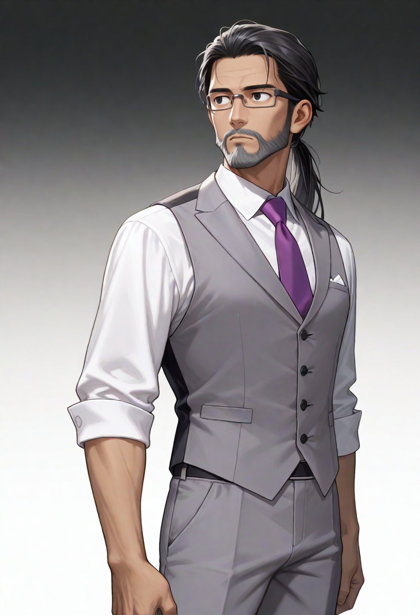 long hair, ponytail, black hair, grey beard, facial hair, rectangular glasses, black hair, black eyes, 30 years old, white shirt, grey waistcoat, purple tie, grey pants