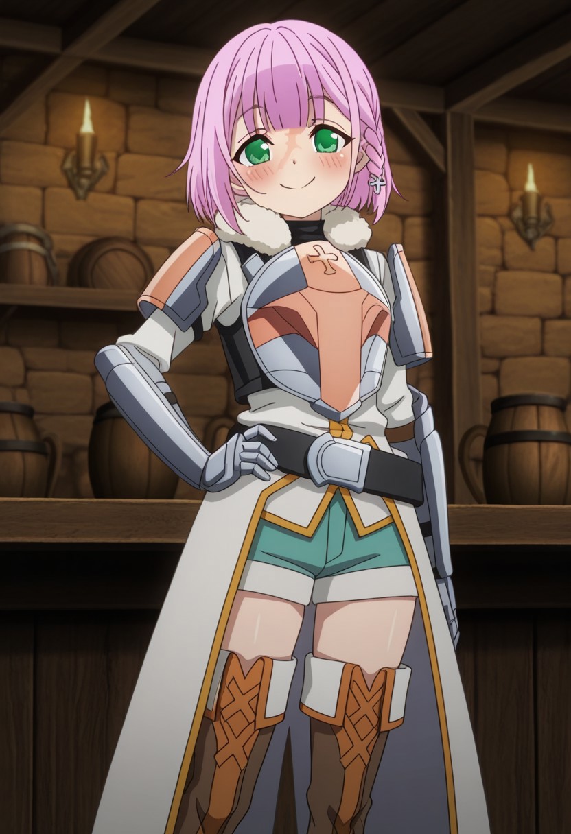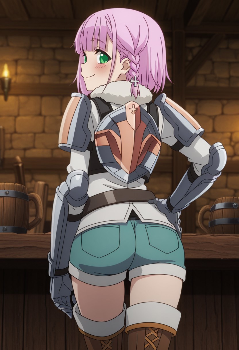short hair, pink hair, side braid, green eyes, scar, armor, shorts, thigh boots
