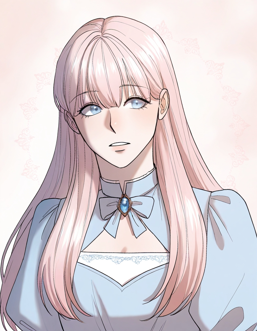 hemilia_britti, long hair, light pink hair, bangs, hair over shoulders, soft blue eyes