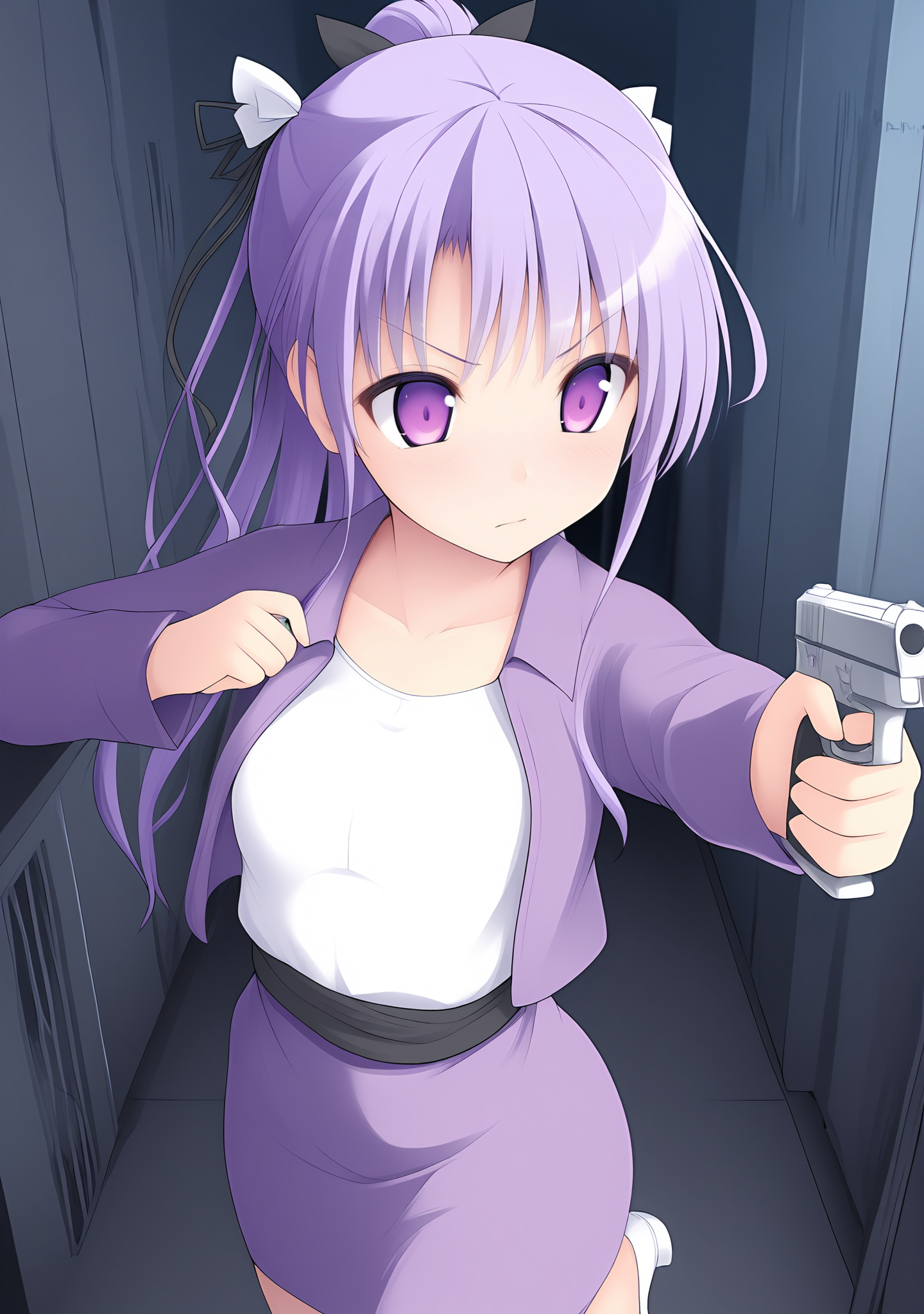 outfit2:hair ribbon,jacket,collarbone,hair ornament,white shirt,black ribbon,open clothes,open jacket,cropped jacket,purple skirt,black sash,pencil skirt,ponytail,white pumps,
