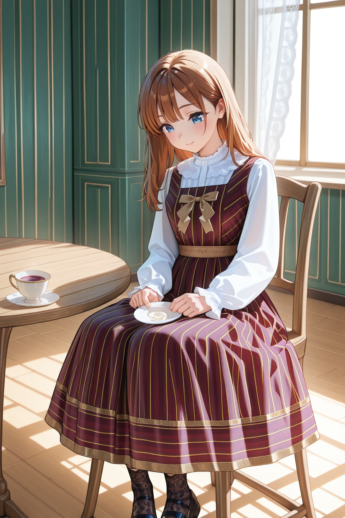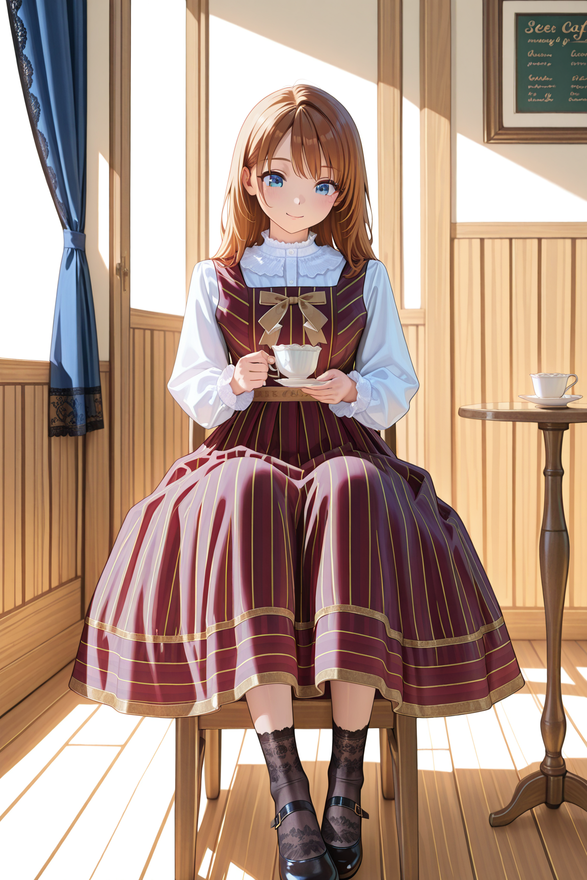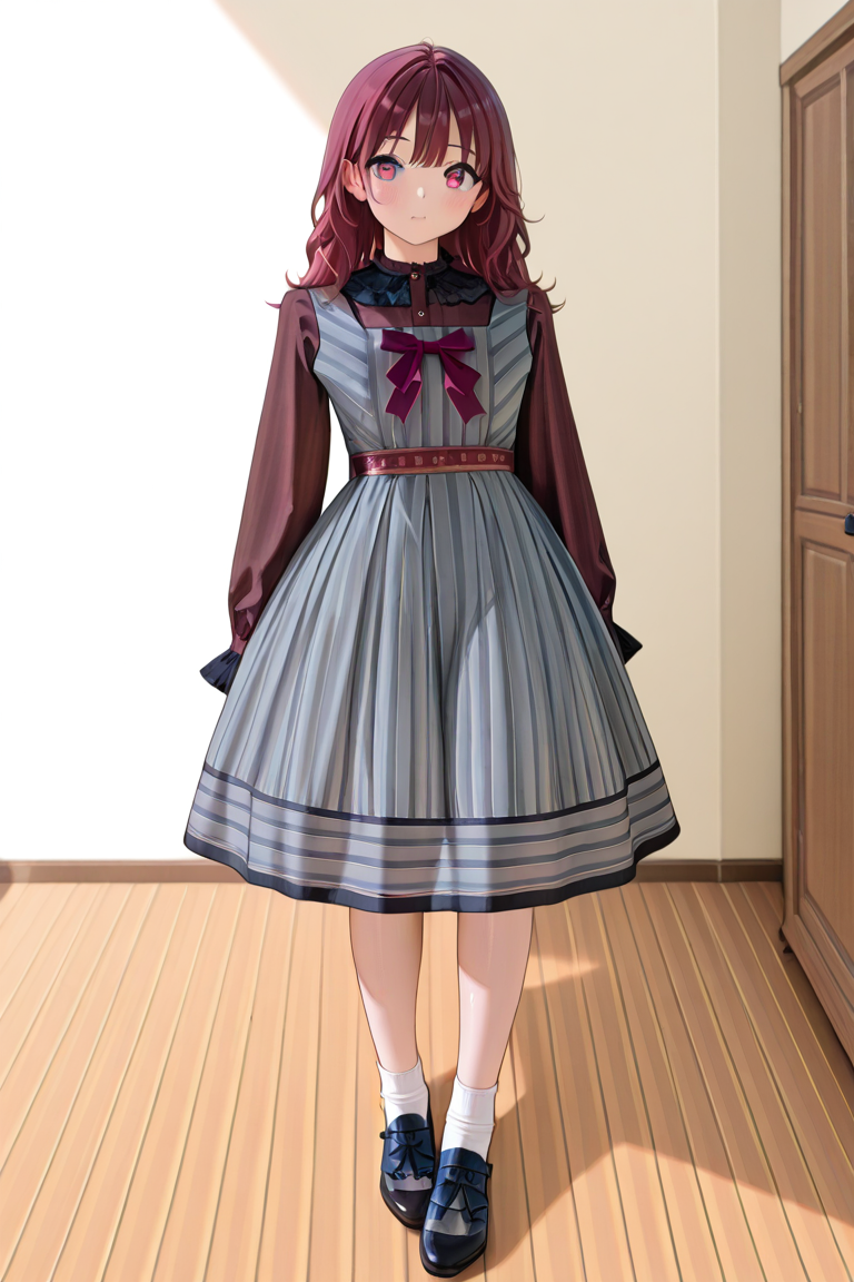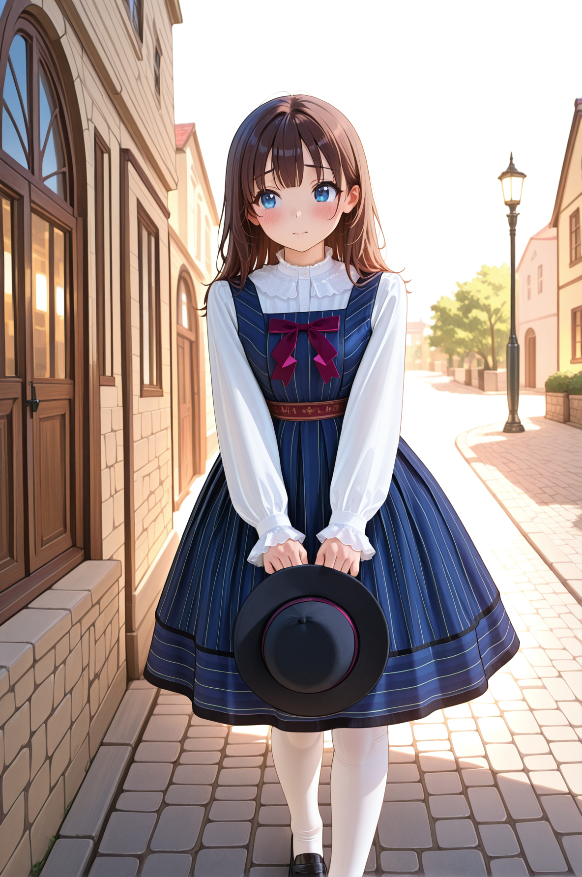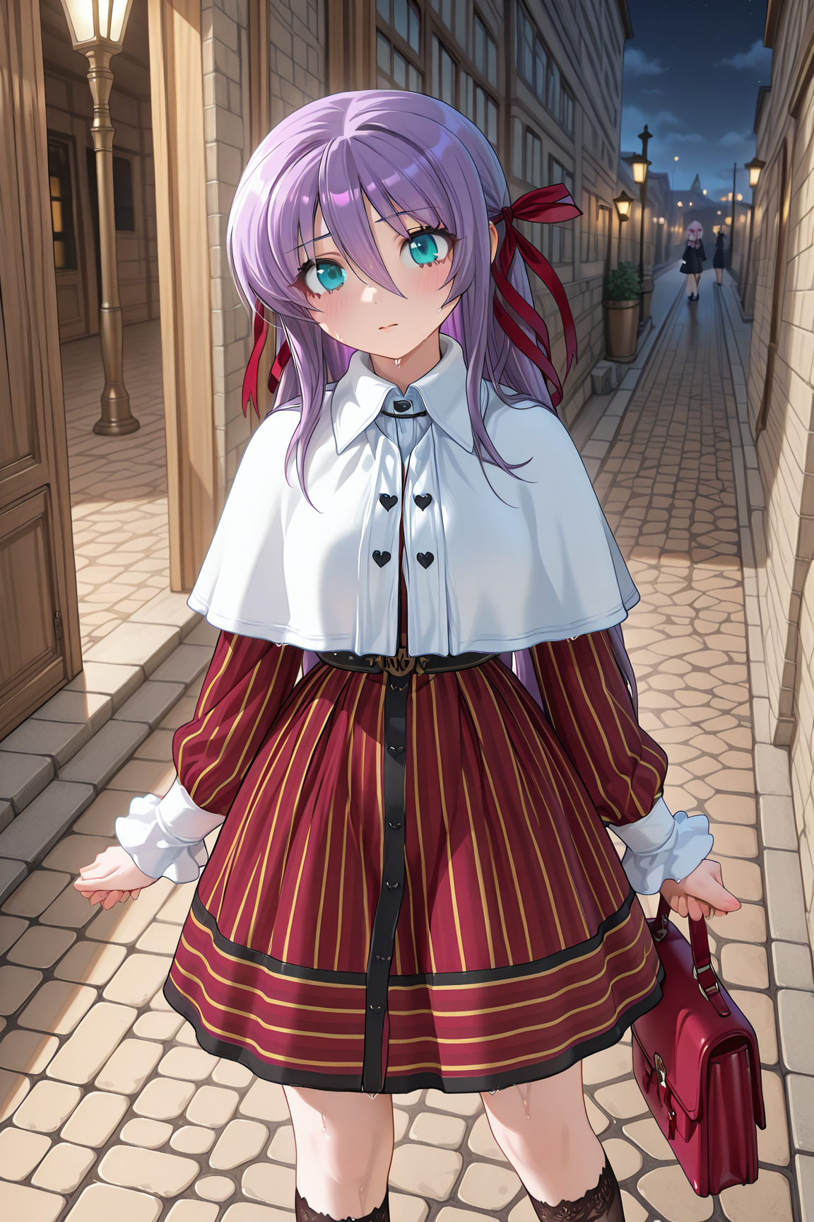 このLoRAは、ストライプ柄クラシカル・ケープレットコーデを再現します。