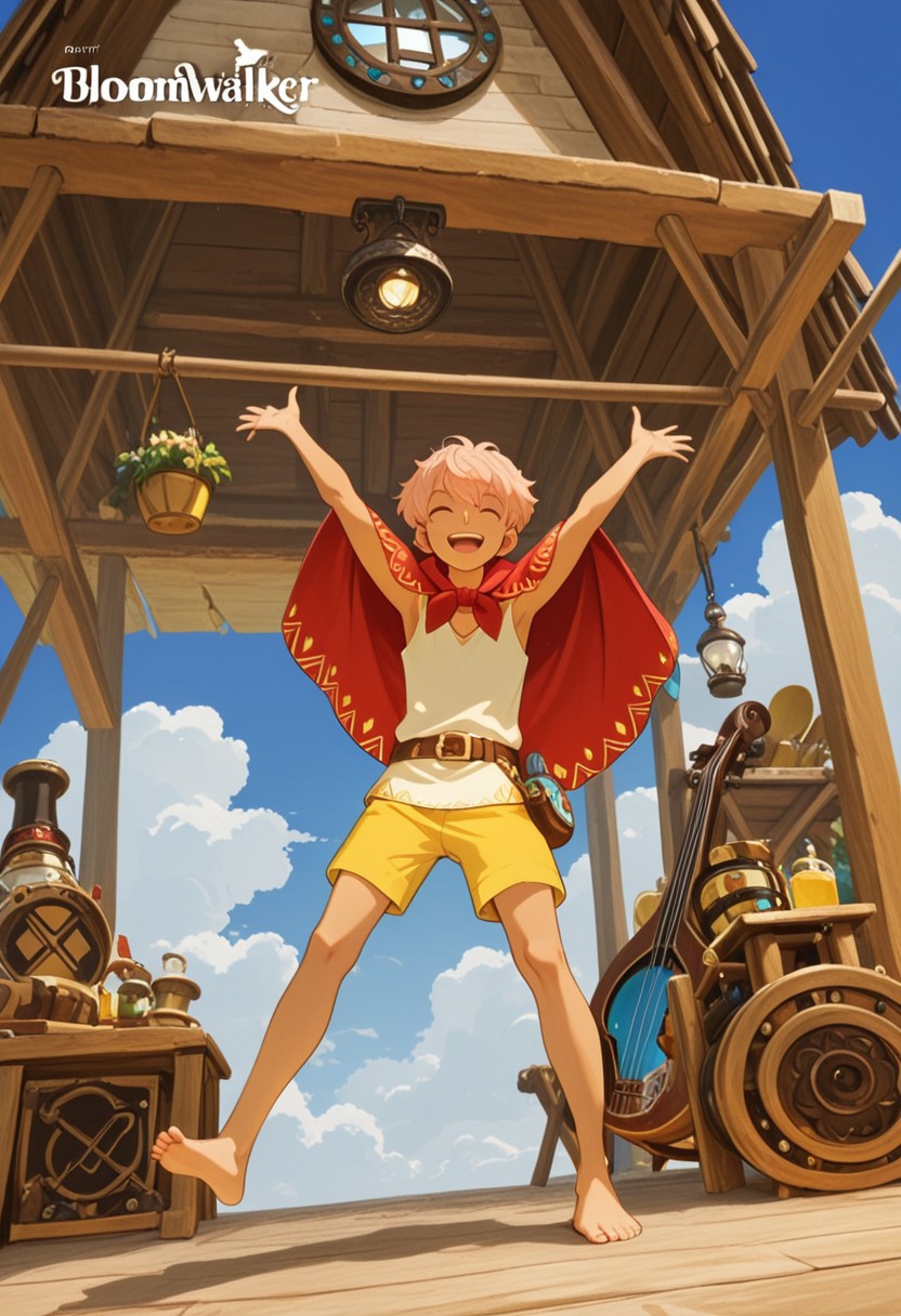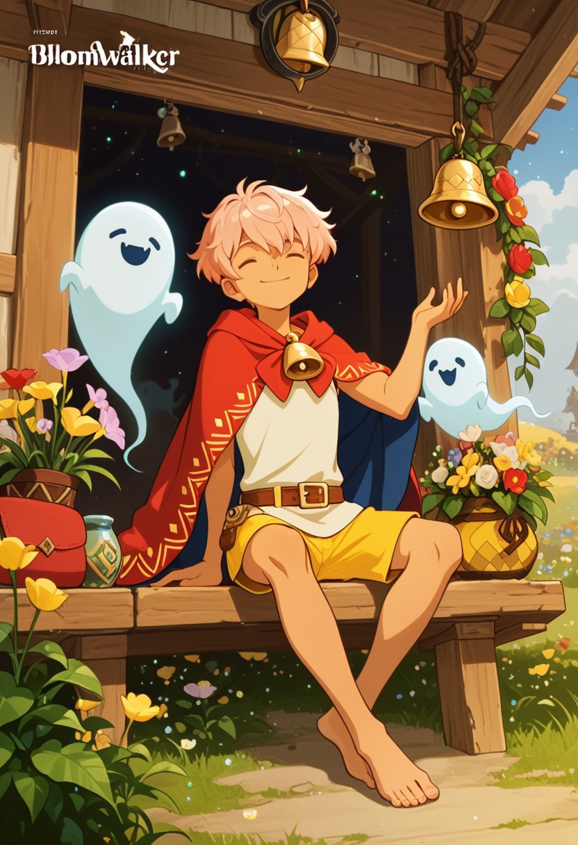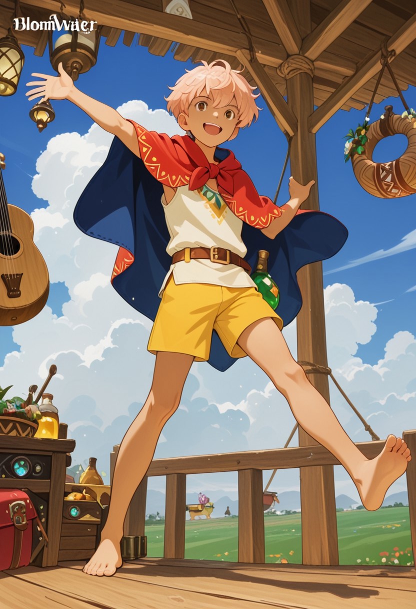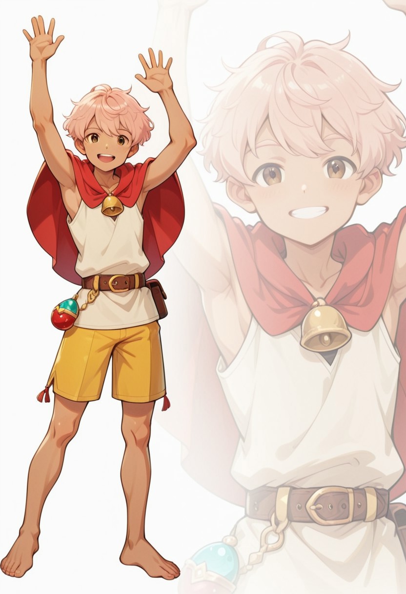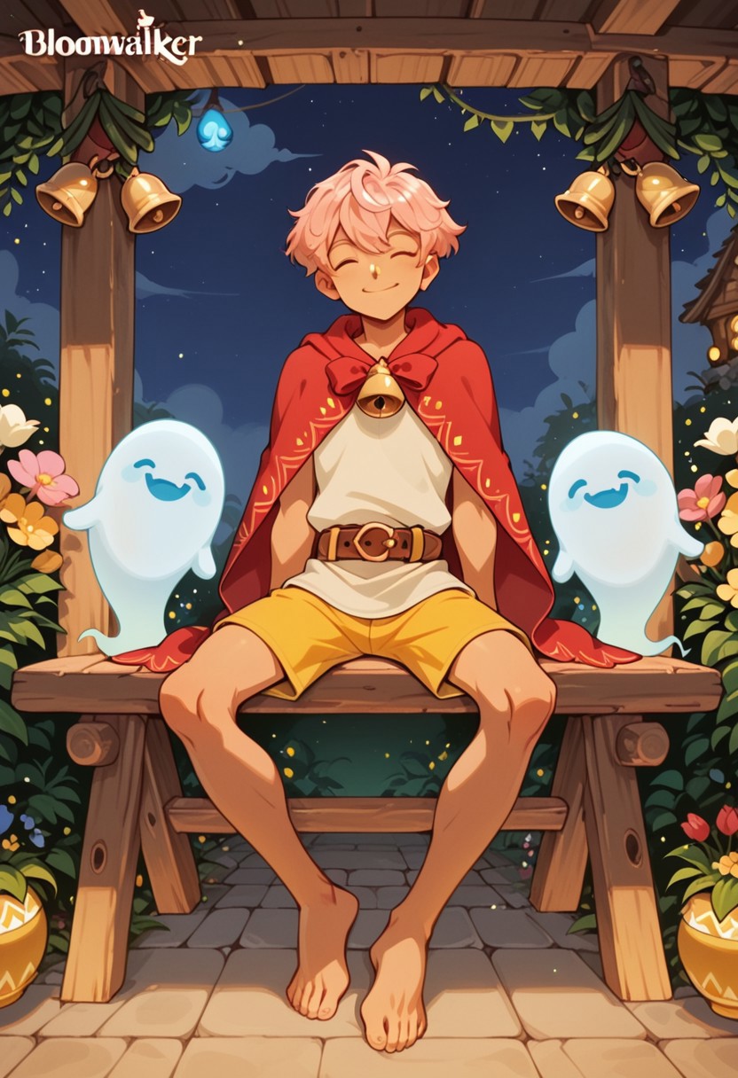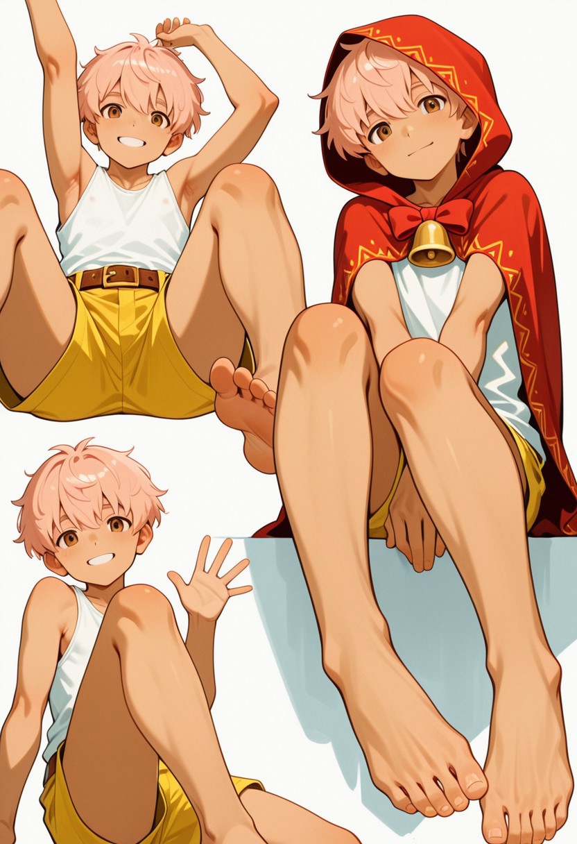 Bloomwalker - Protagonist (COMMISSION)bloomwalker, 1boy, male focus, solo, male, pink hair, short hair, brown eyes, red cape, cape, yellow shorts, shorts, barefoot, sleeveless, accessories, belt, neck bell, hoodie, hood