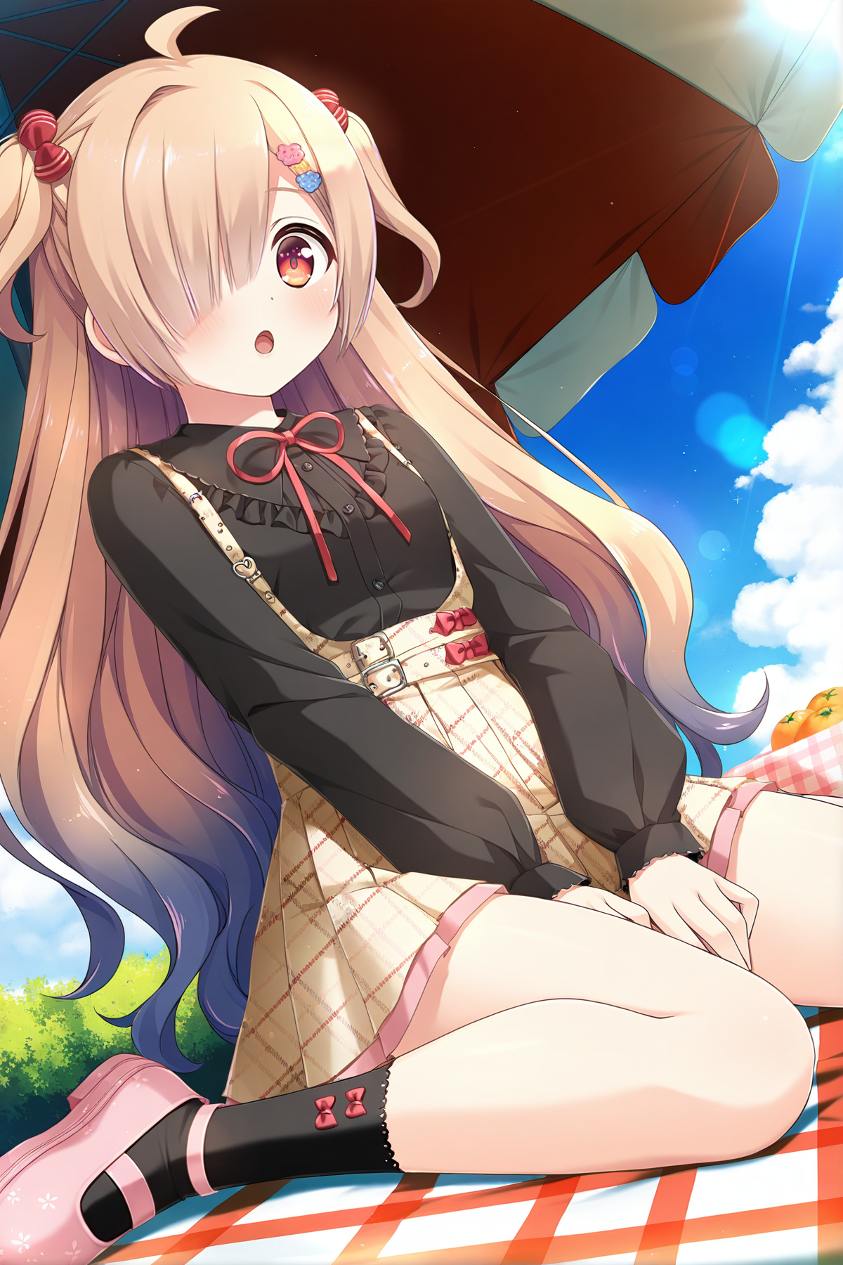 私服:uta daily, brown hair, multicolored hair, gradient hair, long hair, very long hair, two side up, ahoge, hair over one eye, hair ornament, hairclip, hair bobbles, heart hair ornament, red eyes, bow, red bow, neck ribbon, ribbon, collared shirt, dress shirt, black shirt, shirt, long sleeves, puffy sleeves, puffy long sleeves, sleeves past wrists, frills, plaid, suspenders, suspender skirt, brown skirt, pleated skirt, plaid skirt, skirt, black socks, socks, pink footwear, shoes
