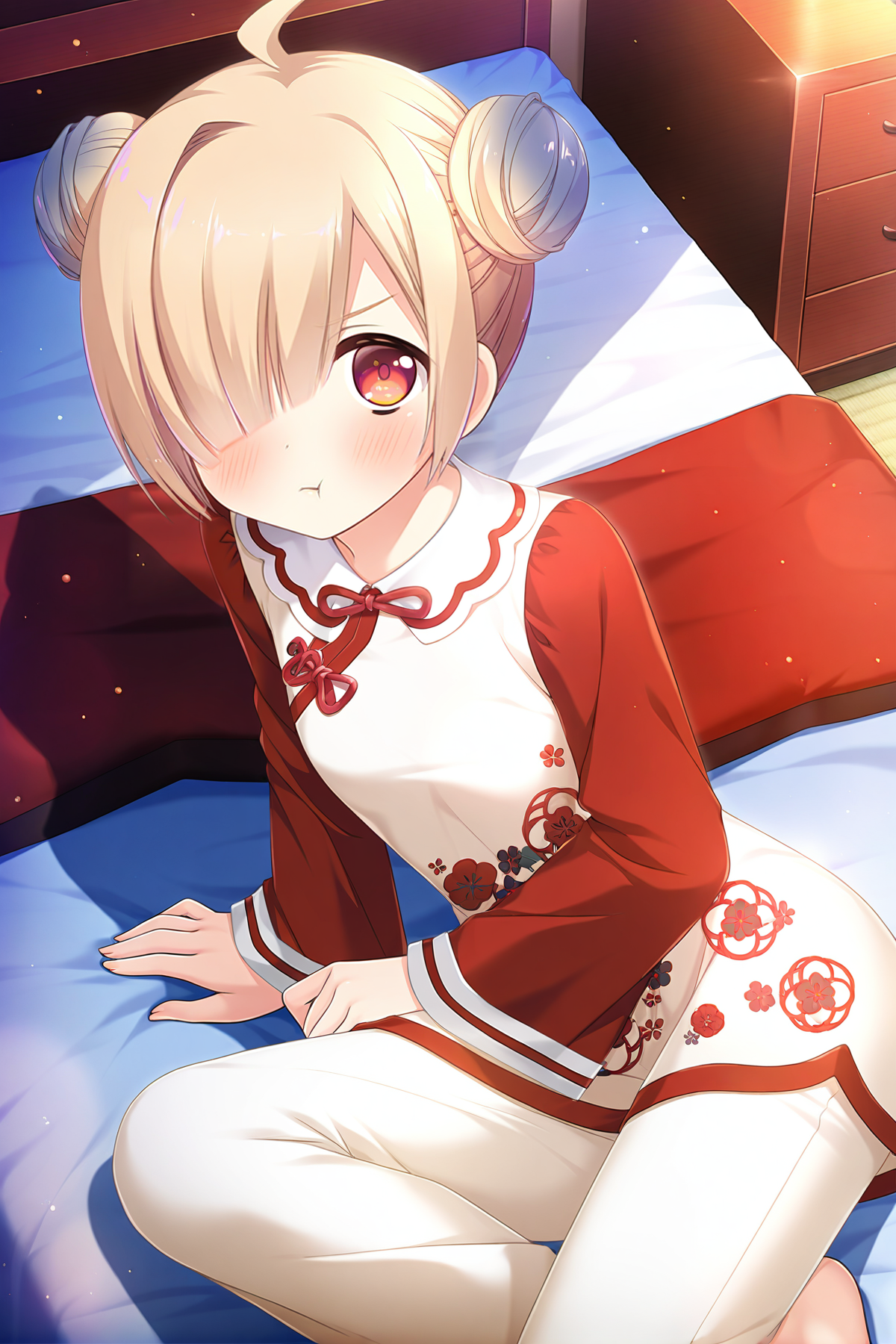 睡衣:uta nightwear, blonde hair, short hair, double bun, hair bun, ahoge, hair over one eye, red eyes, long sleeves, red sleeves, chinese clothes, floral print, white pants, pants, red footwear