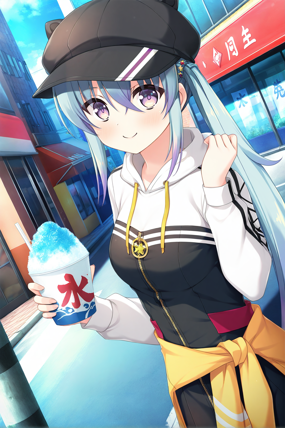 私服:masora daily, purple hair, multicolored hair,hat, gradient hair, side ponytail, hair between eyes, hairclip, black headwear, cabbie hat, hood, hoodie, long sleeves, white sleeves, white collar, dress, black dress, clothes around waist, jacket around waist, red socks, socks, sneakers