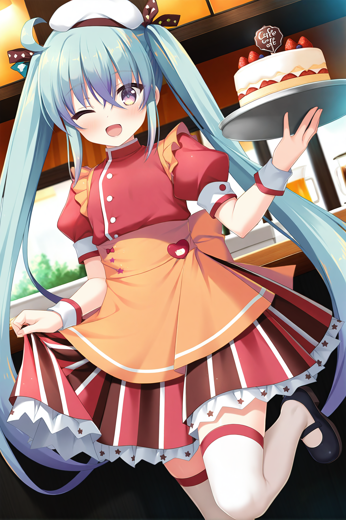 打工服:masora maid, aqua hair, multicolored hair,hat, twintails, hair ribbon, ribbon, white headwear, short sleeves, puffy short sleeves, puffy sleeves, red shirt, shirt, striped clothes, vertical-striped skirt, striped skirt, apron, orange apron, orange obi, wrist cuffs, star print, waitress, white thighhighs, mary janes, black footwear