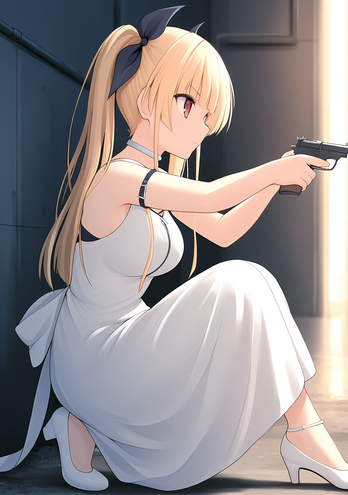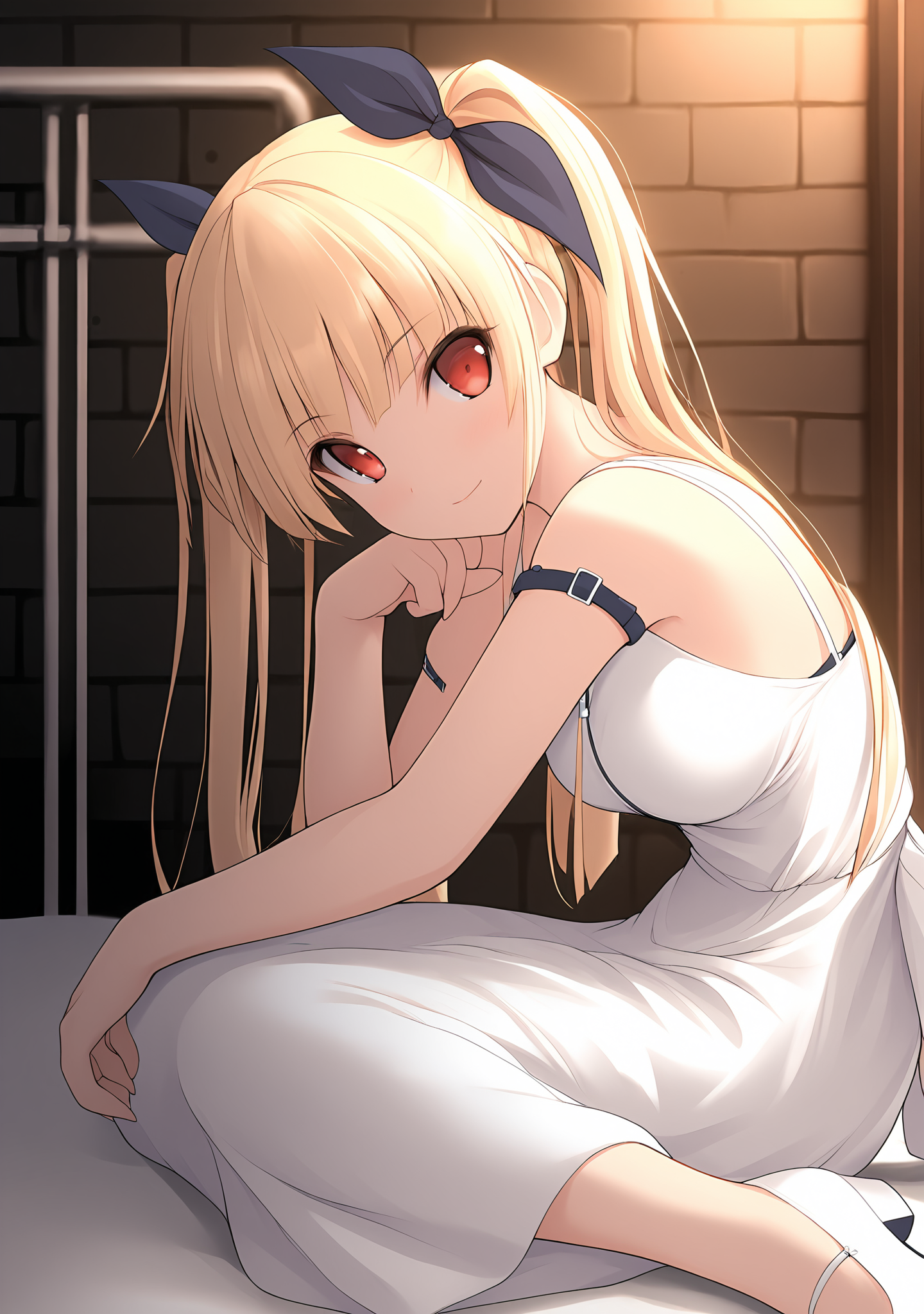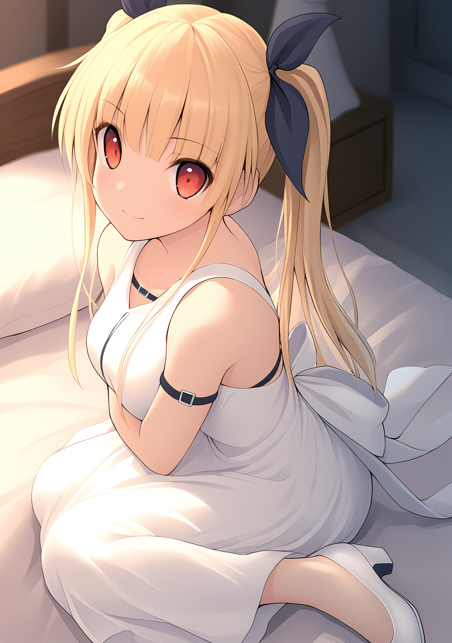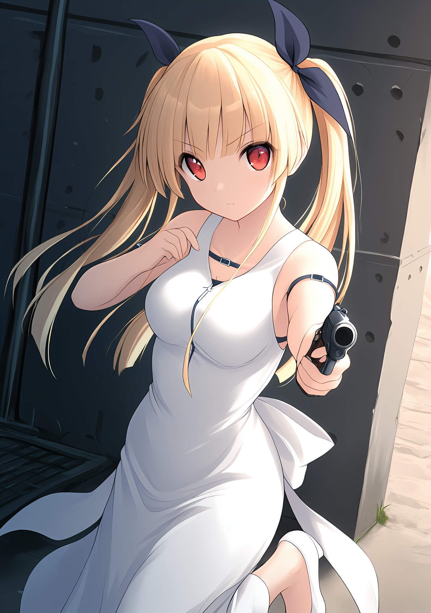 trigger:reika-sg,blonde hair,red eyes,long hair,twintails,medium breasts,bare shoulders,arm belt,back bow,black bow,black ribbon,hair between eyes,blunt bangs,hair bow,hair ribbon,sidelocks,straight hair,long dress,sleeveless dress,sundress,white dress,white pumps,white bow,