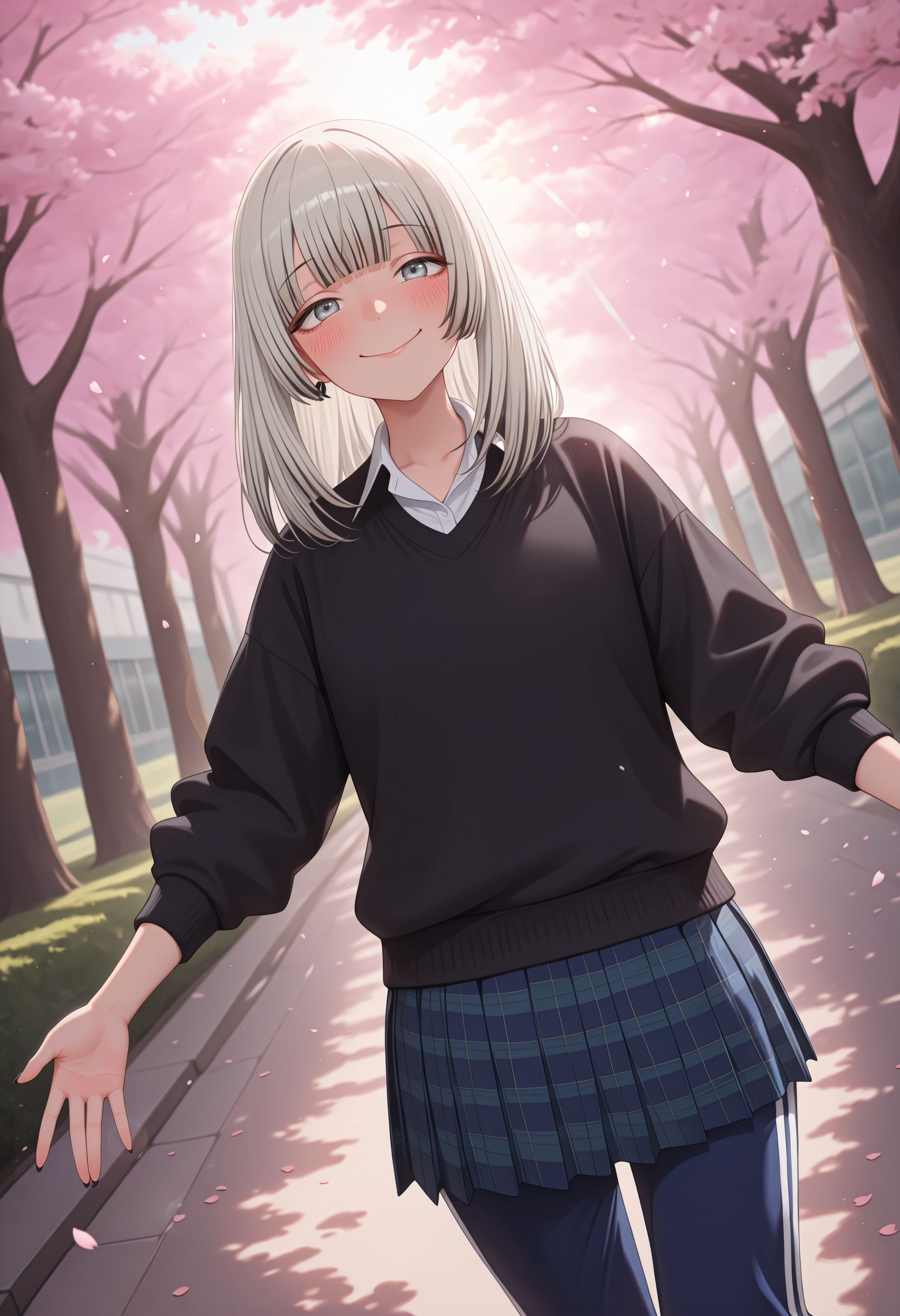 Ouftit 1: 1girl, solo, multicolored hair grey hair, long hair, collared shirt, dark jacket,white shirt, black sweater, pleated skirt, plaid skirt, blue skirt, short skirt, pants under skirt, blue pants, track pants, black nails,