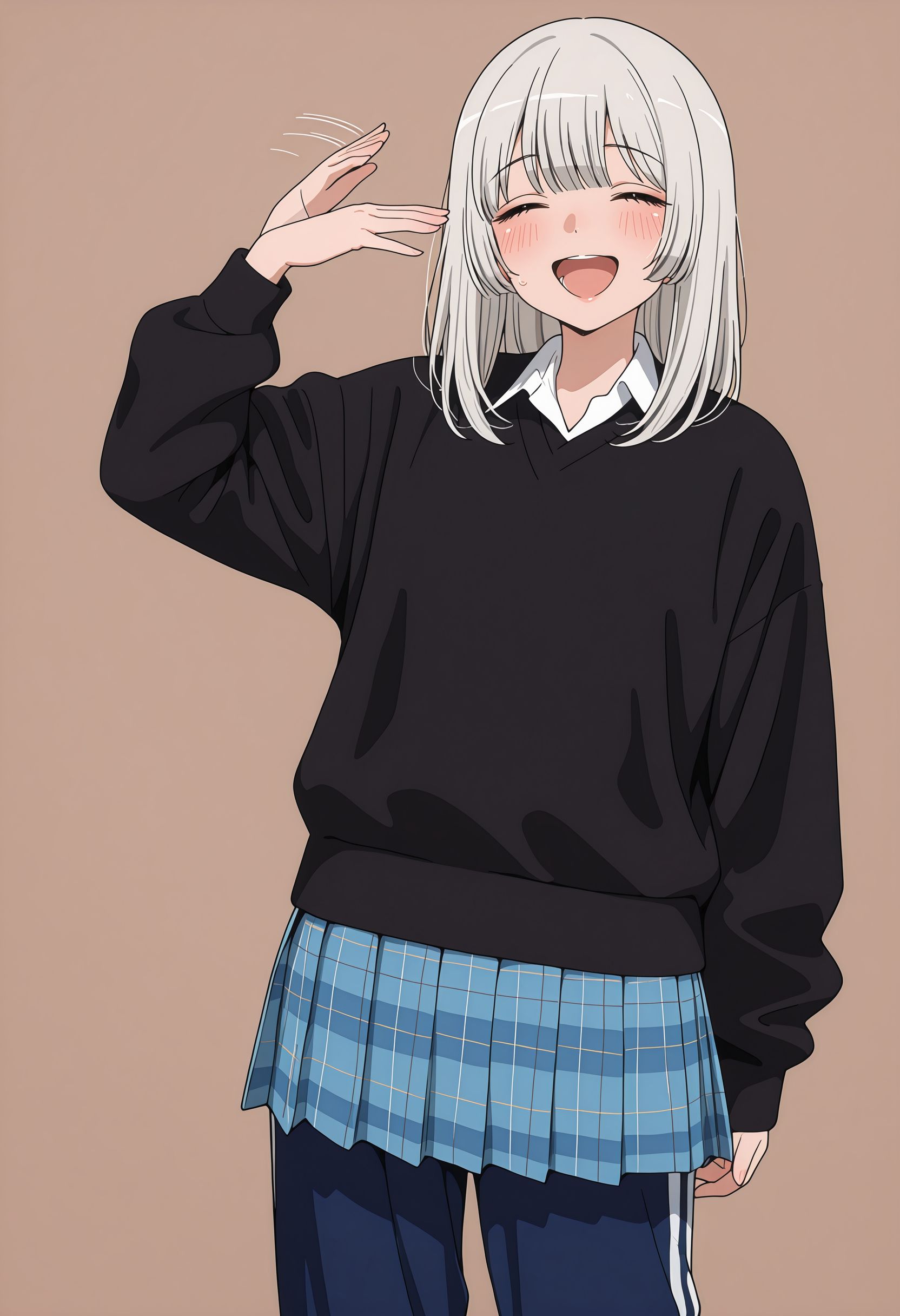 1girl, solo, multicolored hair grey hair, long hair, collared shirt, white shirt, black sweater, pleated skirt, plaid skirt, blue skirt, short skirt, pants under skirt, blue pants, track pants, black nails,