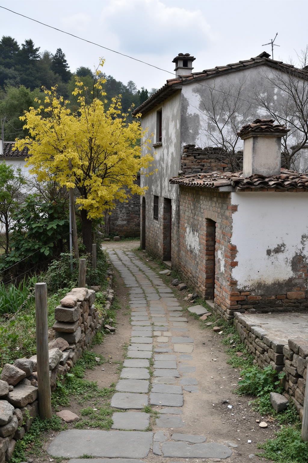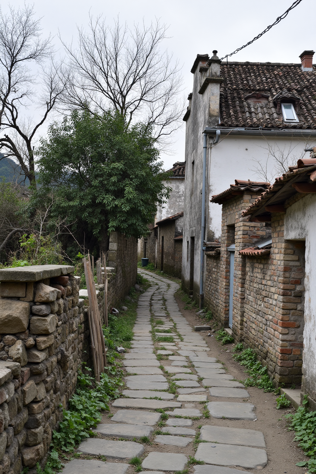 Show the rural village scene, dilapidated homes, winding stone - paved roads, trees with sparse leaves, a melancholic rural allure.