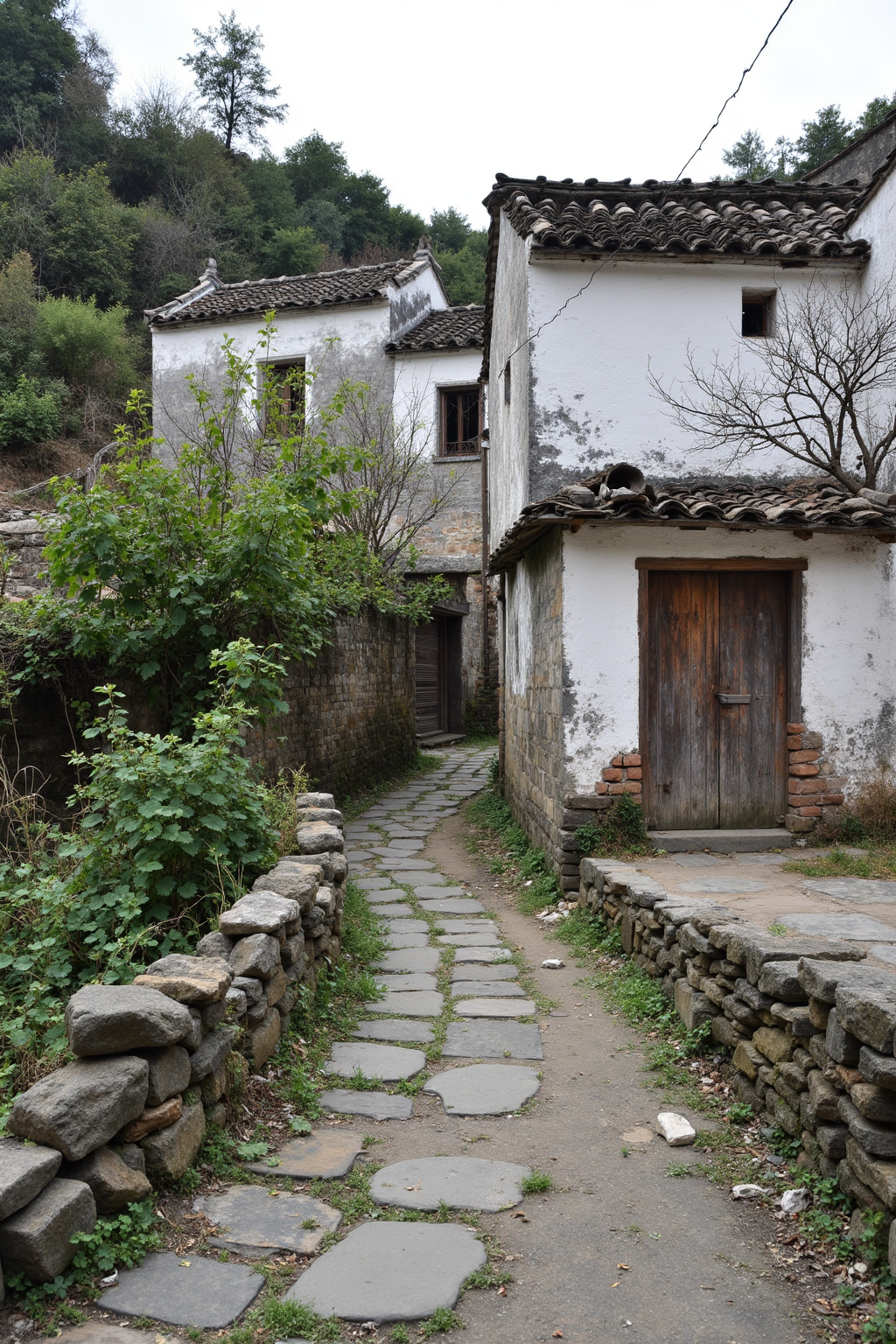 Show the rural village scene, ancient white - walled houses, winding stone paths, overgrown vegetation, a touch of tranquil decay in autumn.